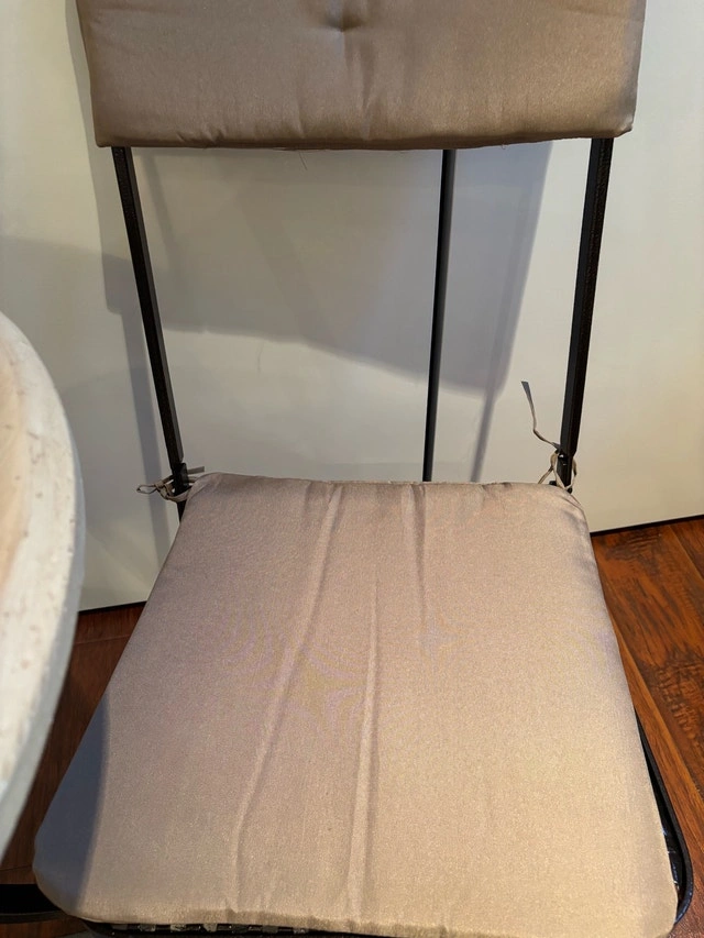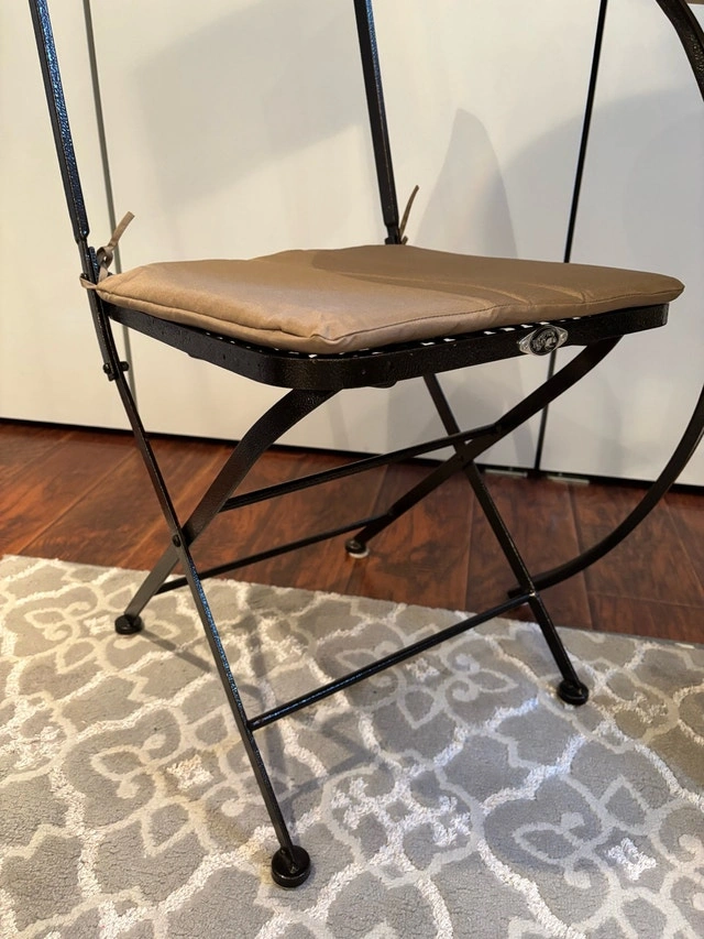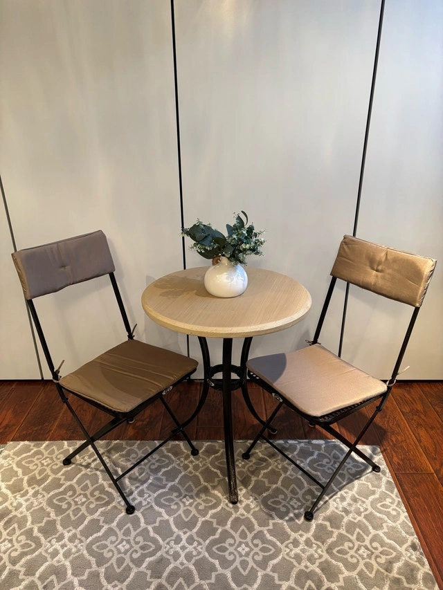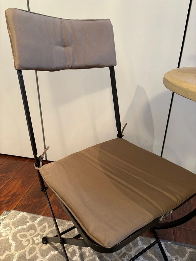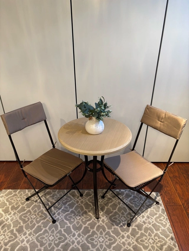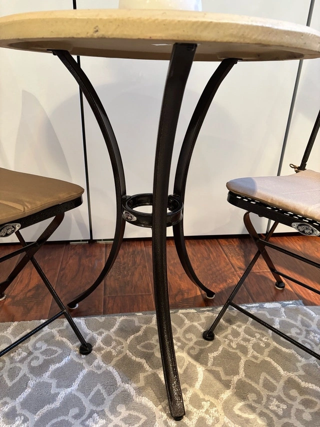 A charming 3-piece bistro set featuring a round beveled edge simulated wood table with a metal base and two collapsible chairs with seat and back cushions. Designed for small spaces, the chairs fold easily for convenient storage while offering comfortable, sturdy seating—perfect for patios, balconies, or cozy outdoor corners. It’s ideal for morning coffee, quiet conversations, or evening drinks. Used for staging only, never used outdoors. Keswick Pick Up. Condition: Used - Like new. Payment: Cash accepted.