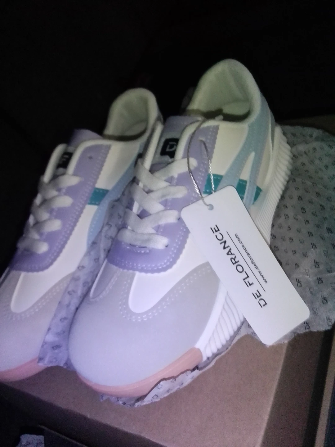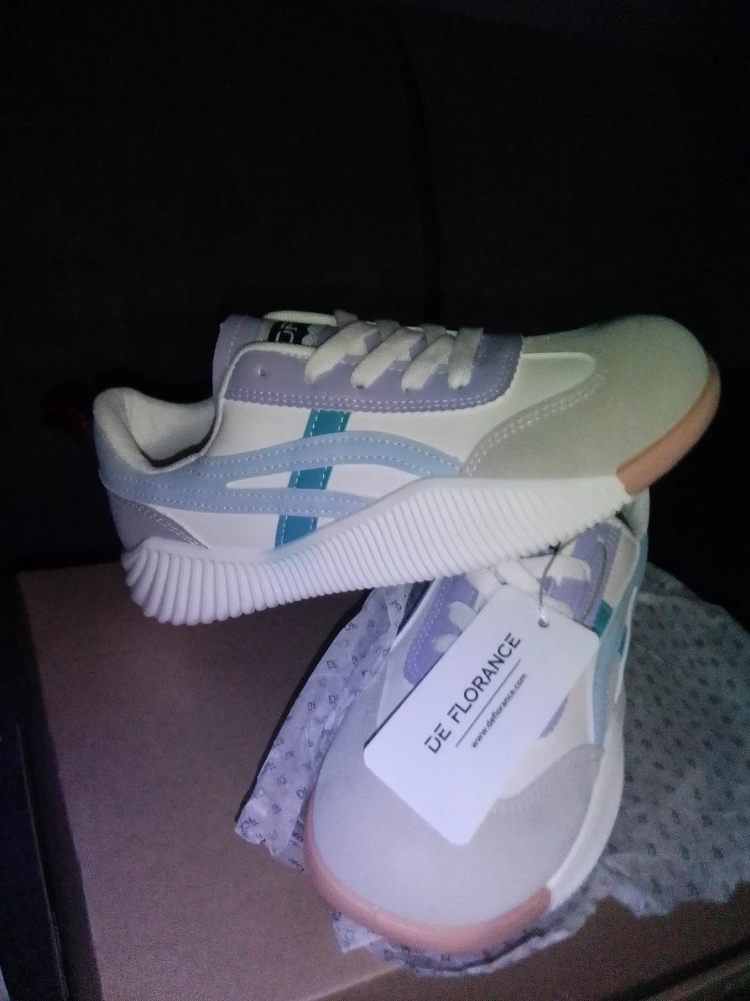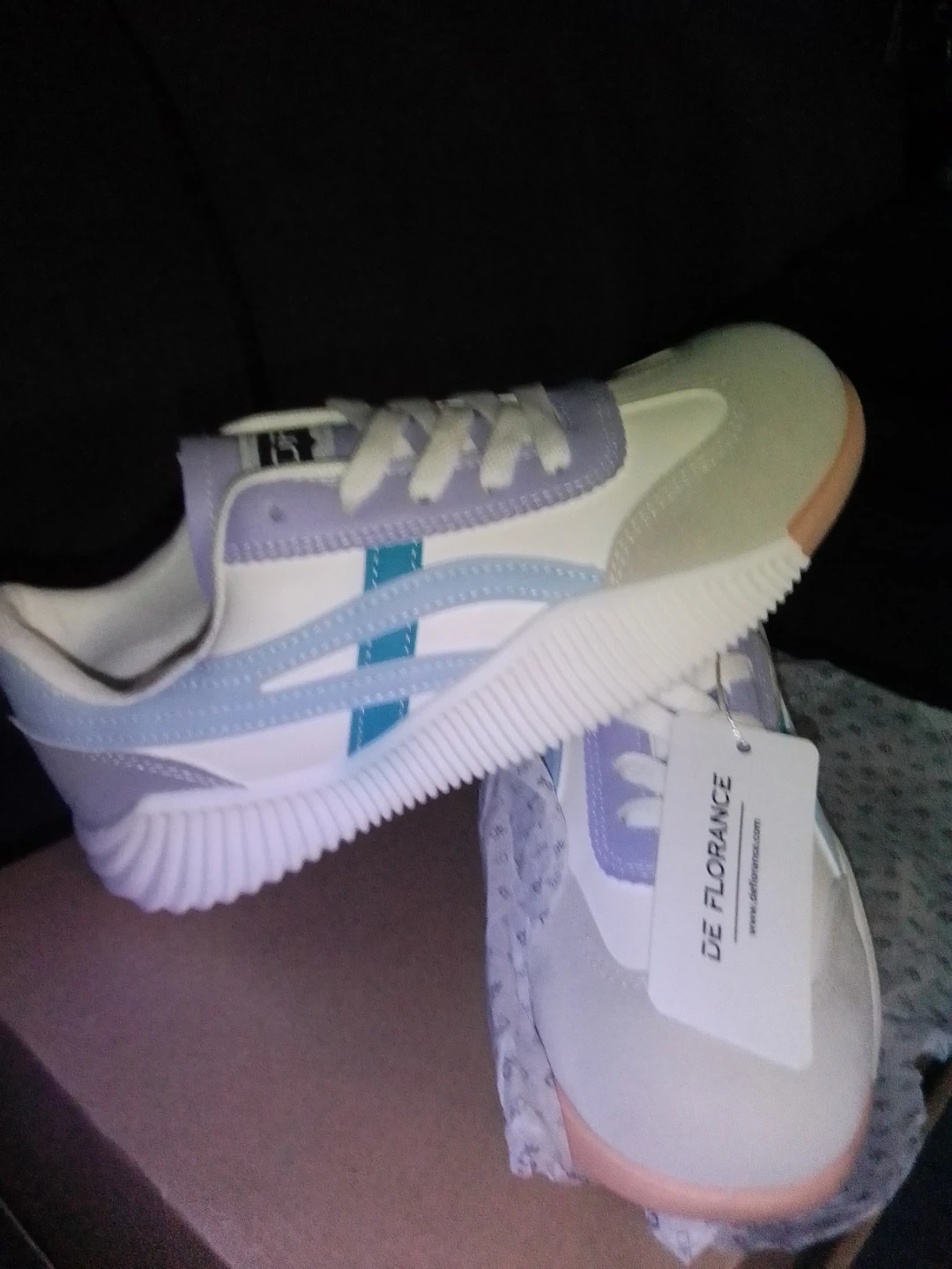 These DE FLORANCE sneakers feature a comfortable lace-up closure. They have a white, purple, and light blue color scheme. Perfect for casual wear! Comfortable for long walks, and/or long shifts at work.