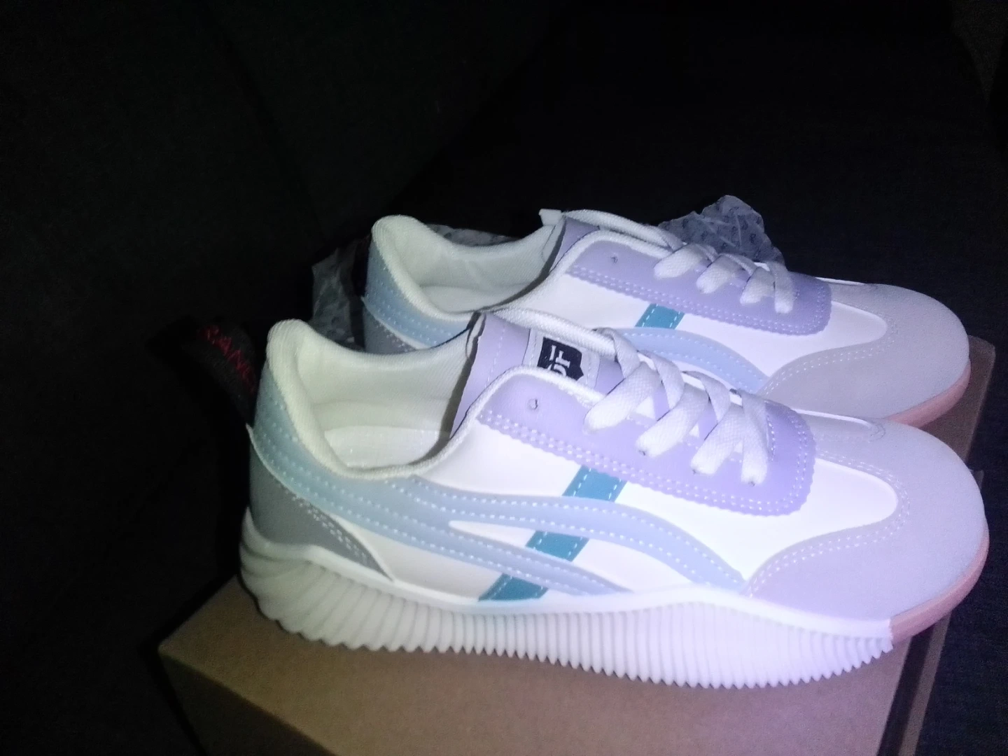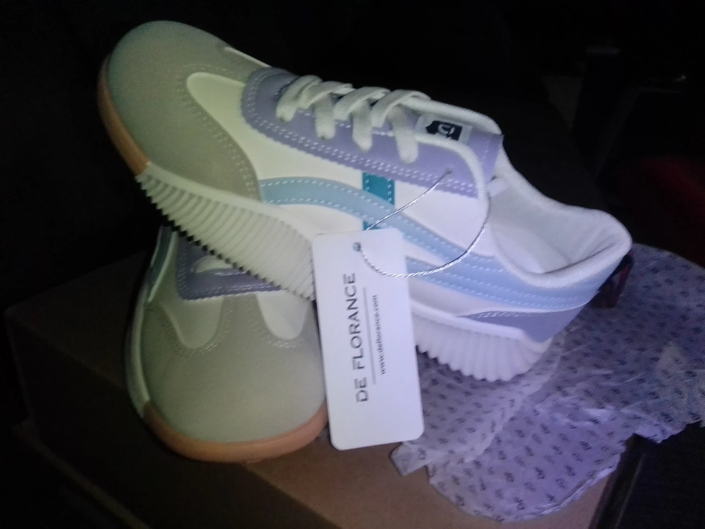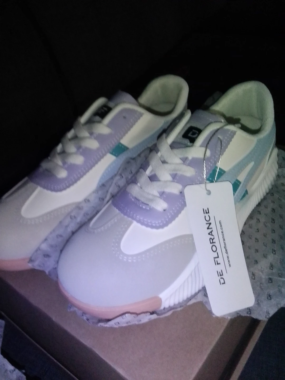 These DE FLORANCE sneakers feature a comfortable lace-up closure. They have a white, purple, and light blue color scheme. Perfect for casual wear! Comfortable for long walks, and/or long shifts at work.