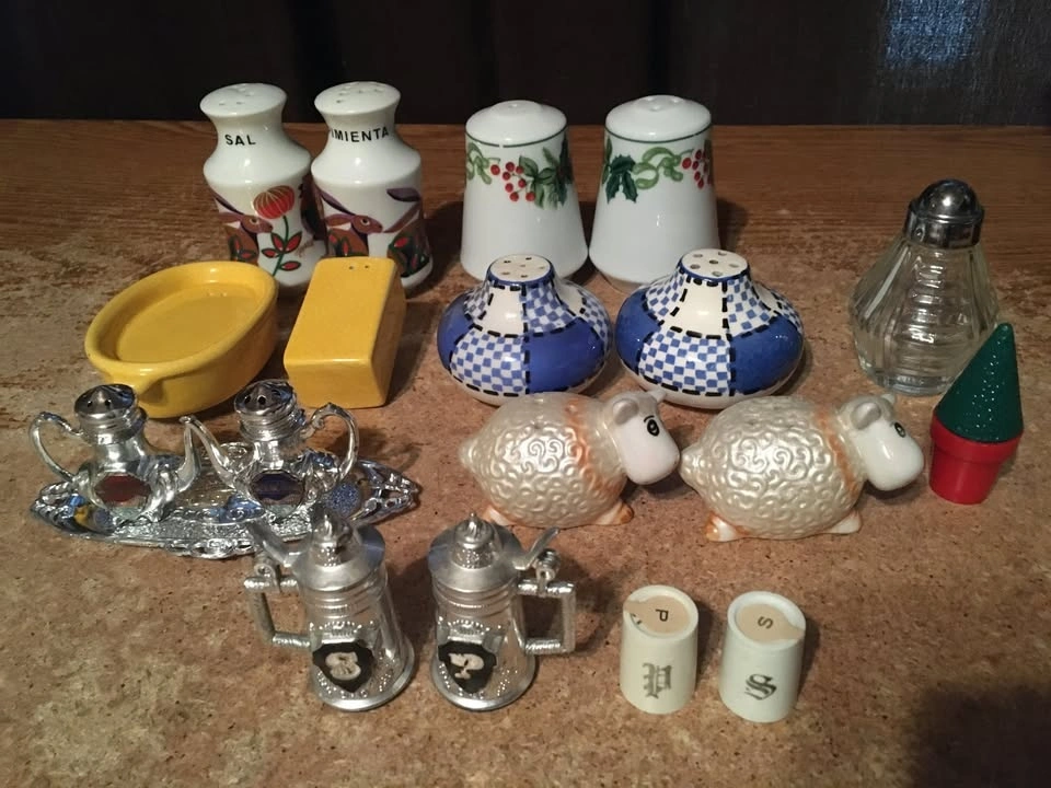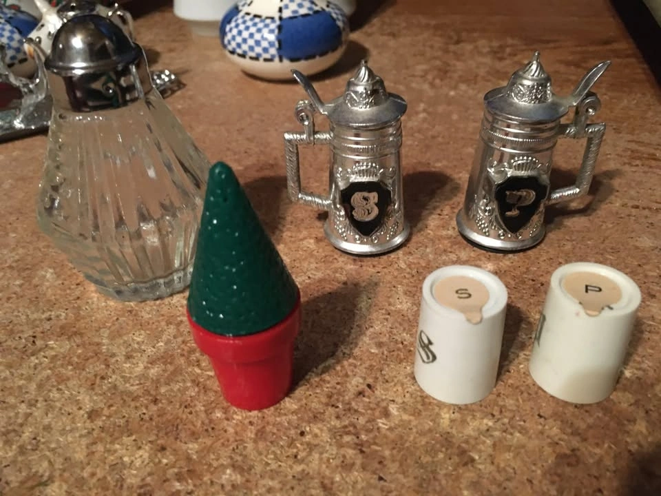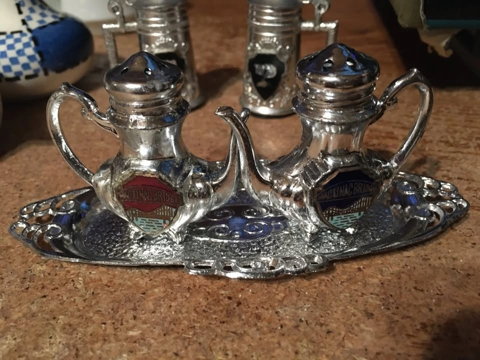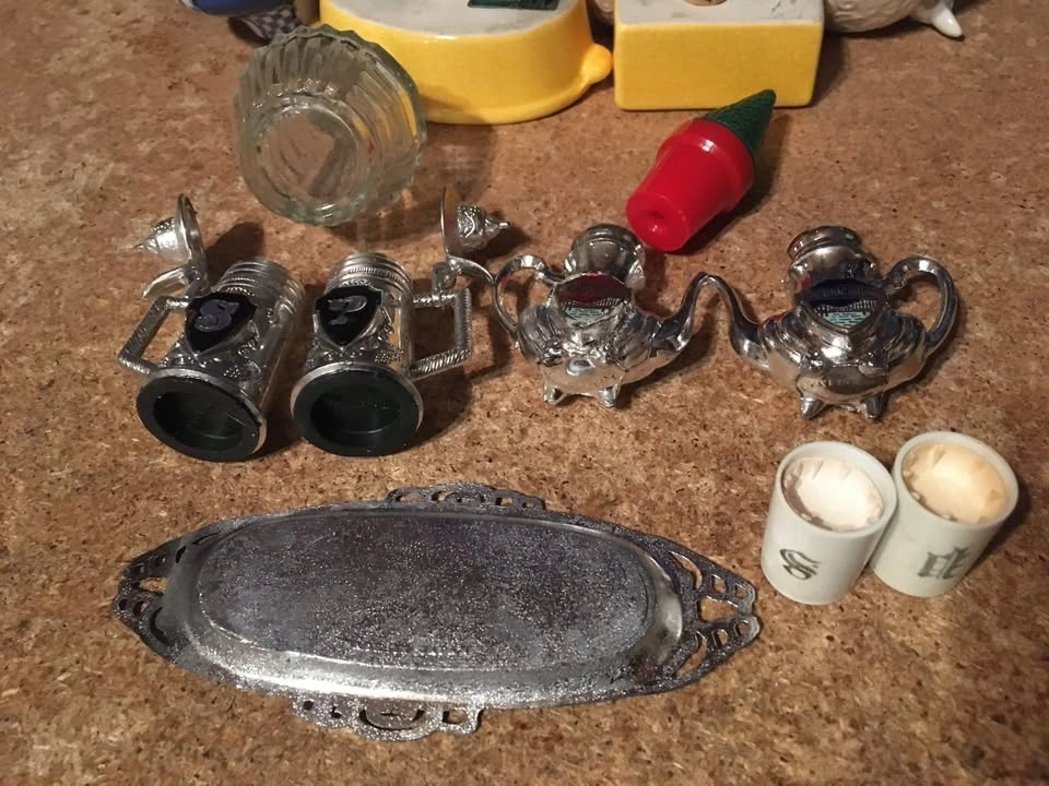 Selling a collection of 8 sets and two single salt and pepper shakers, plus a Mackinac Bridge tea set with tray. Includes Spanish themed shakers (rabbit, rooster), a sheep set, a bathtub and soap set from Eureka Springs Arkansas, and a ceramic Christmas set with mistletoe and holly. Also included is a MCM blue and white checkered set (only one has a stopper, lines are not cracks) and a clear ribbed Christmas tree set. One piece of the tea set has a red sign that was glued on.