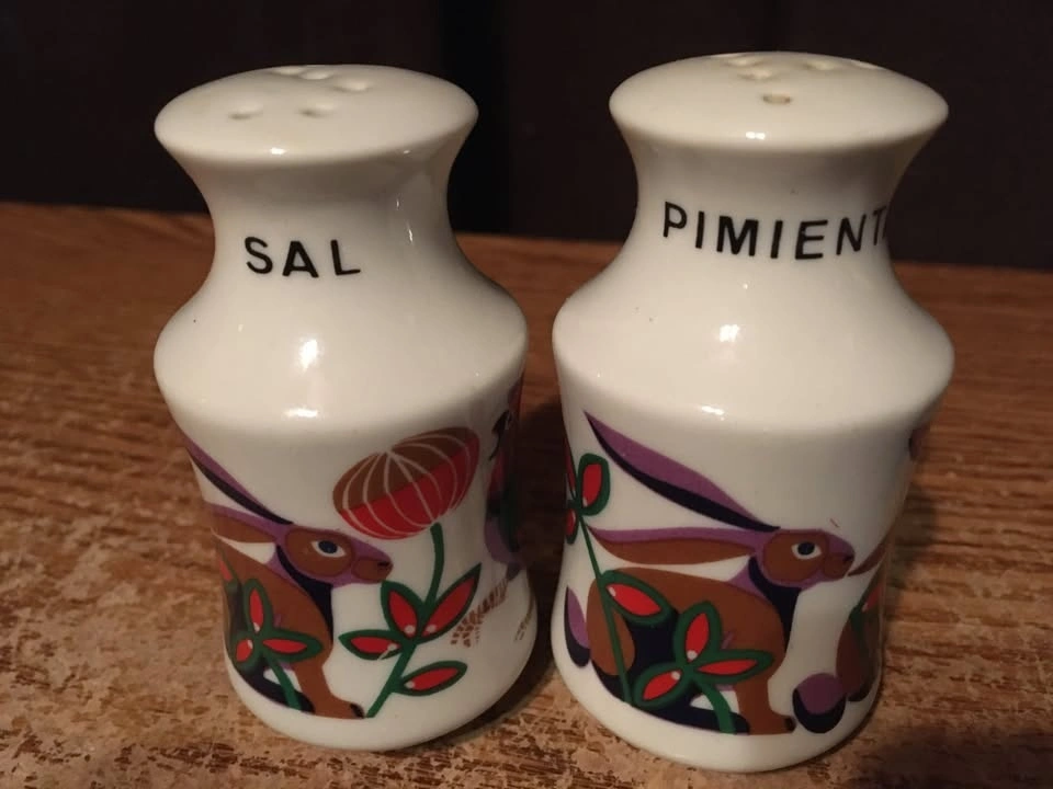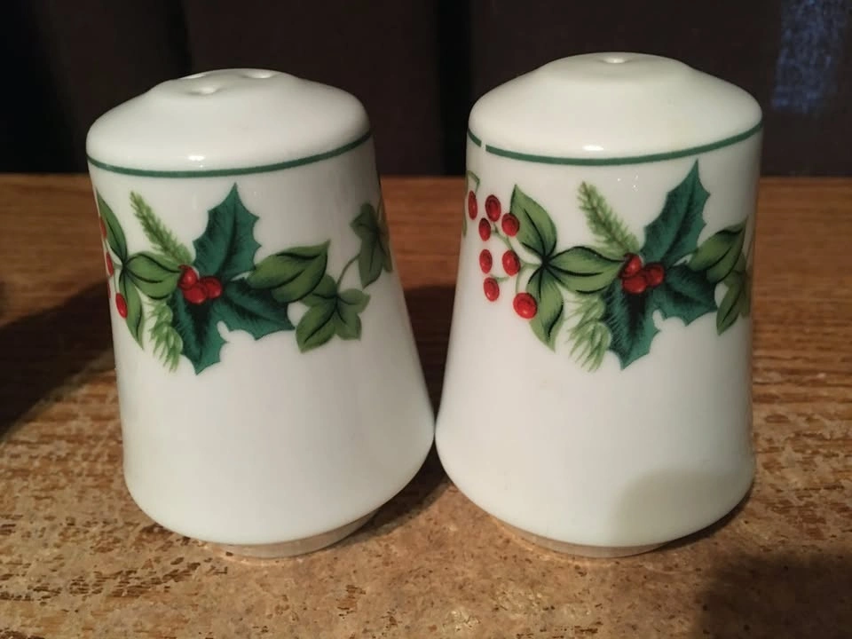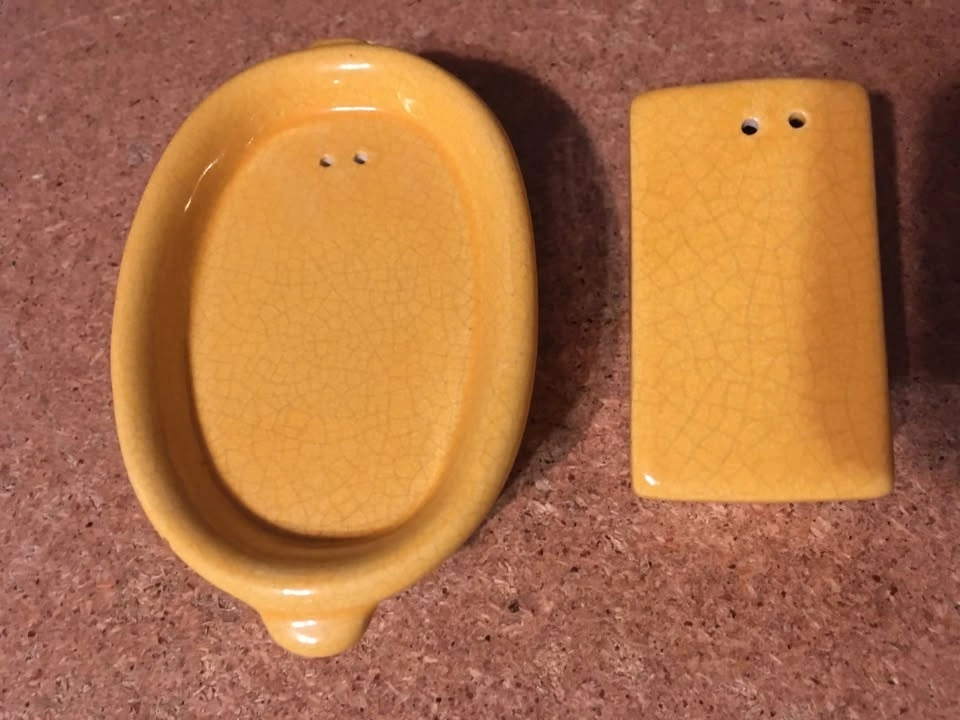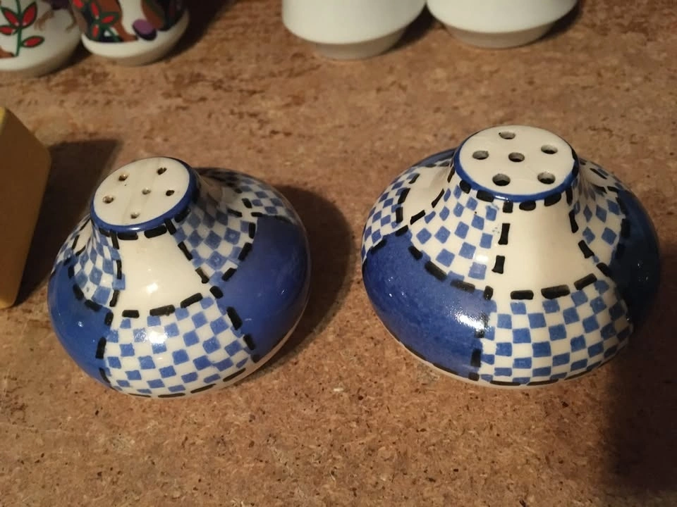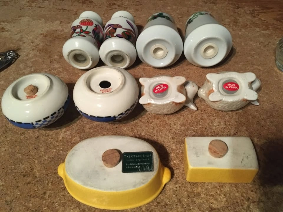 Selling a collection of 8 sets and two single salt and pepper shakers, plus a Mackinac Bridge tea set with tray. Includes Spanish themed shakers (rabbit, rooster), a sheep set, a bathtub and soap set from Eureka Springs Arkansas, and a ceramic Christmas set with mistletoe and holly. Also included is a MCM blue and white checkered set (only one has a stopper, lines are not cracks) and a clear ribbed Christmas tree set. One piece of the tea set has a red sign that was glued on.