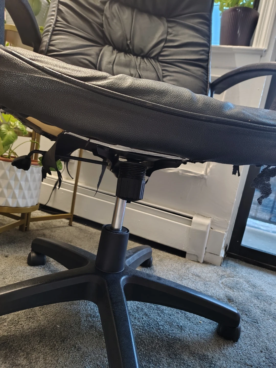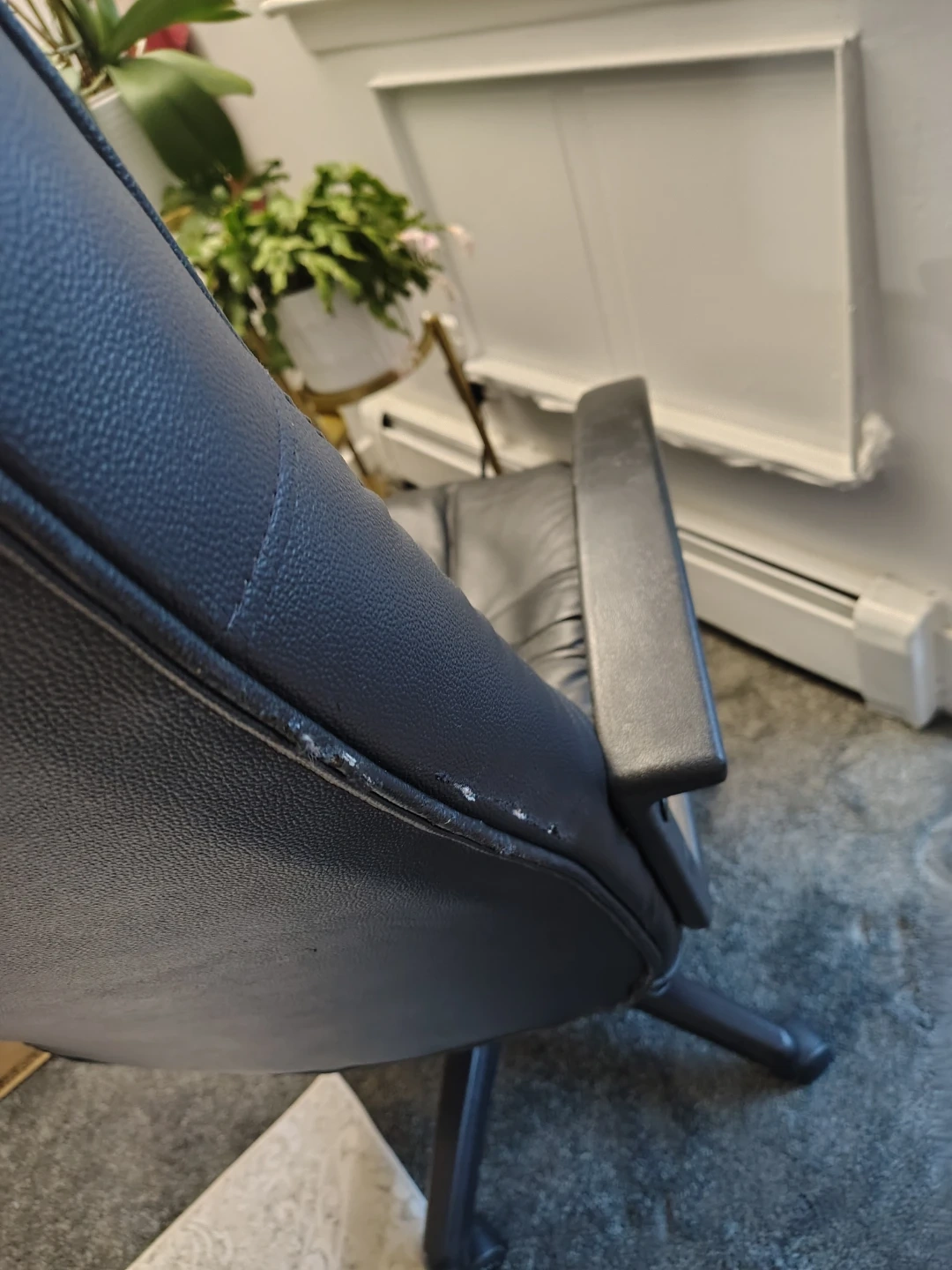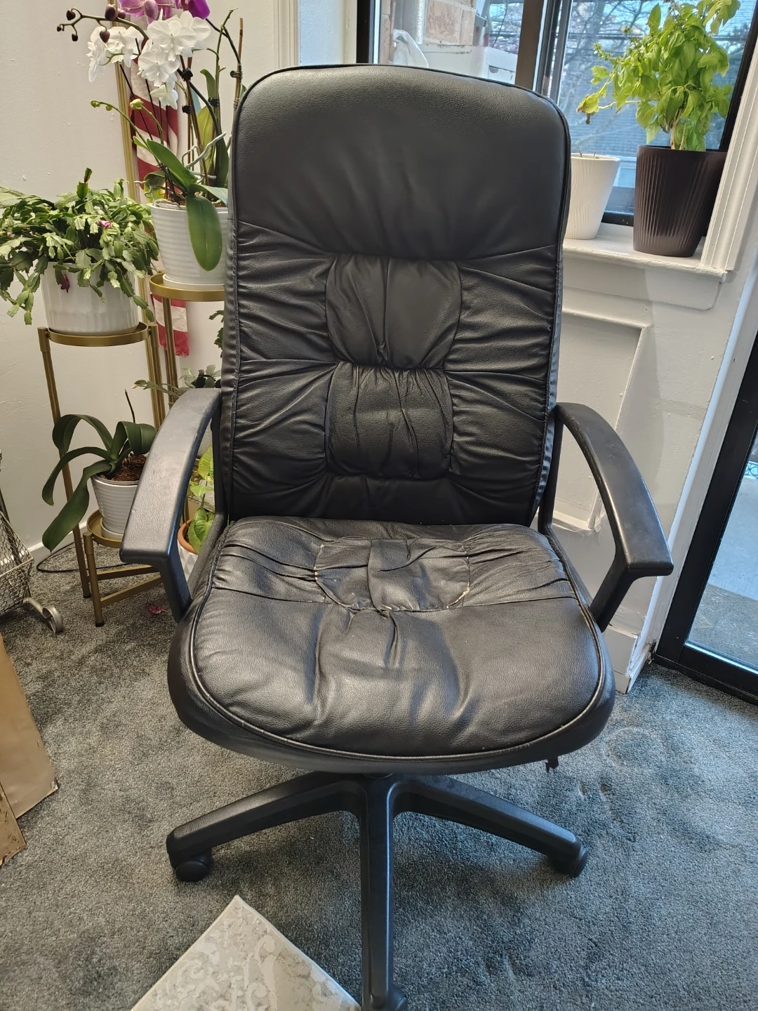Computer chair in generally fair to good condition, time to part with it due to move. At times it needs adjustment as it lowers by itself. Lubrication WD-40 helps to prevent that. Still has plenty of usage to offer.