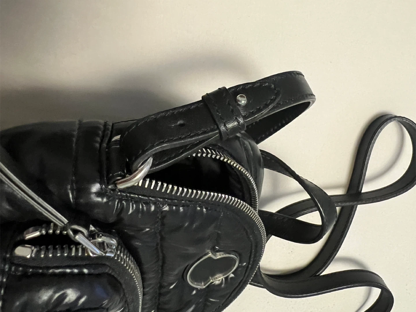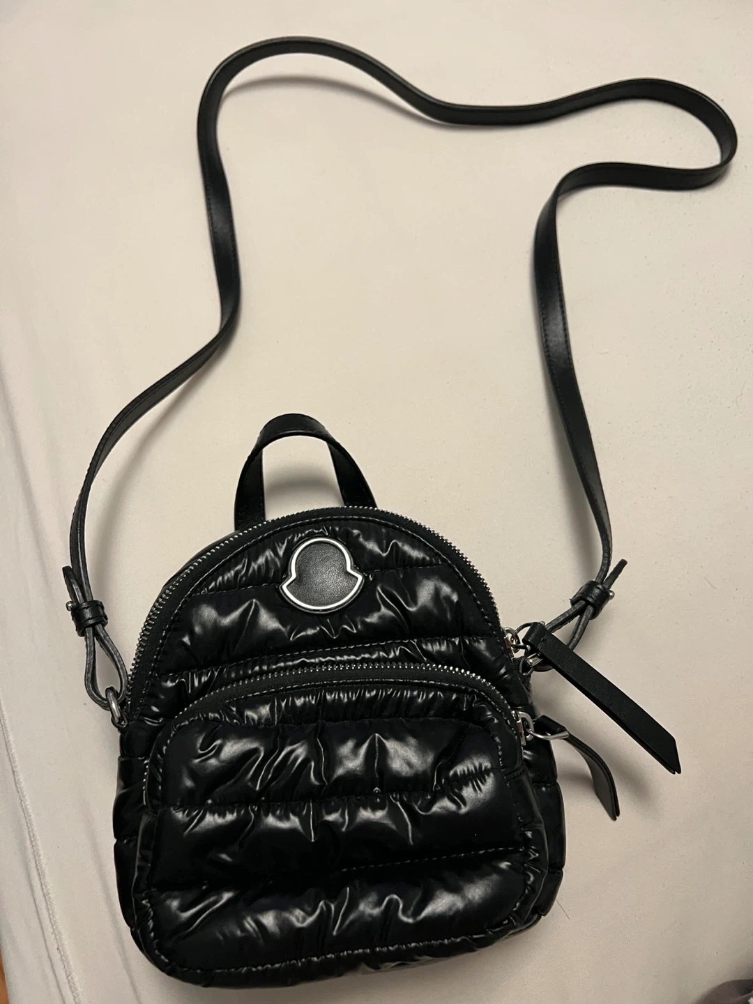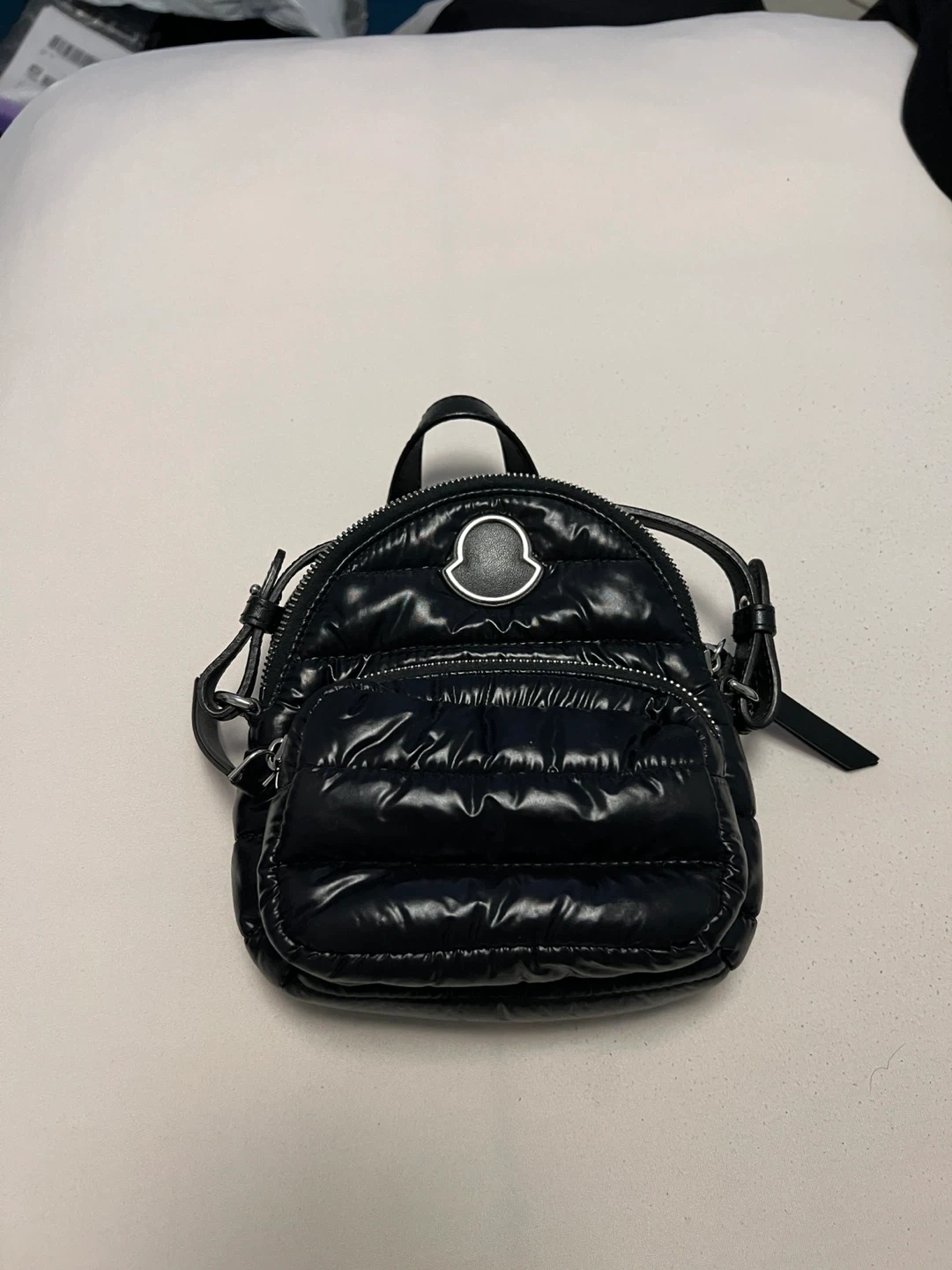 Stylish Moncler mini kilia backpack! It's a chic and compact way to carry your essentials for the fall/winter season. The quilted design gives it a unique look for a cross body purse. The black colour makes it super versatile and easy to maintain. Perfect for adding a touch of luxury to any outfit!
