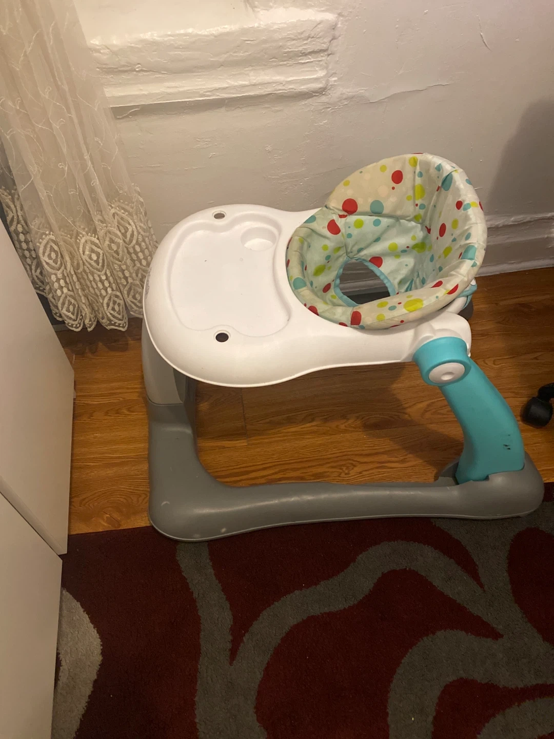 Selling a baby walker in good condition! It features a colorful seat with a polka dot pattern and a white tray. The base is gray with light blue accents. Perfect for helping your little one take their first steps!