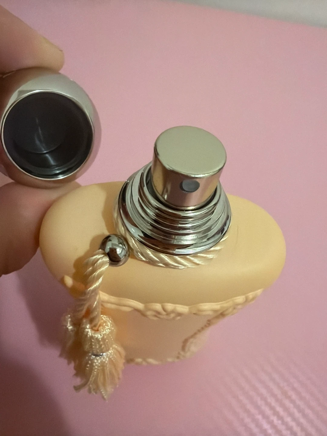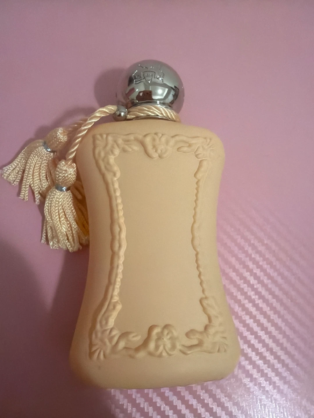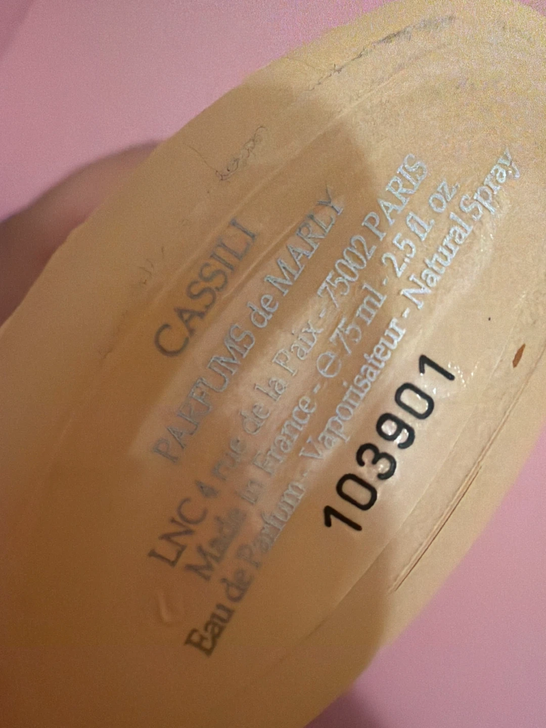 This is a bottle of Parfums de Marly Cassili Eau de Parfum. It's a 75 ml (2.5 fl. oz.) natural spray made in France. The bottle has a decorative design with tassels.