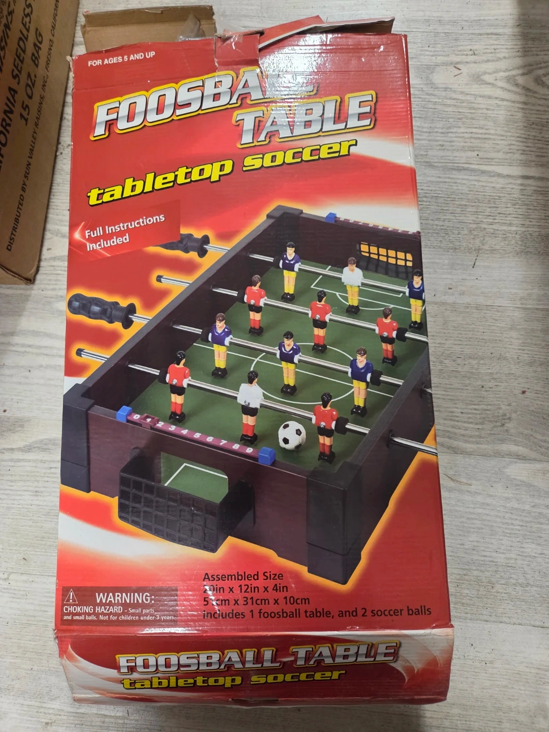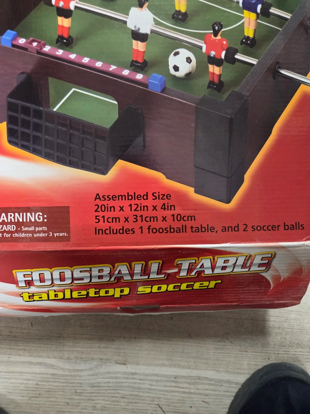 This is a tabletop foosball soccer game. Assembled size is 20in x 12in x 4in. Includes 1 foosball table and 2 soccer balls. Full instructions are included.