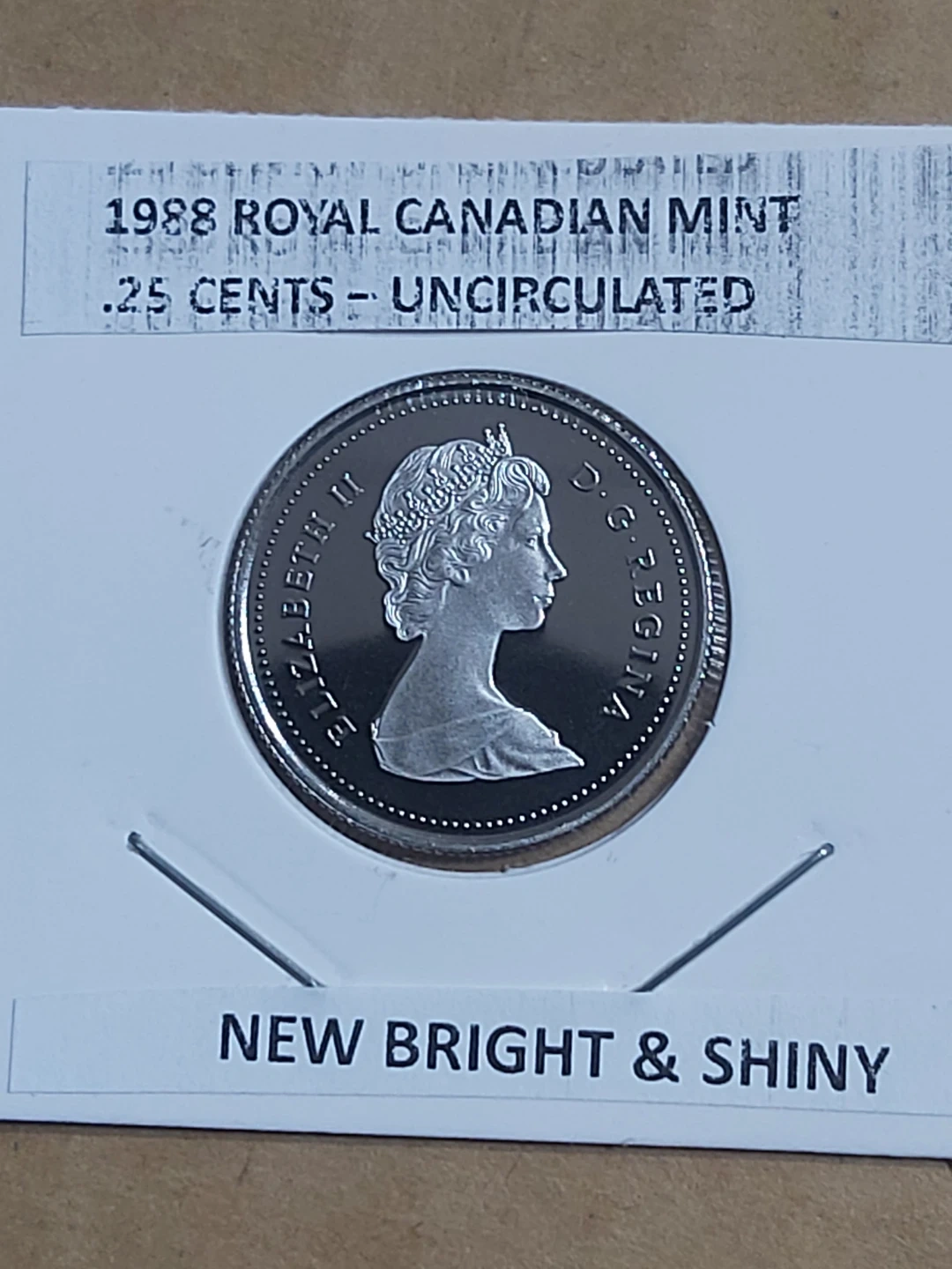 This is a 1988 uncirculated quarter from the Royal Canadian Mint. It's a coin with a caribou on one side and Queen Elizabeth II on the other. It's described as new, bright, and shiny. This coin is great for collectors!