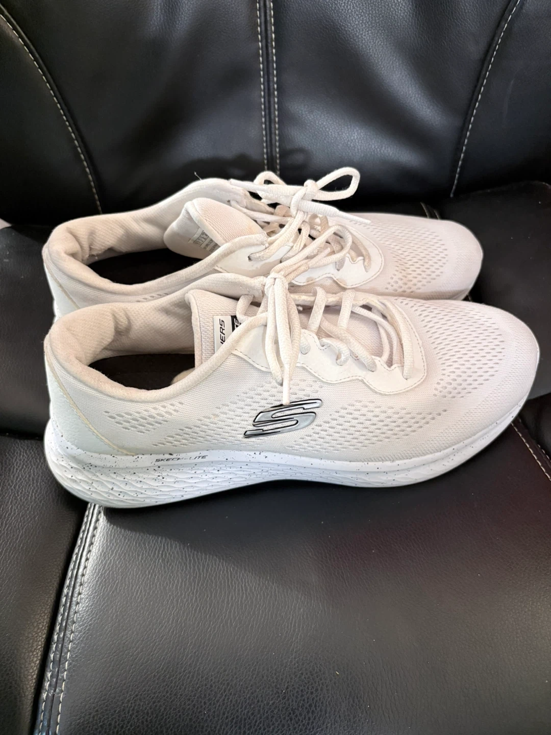 These Skechers sneakers are white with a breathable mesh upper. They feature a flexible sole with subtle speckled detailing. Perfect for everyday wear or light activity!