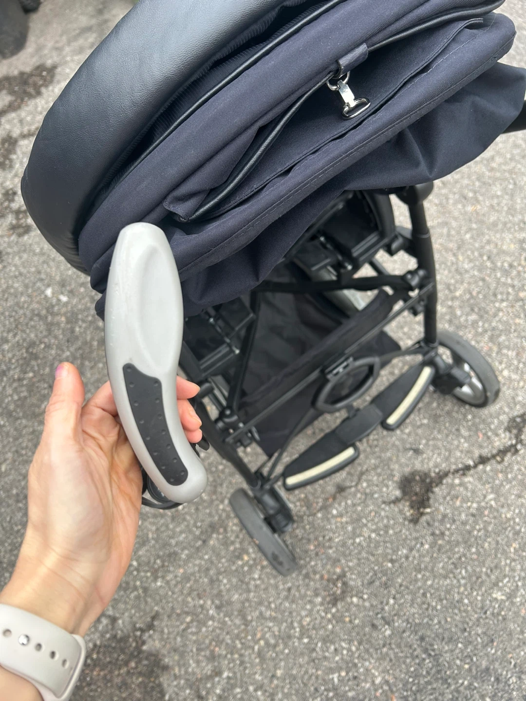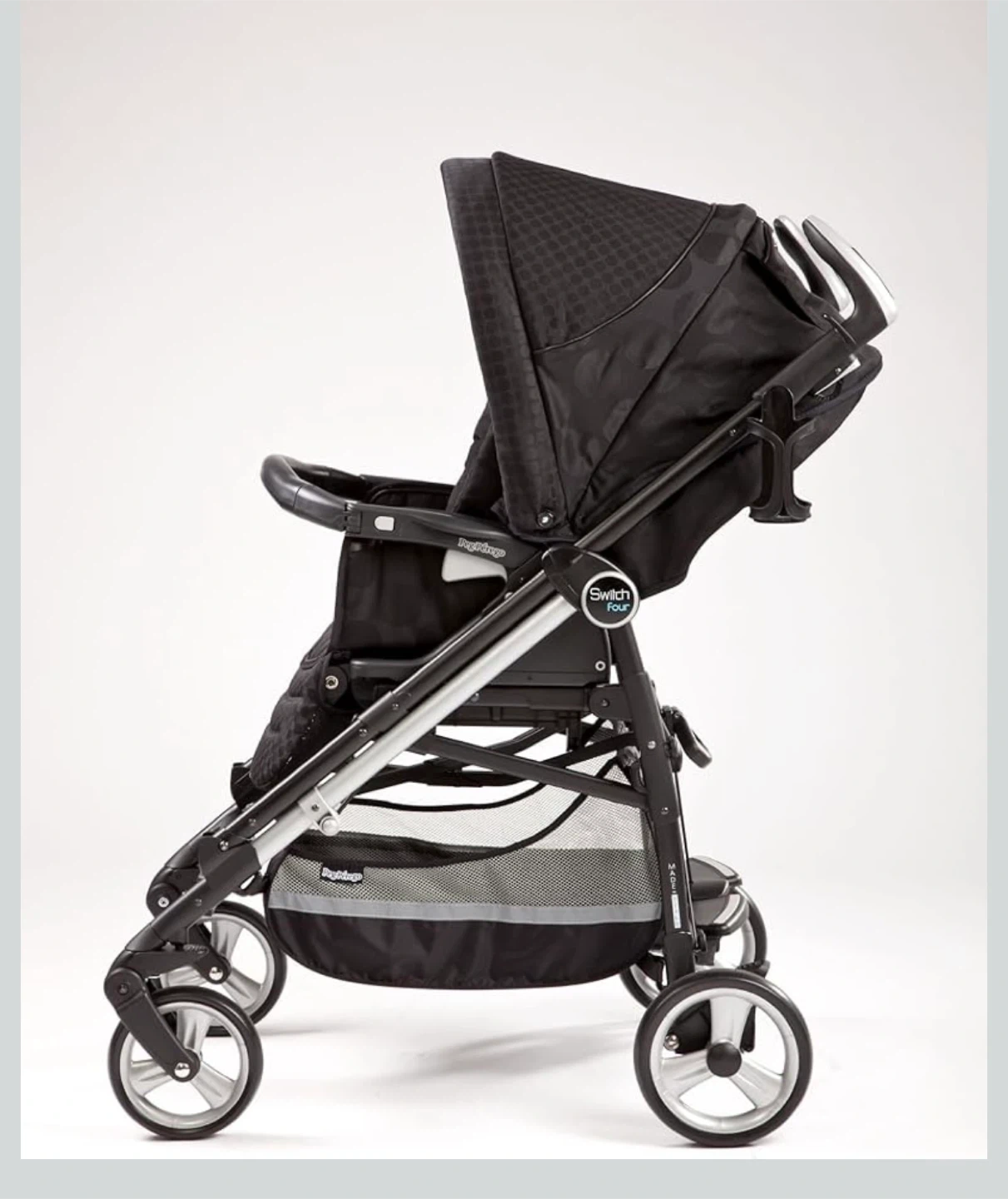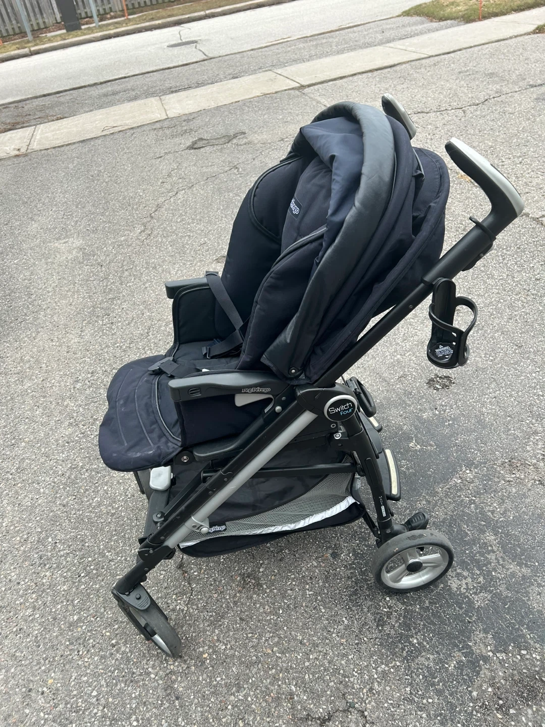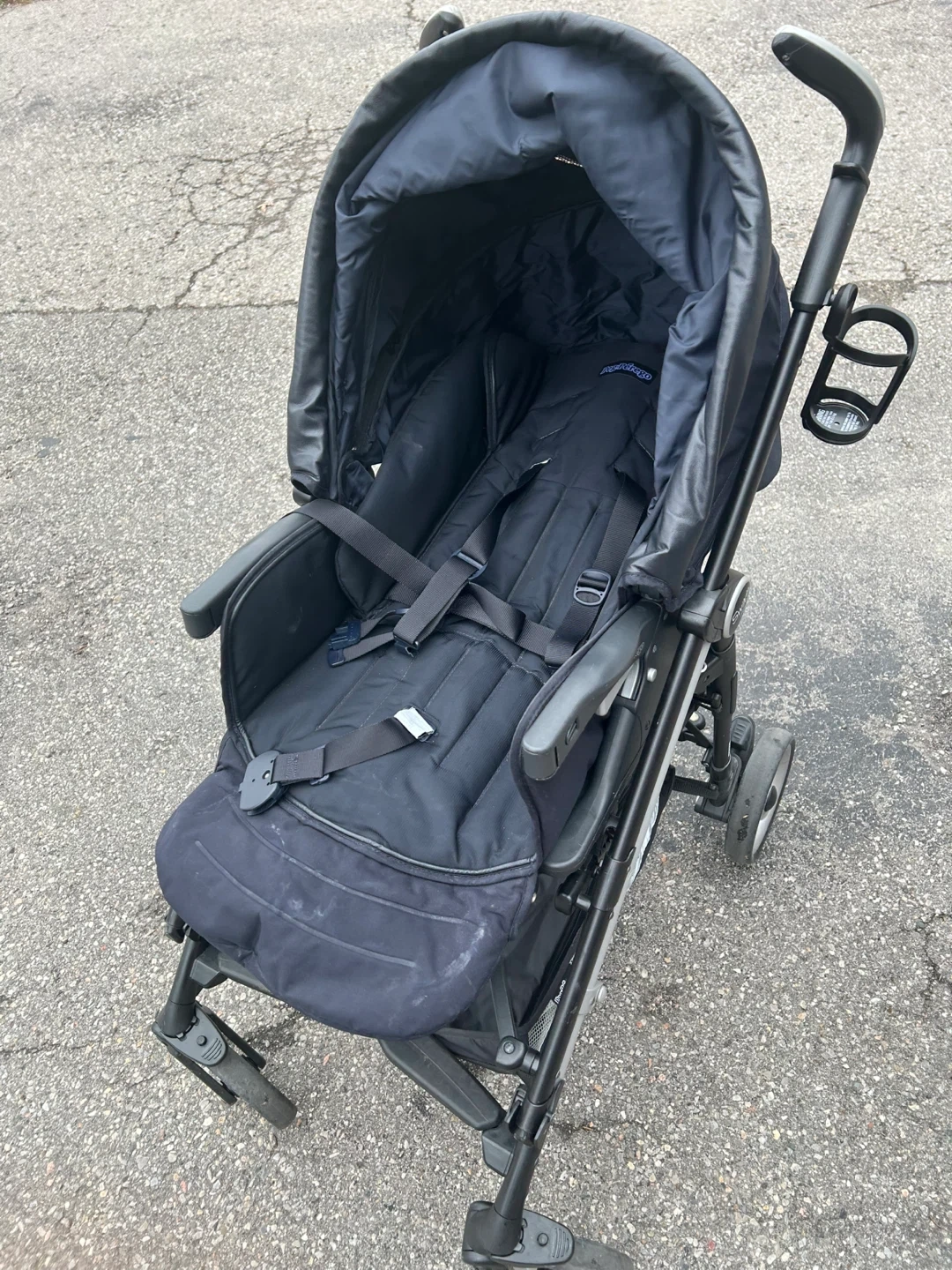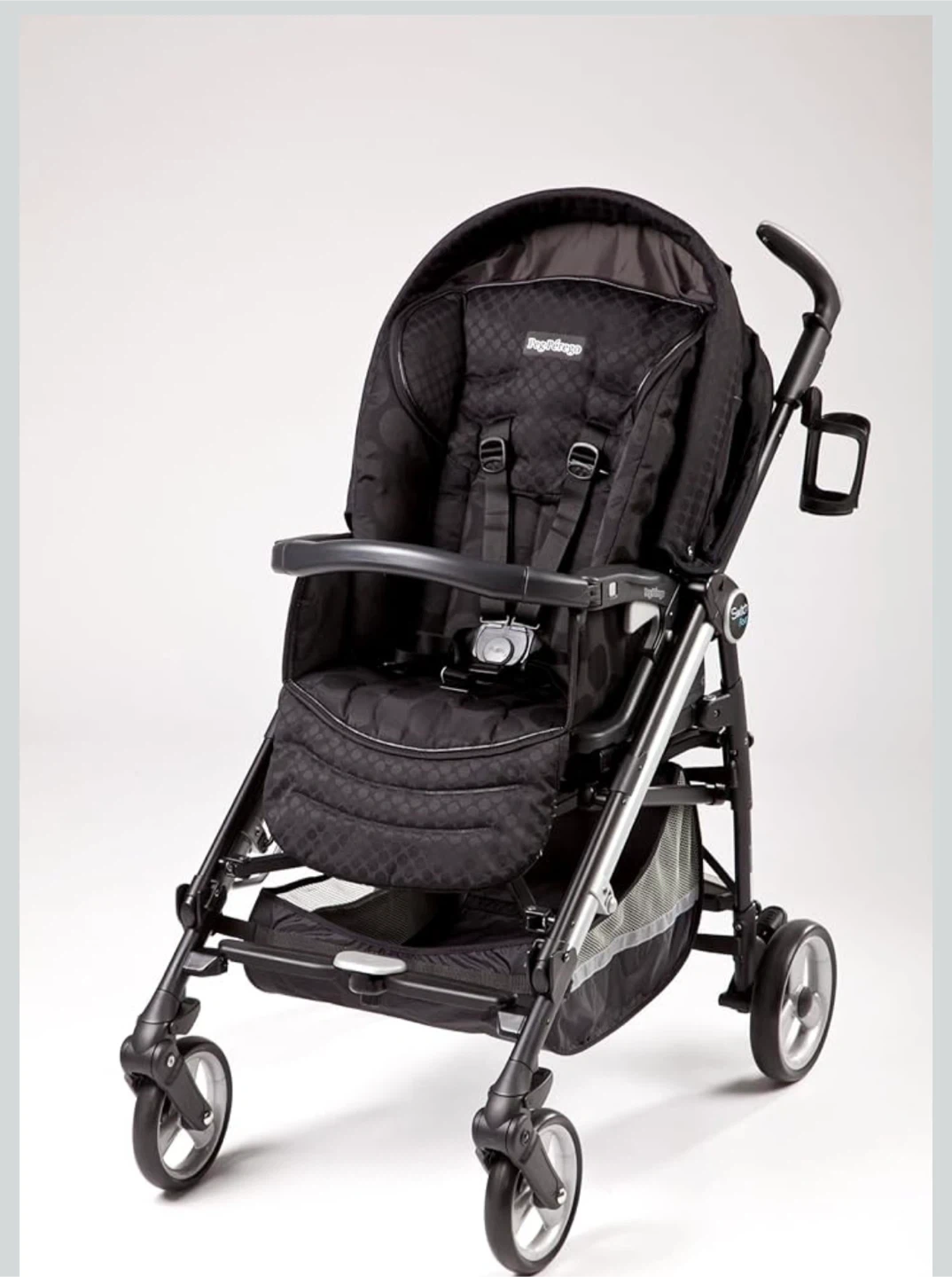 Black Peg Perego stroller with a reversible seat. It's a great option for on-the-go families! Includes a cup holder and a spacious storage basket underneath.