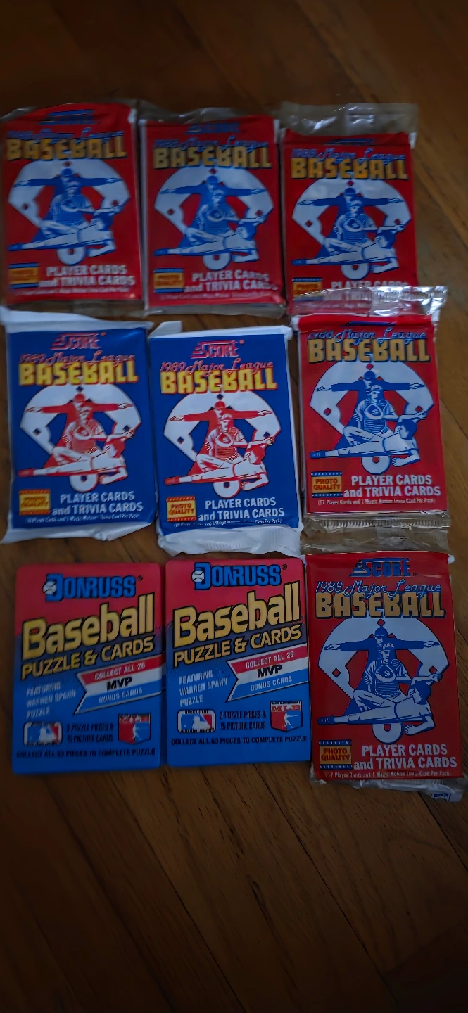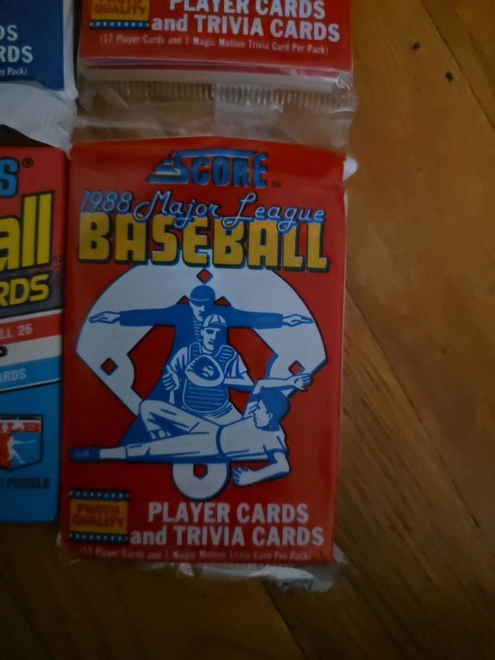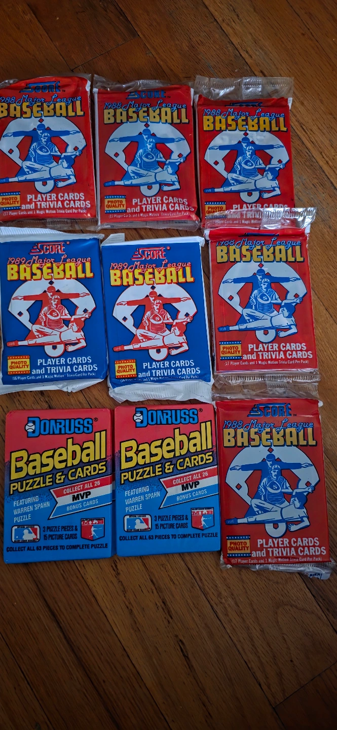 Lot of unopened 1988 baseball card packs. Includes Score and Donruss brands. Player cards and trivia cards included. Some packs are puzzles. 9 in total