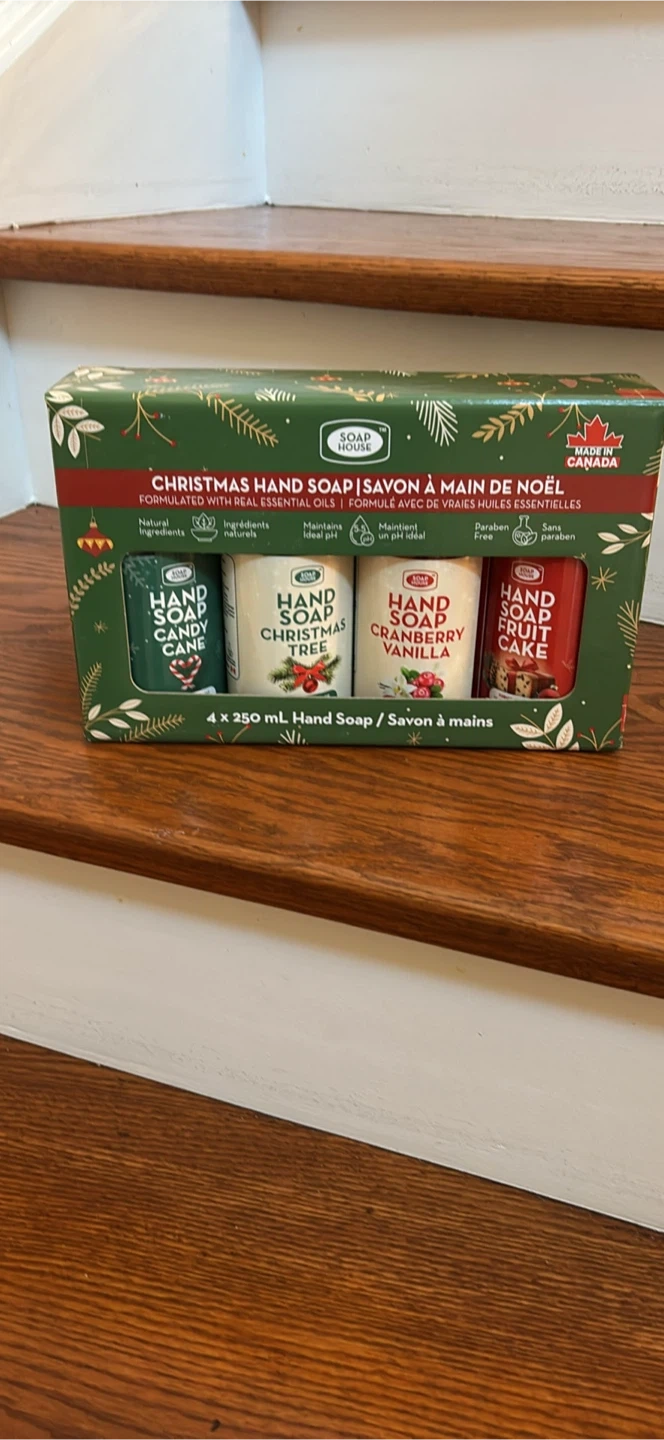 This is a set of four 250 mL hand soaps with Christmas scents. Scents include Candy Cane, Christmas Tree, Cranberry Vanilla, and Fruit Cake.