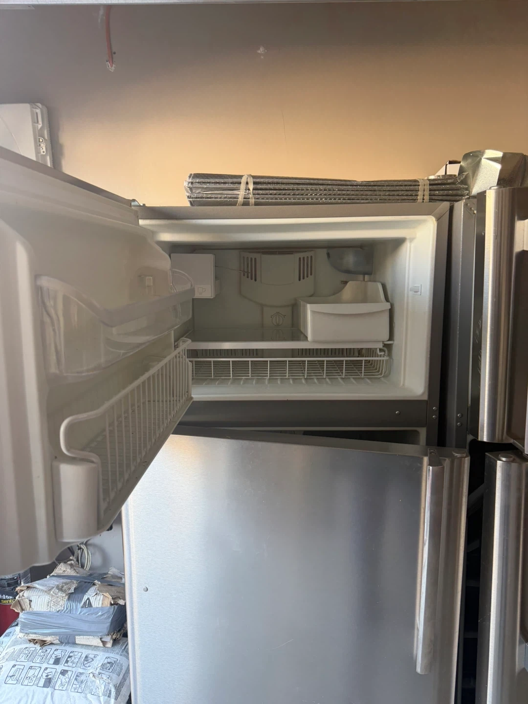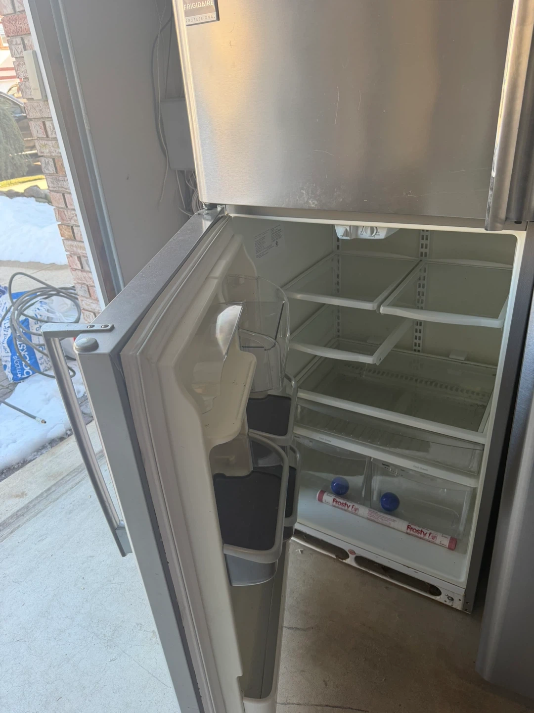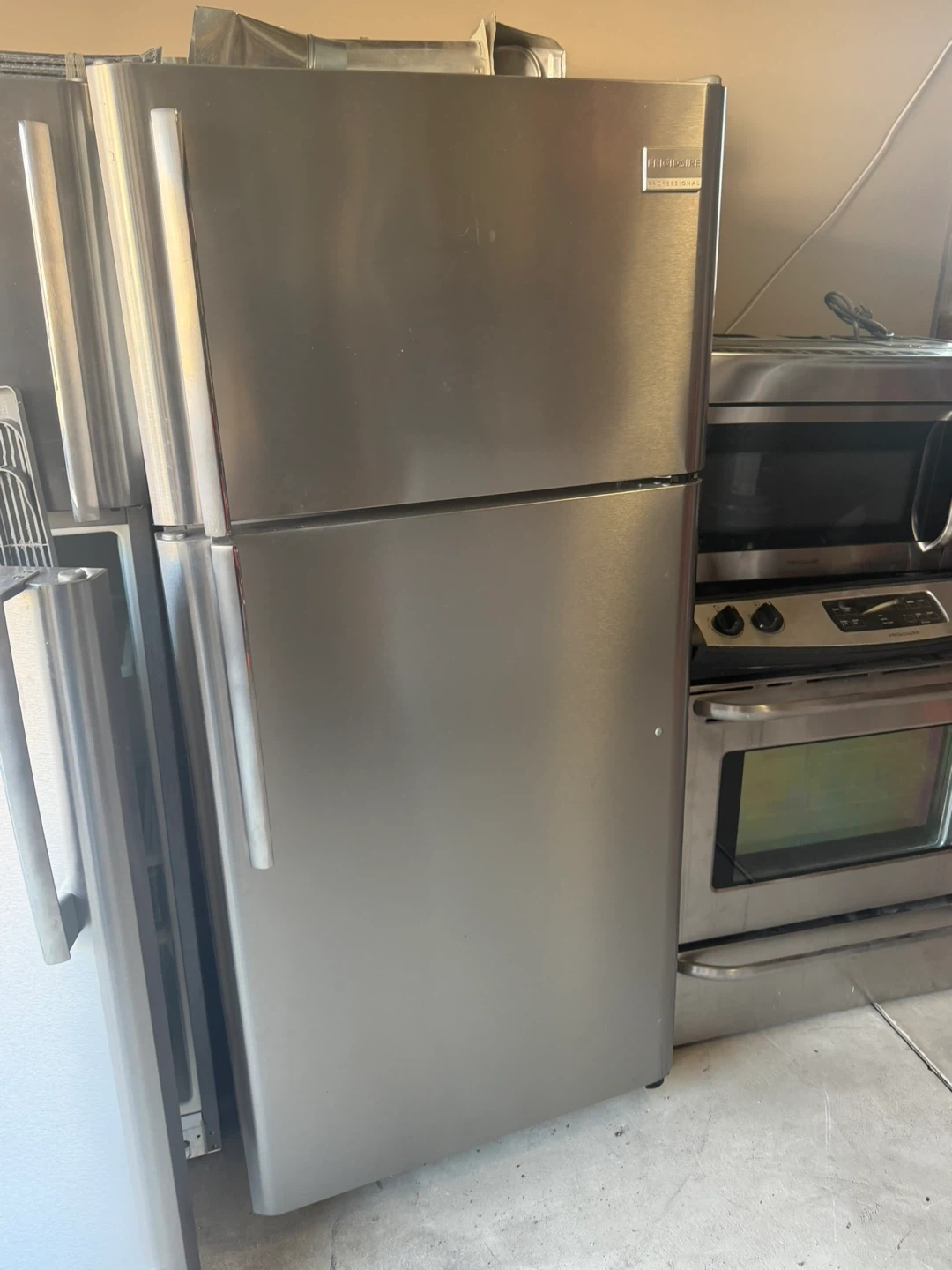 This is a Frigidaire refrigerator with a top freezer. It's stainless steel and has glass shelves. An ice maker is included in the freezer section.