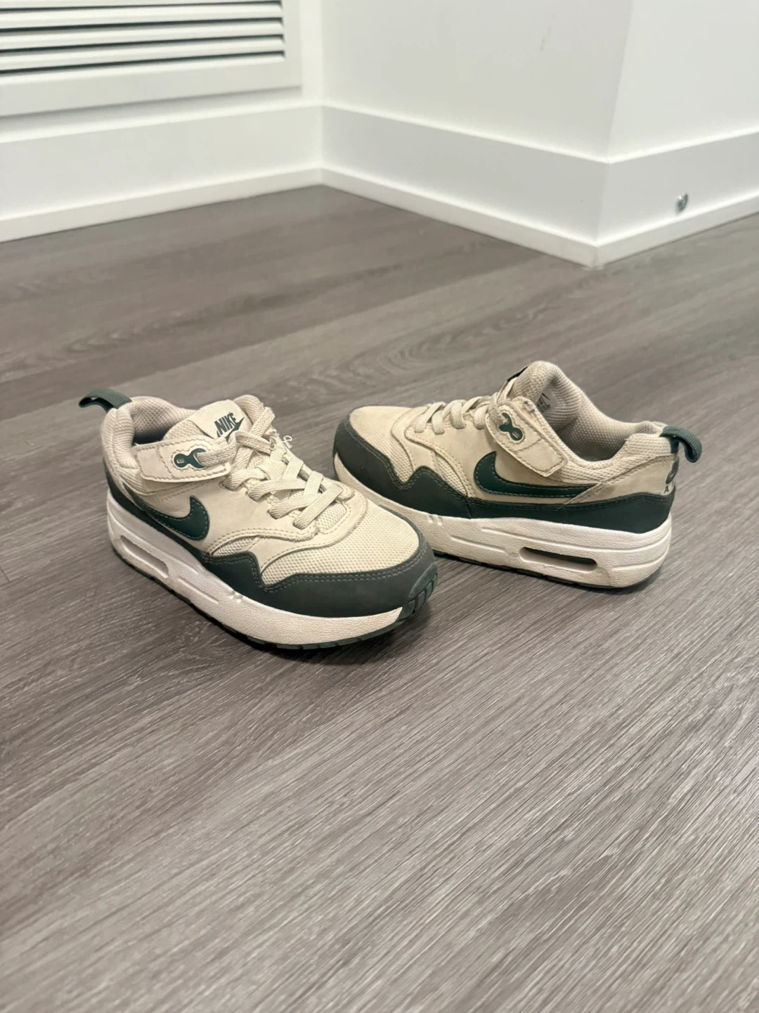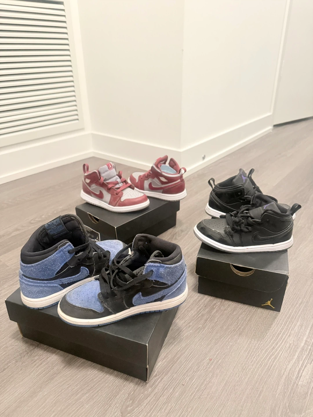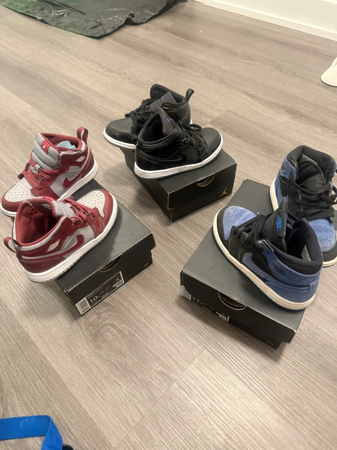 Three pairs of kids' sneakers are available, including two pairs of Nike Air Jordan 1s and one pair of Nike Air Maxs. The Air Jordan 1s come in a blue and black colourway and a red and grey colourway. The Air Maxs are a cream and green colourway. The shoes are in good condition and ready for a new home!