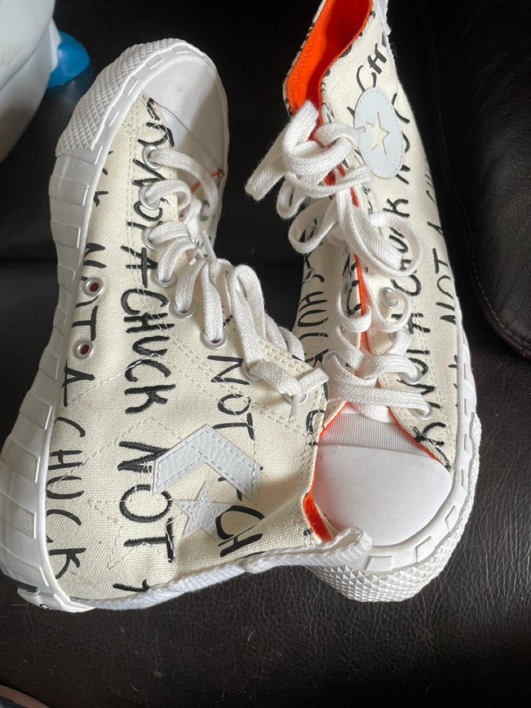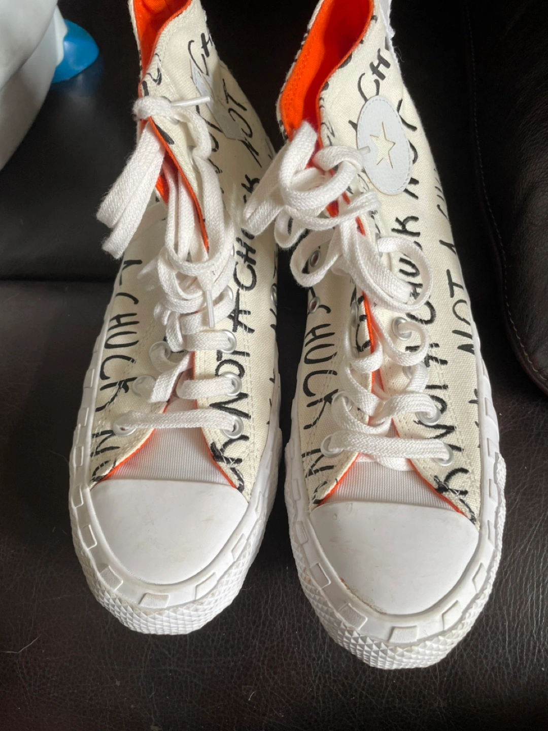 75Cream-colored sneakers with white laces. Orange detailing around the ankles. Black writing across the material. These sneakers would be perfect for a relaxing walk.