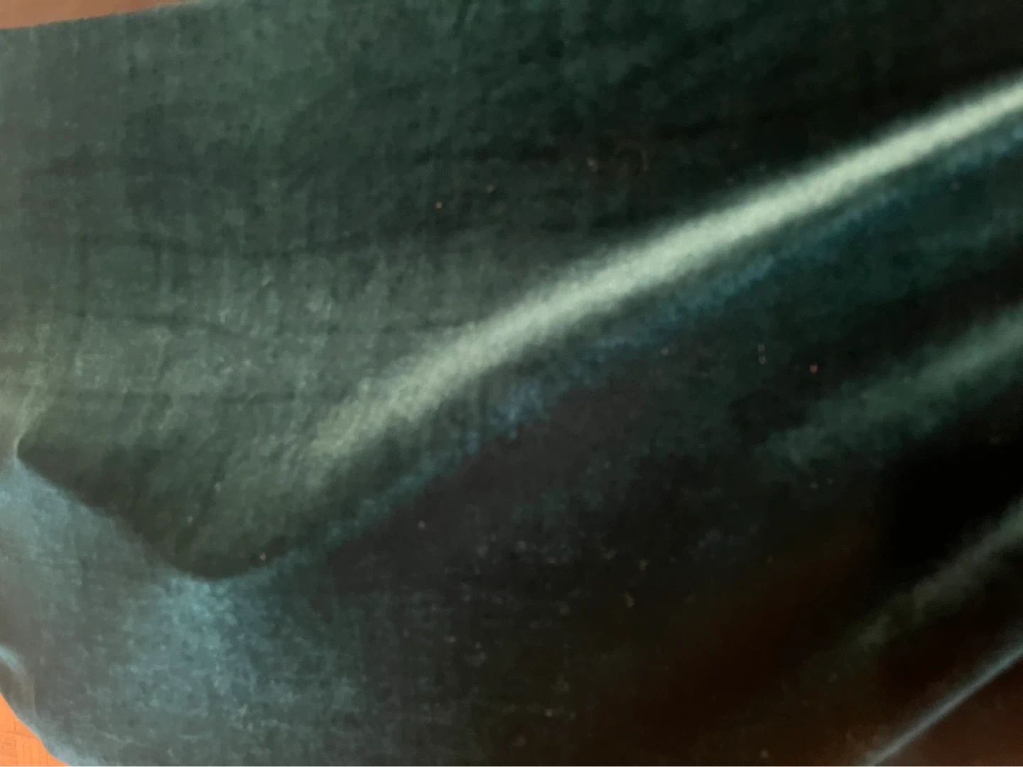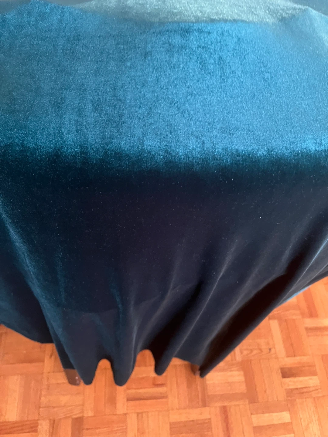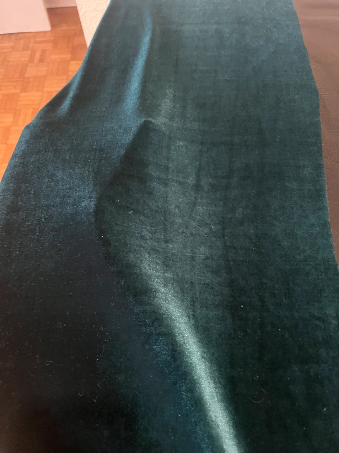Teal velvet fabric with a smooth, plush texture. Measures approx. 54 inches wide. Excellent for drapery or upholstery projects!