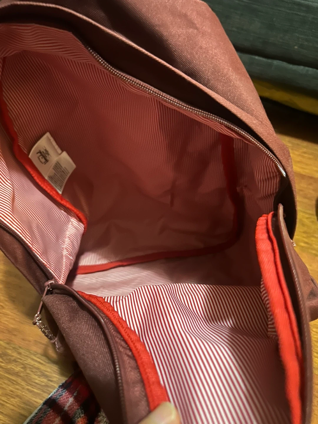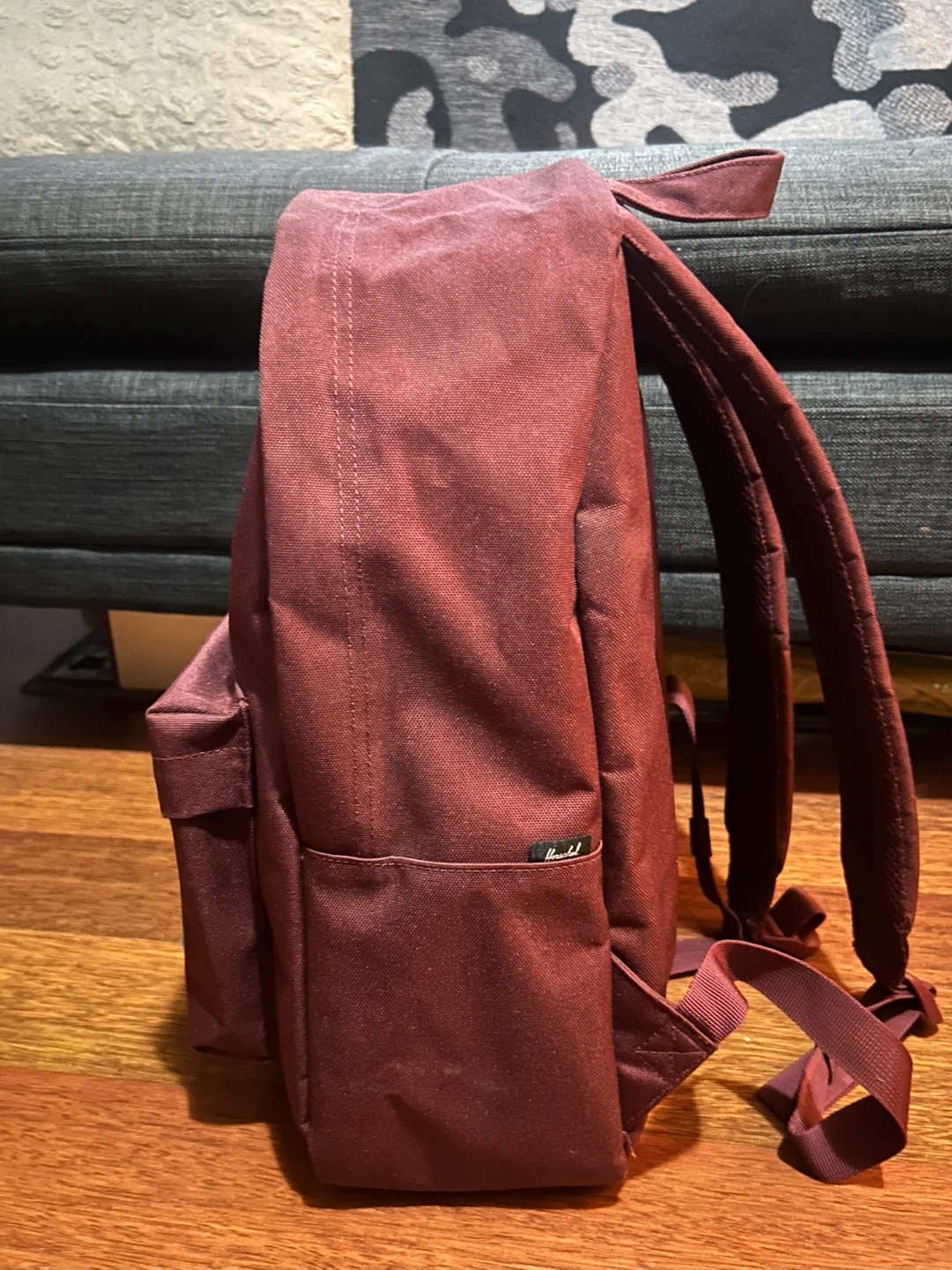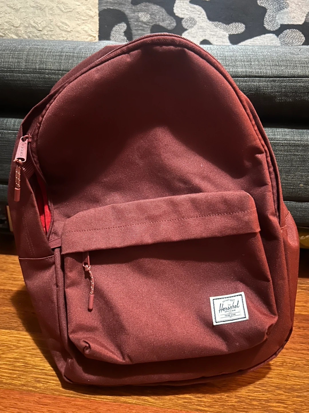 Herschel backpack in a nice burgundy colour. It has a main zippered compartment with a signature striped interior lining. There's also a front zippered pocket for smaller items. This bag is great for everyday use!