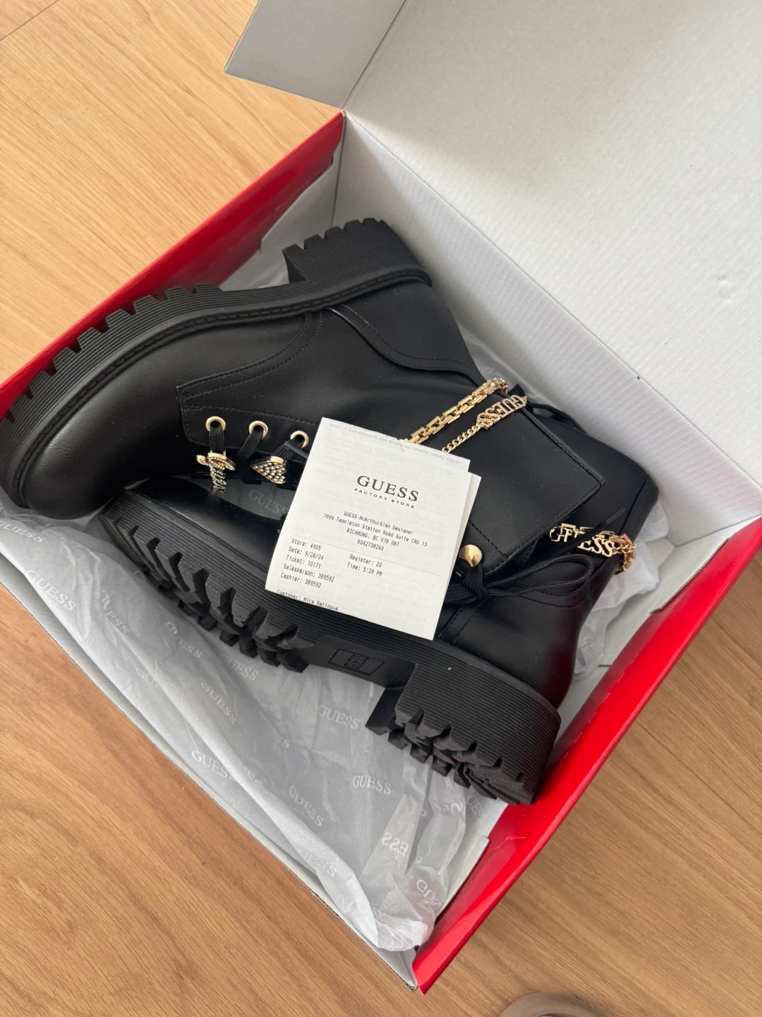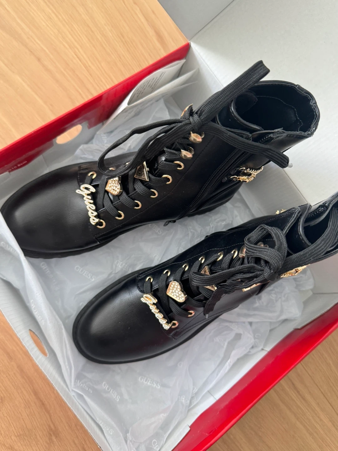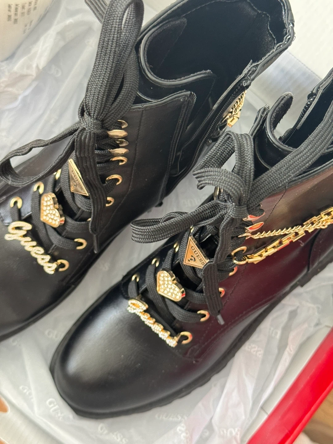 NEW! NEW! Selling a pair of Guess black leather boots in great condition! They come with their original box. These boots feature a lace-up design with gold-tone detailing and a side zipper for easy wear. Perfect for adding a stylish touch to any outfit. NEW! NEW!