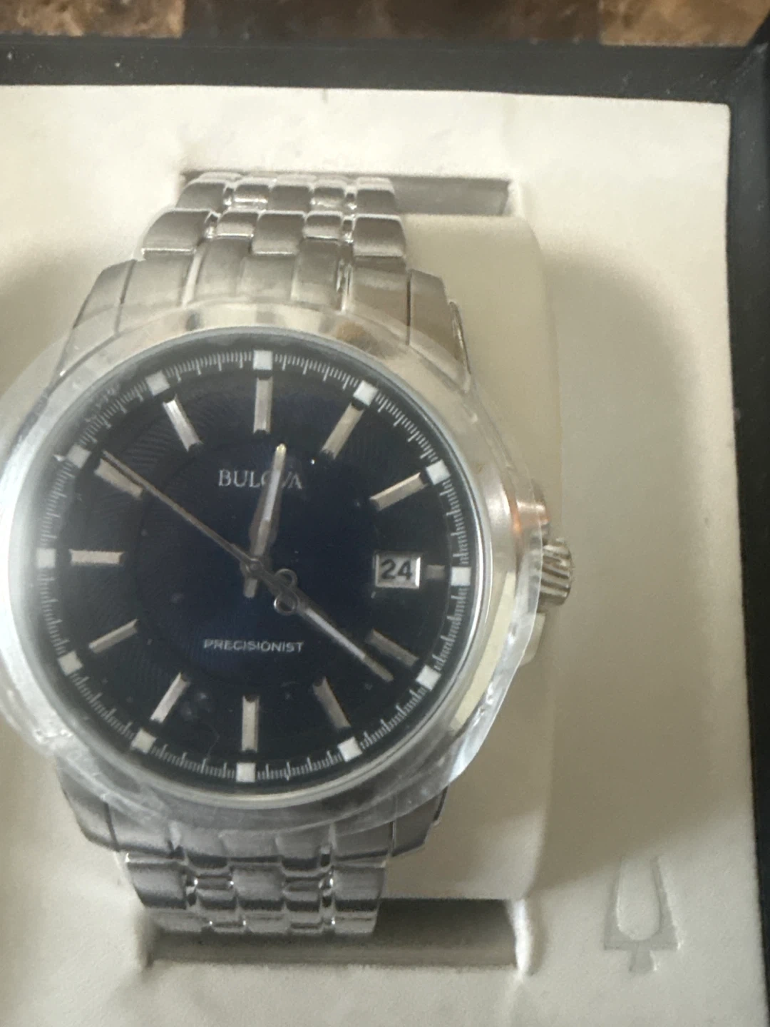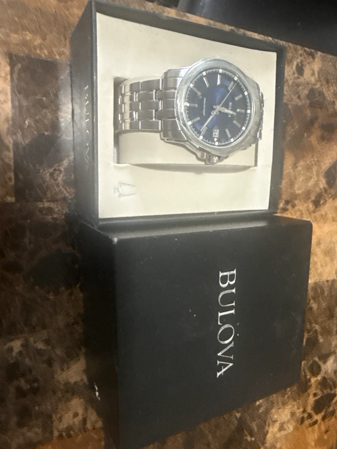This is a Bulova Precisionist men's watch with a stainless steel band and a dark blue face. It comes with the original box. This timepiece is known for its accuracy and smooth sweeping second hand.