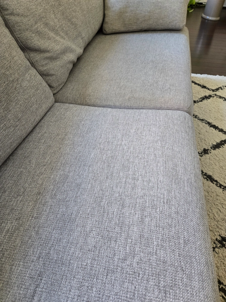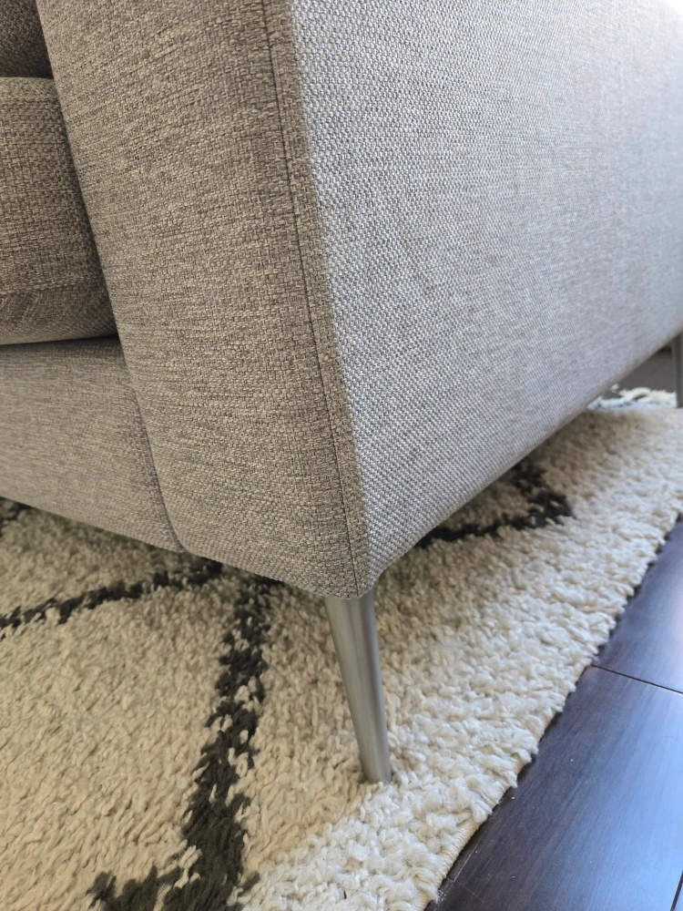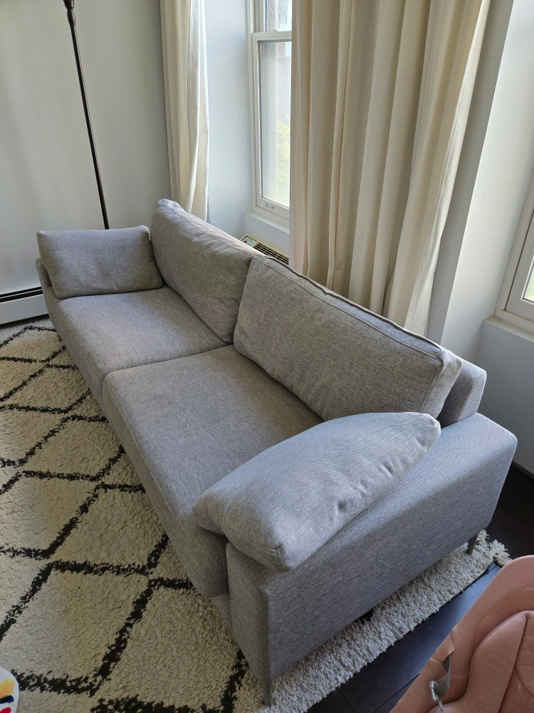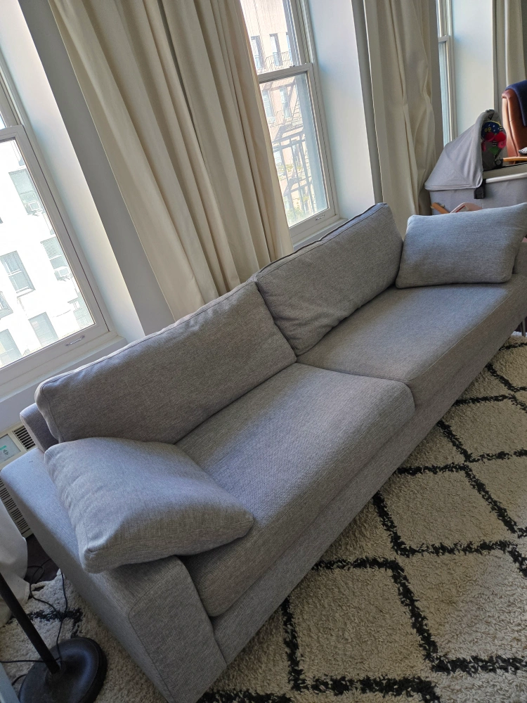 Couch has no visible discoloration, comes with well stuffed original pillows, and steel legs. I just can't bring it with me.