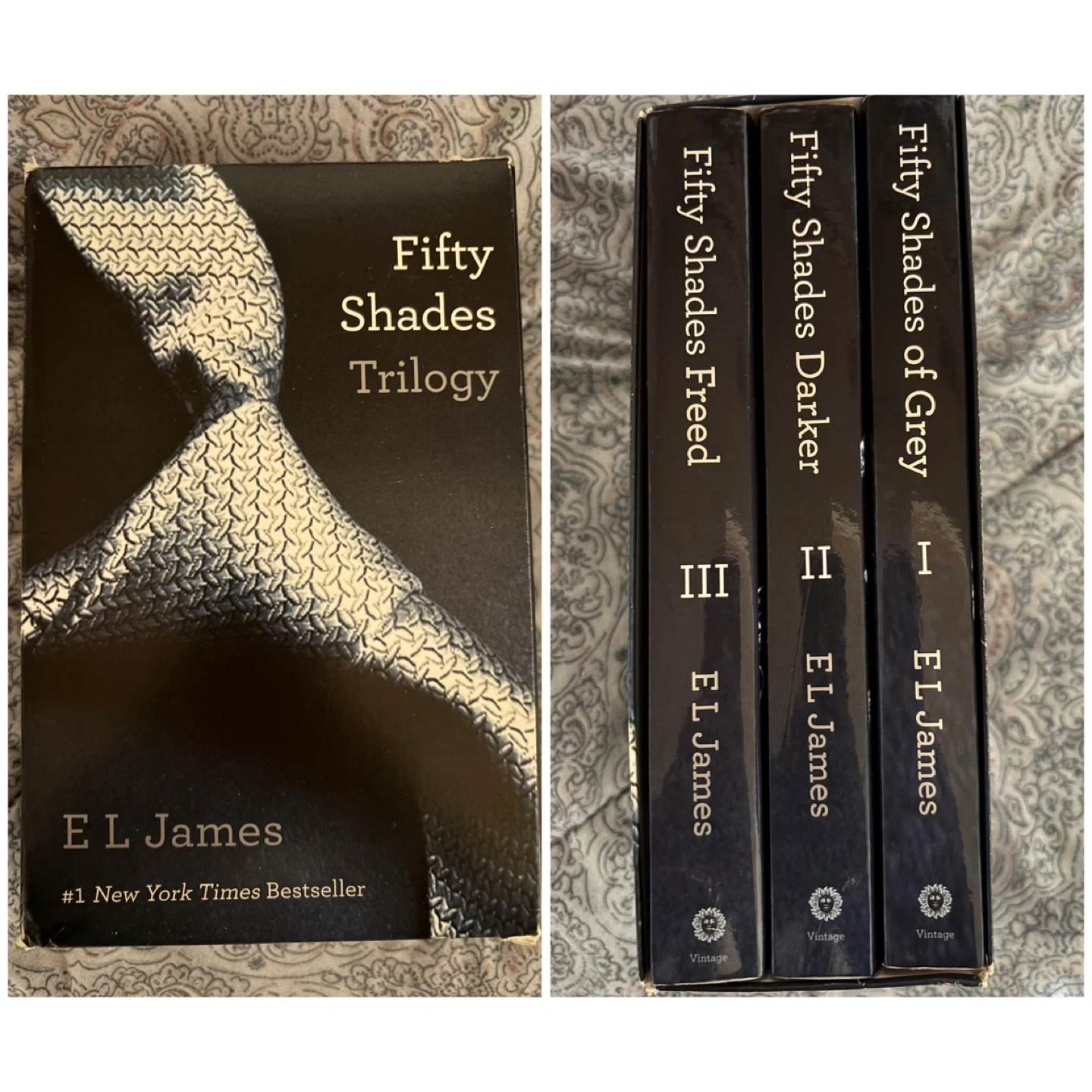 For sale is the complete “Fifty Shades” Trilogy box set by E.L. James. It includes Fifty Shades of Grey, Fifty Shades Darker, and Fifty Shades Freed.