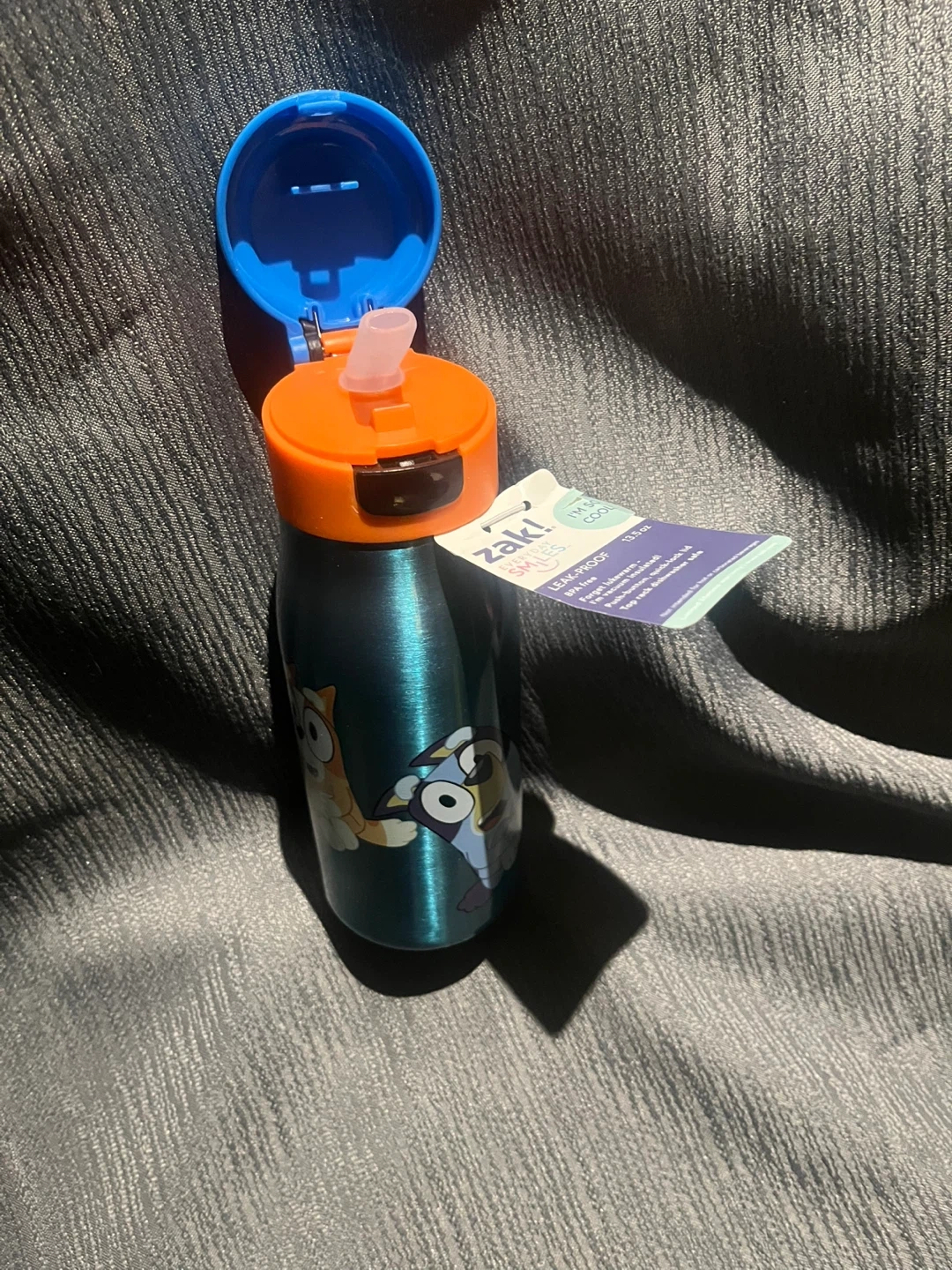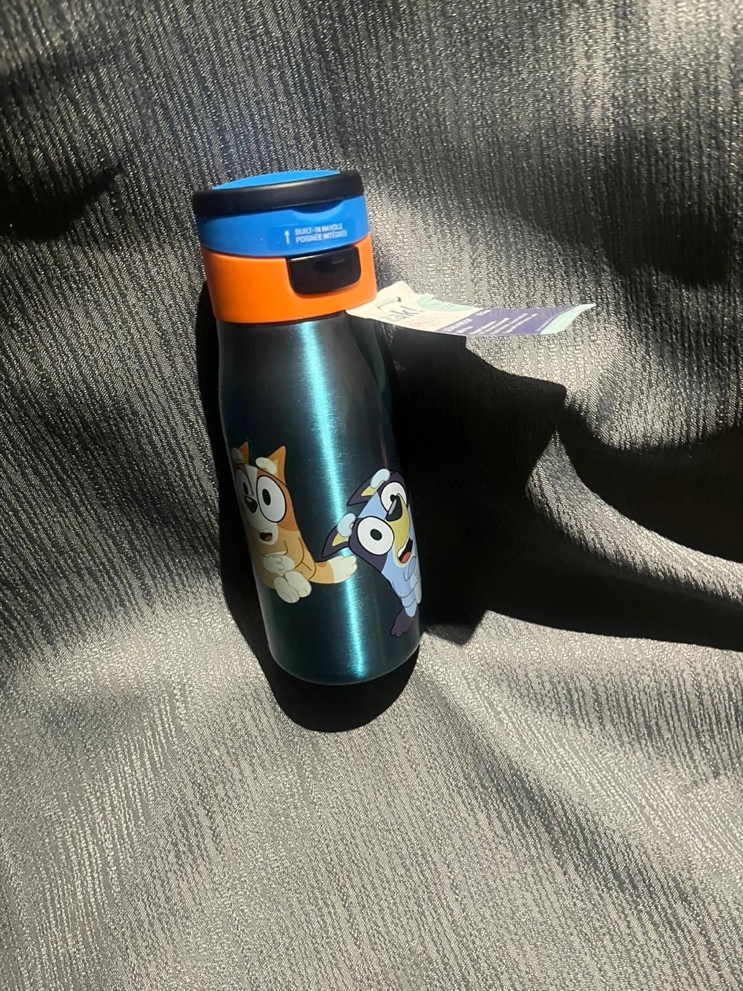 This Bluey water bottle is made of stainless steel and features characters from the show. It has a leak-proof lid with a straw for easy drinking. Keeps drinks cold!