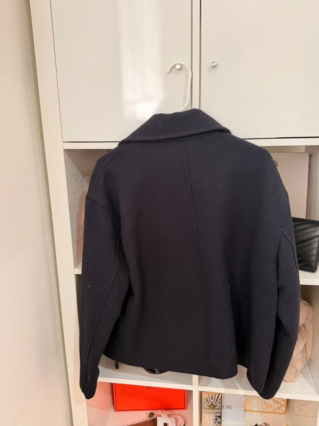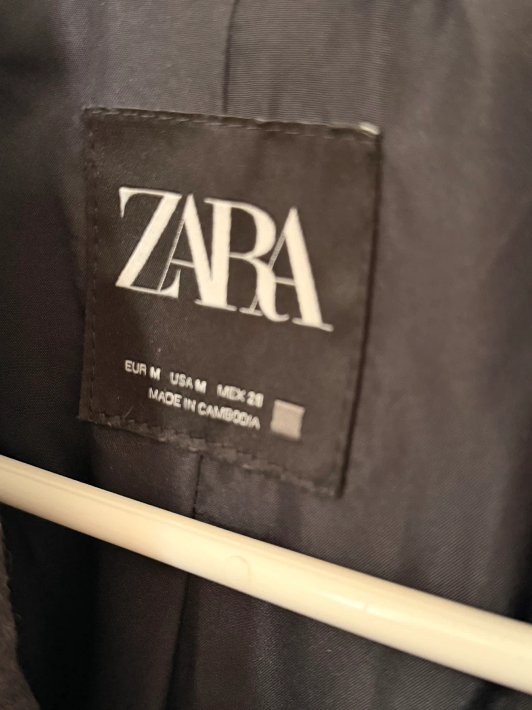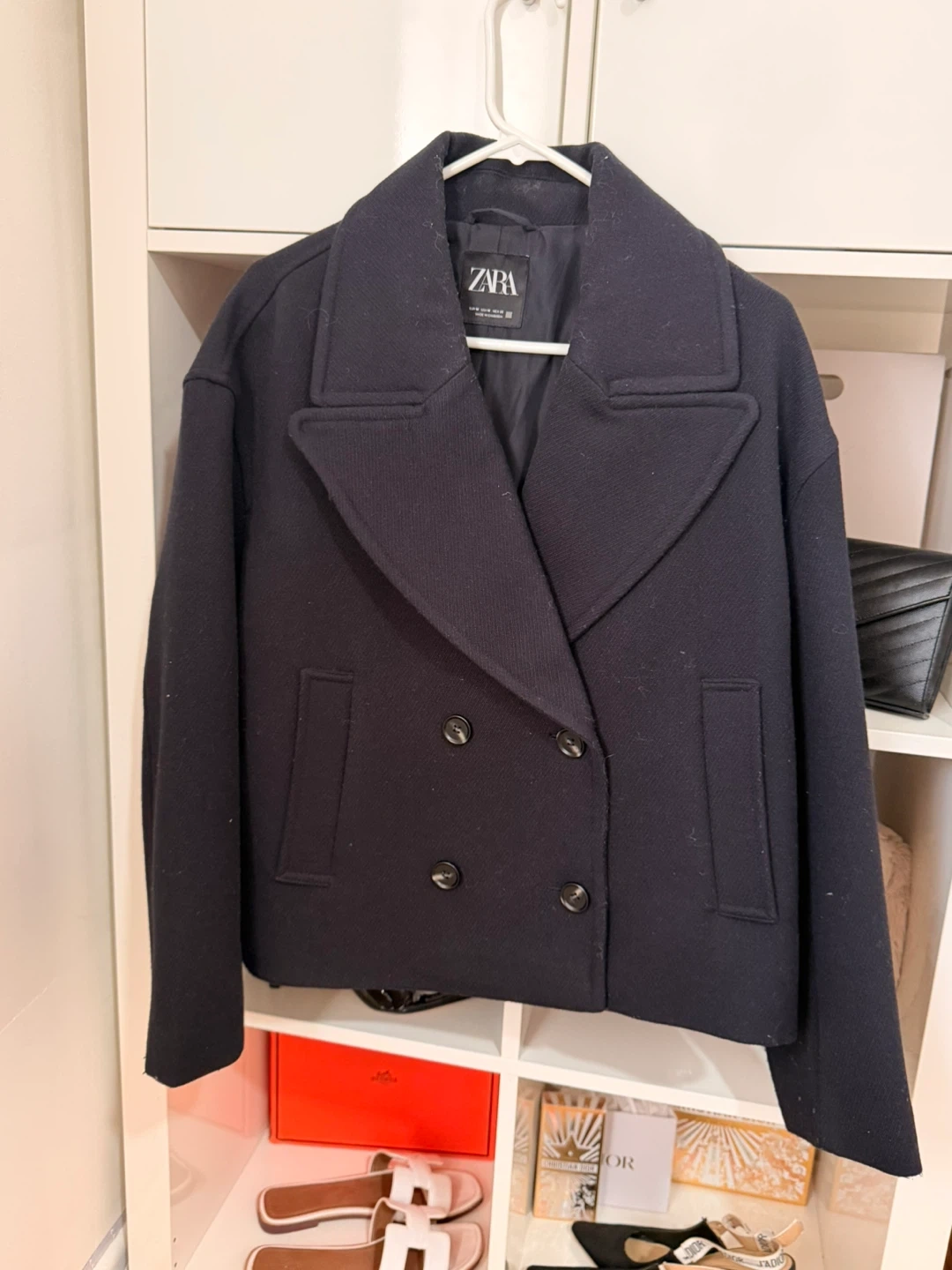 Zara cropped jacket in a dark navy colour. It's a double-breasted style with a classic collar. Size is Medium (EUR M, USA M). Made in Cambodia.