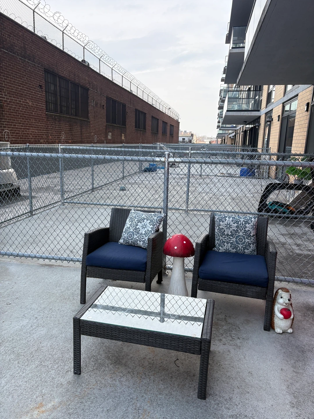 Includes two wicker chairs with navy blue cushions and decorative pillows. A glass-top wicker coffee table is also part of the set. Adds a cozy touch to your patio space!