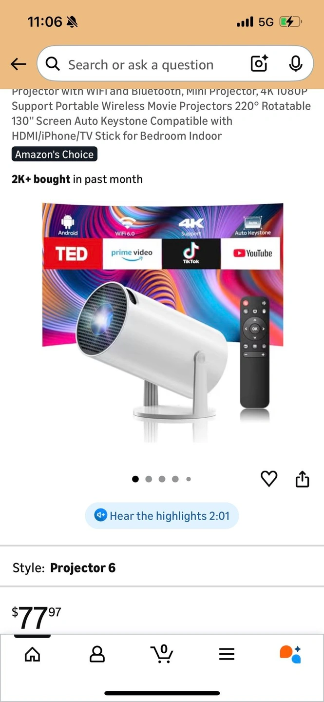 Portable wireless movie projector with WiFi and Bluetooth. Supports 4K and 1080P. Features a 220° rotatable lens and can project up to a 130'' screen. Includes auto keystone correction. Compatible with HDMI, iPhone, and TV Stick. Great for bedrooms or indoor use.