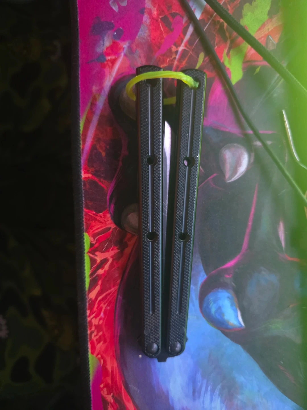 Black butterfly knife trainer. It's a trainer, so it's safe for practice. The handles are textured for a good grip.