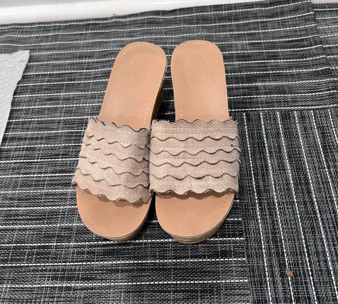 These JIB&AI LI wedge sandals feature a beige suede upper with a decorative scalloped edge. The wedge heel is approximately 3 inches high, providing comfortable lift. Size is 36.