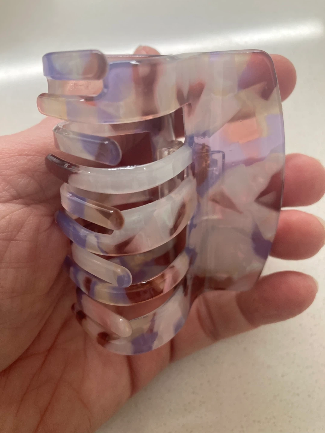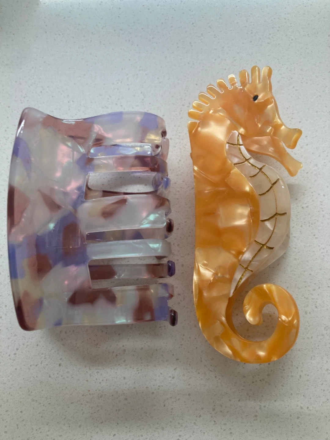 A fun orange seahorse design ($20), a lavender marbled clip ($5), and a classic tortoise shell clip ($3). Imported from France and Germany and made of durable high-grade resin. Take all 3 for $25.