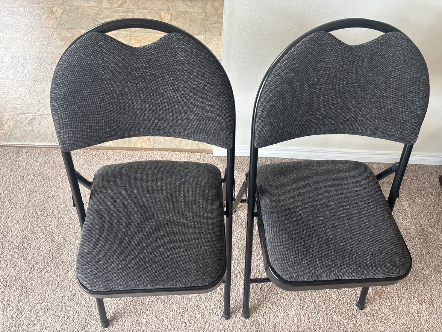 Two padded folding chairs with a dark grey fabric upholstery and black metal frames. These chairs are comfortable and can be easily stored away when not in use. They're great for extra seating at gatherings or events!