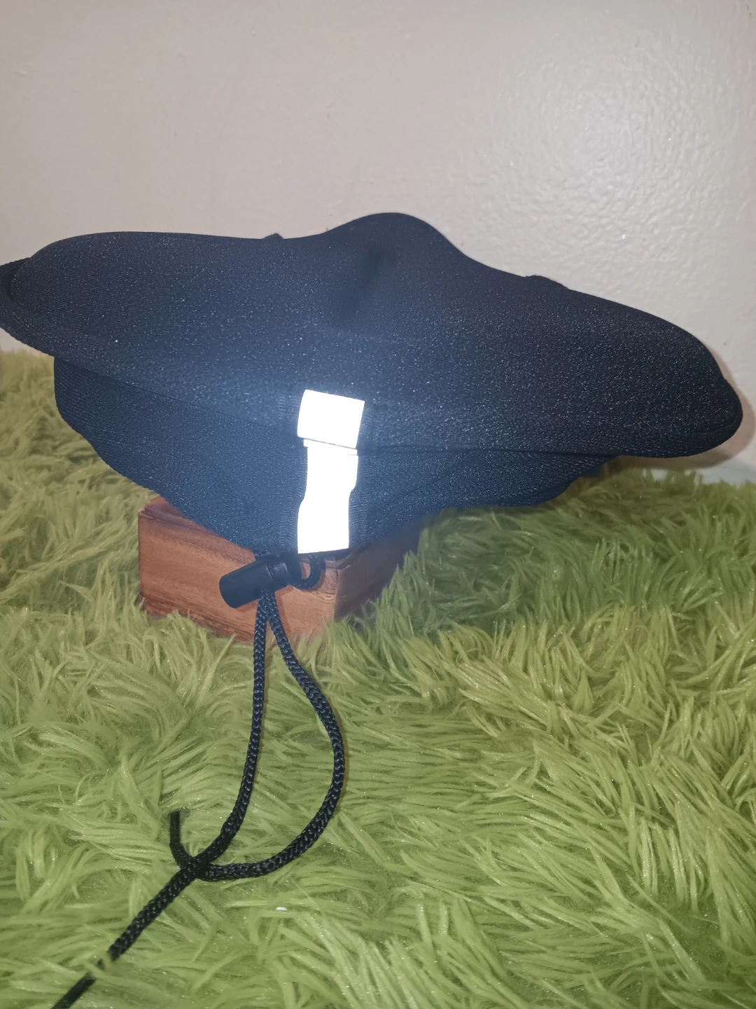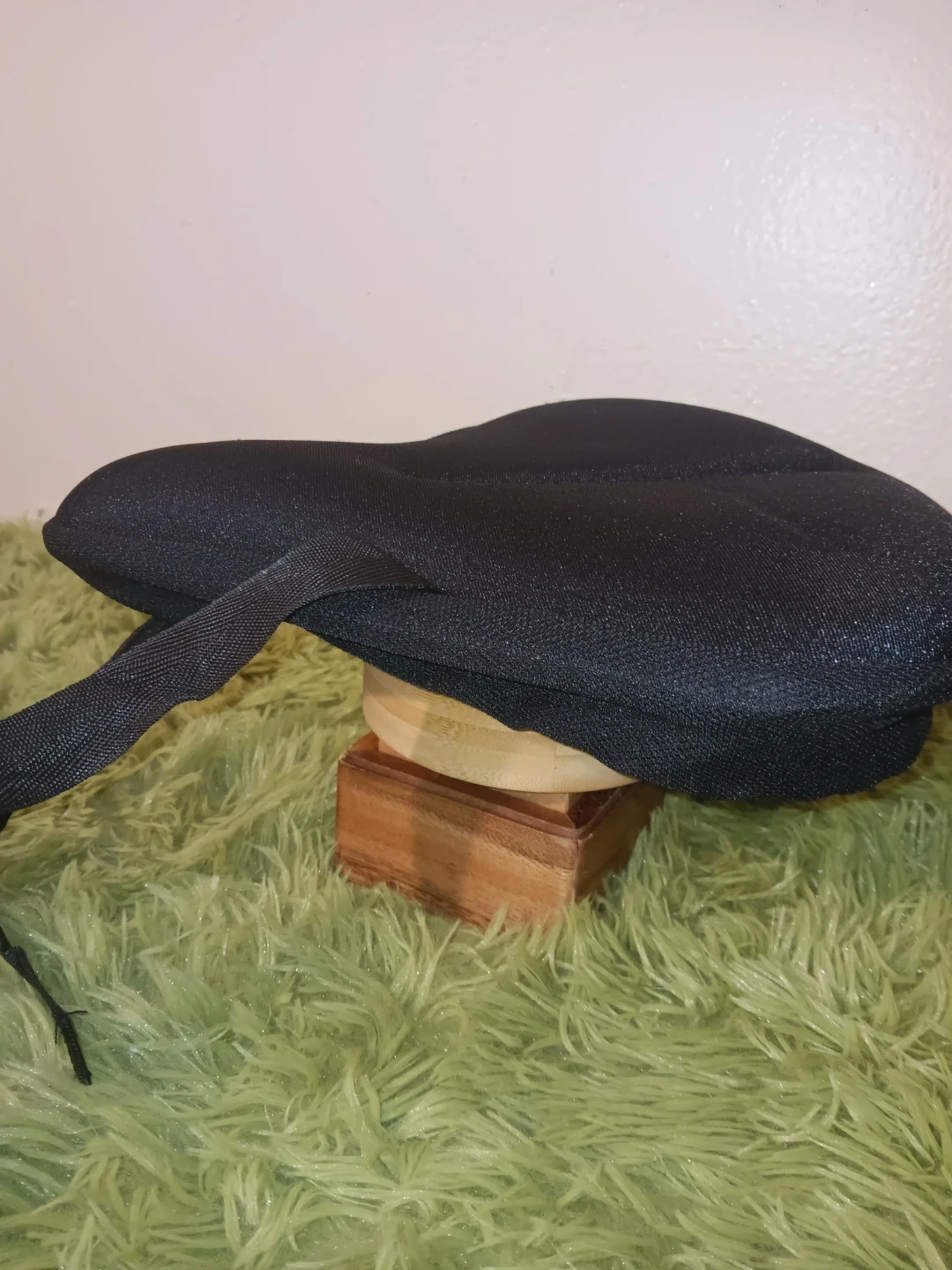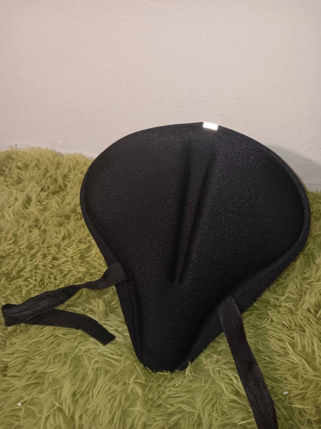 This is a black bicycle saddle cover. It's made from a padded material for added comfort. Features adjustable drawstrings and reflective accents for visibility.Fits most standard bike seats , gel padding and 1 3/4 inch thick. It's make riding a bike so comfortable. Only used twice!:) smell fresh, new and no signs of wear.