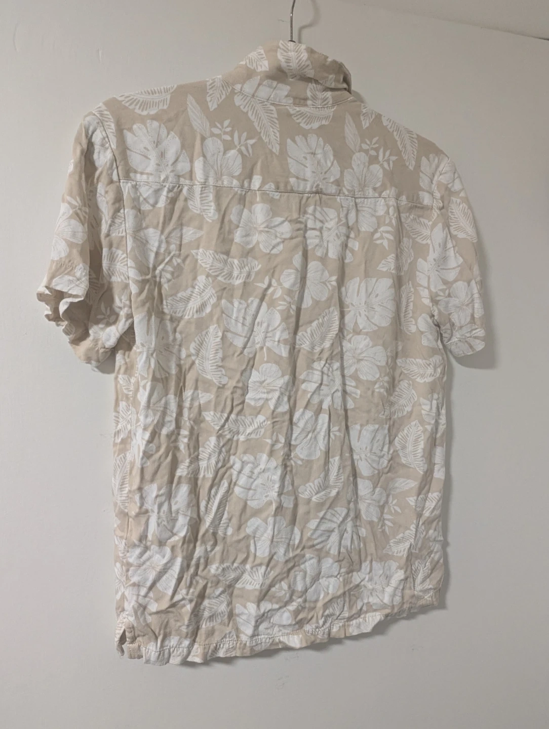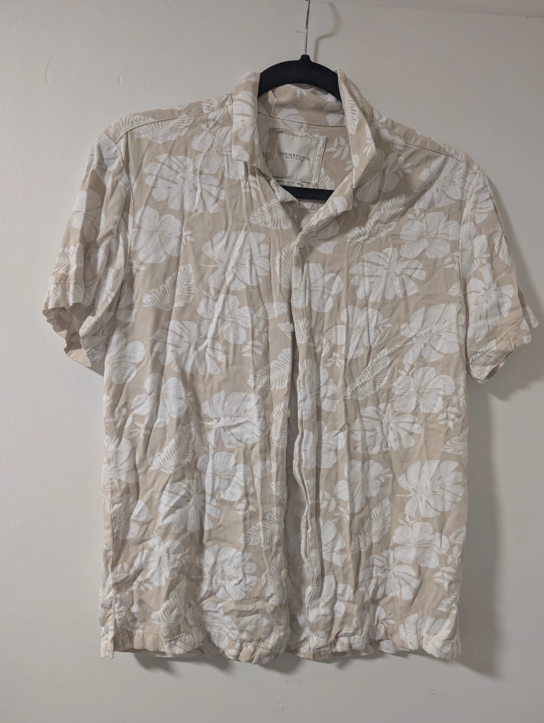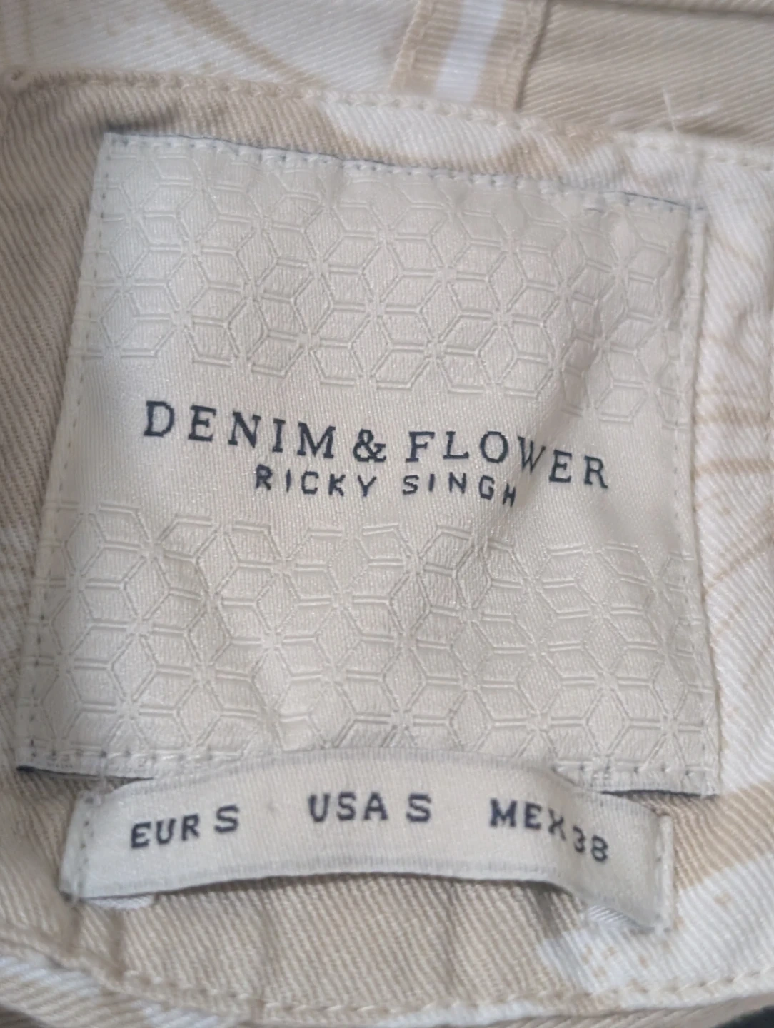 Selling a gently used Denim & Flower Ricky Singh button-up shirt. It's a size small and features a cool floral pattern. The material is 100% Viscose, making it lightweight and comfy for summer!