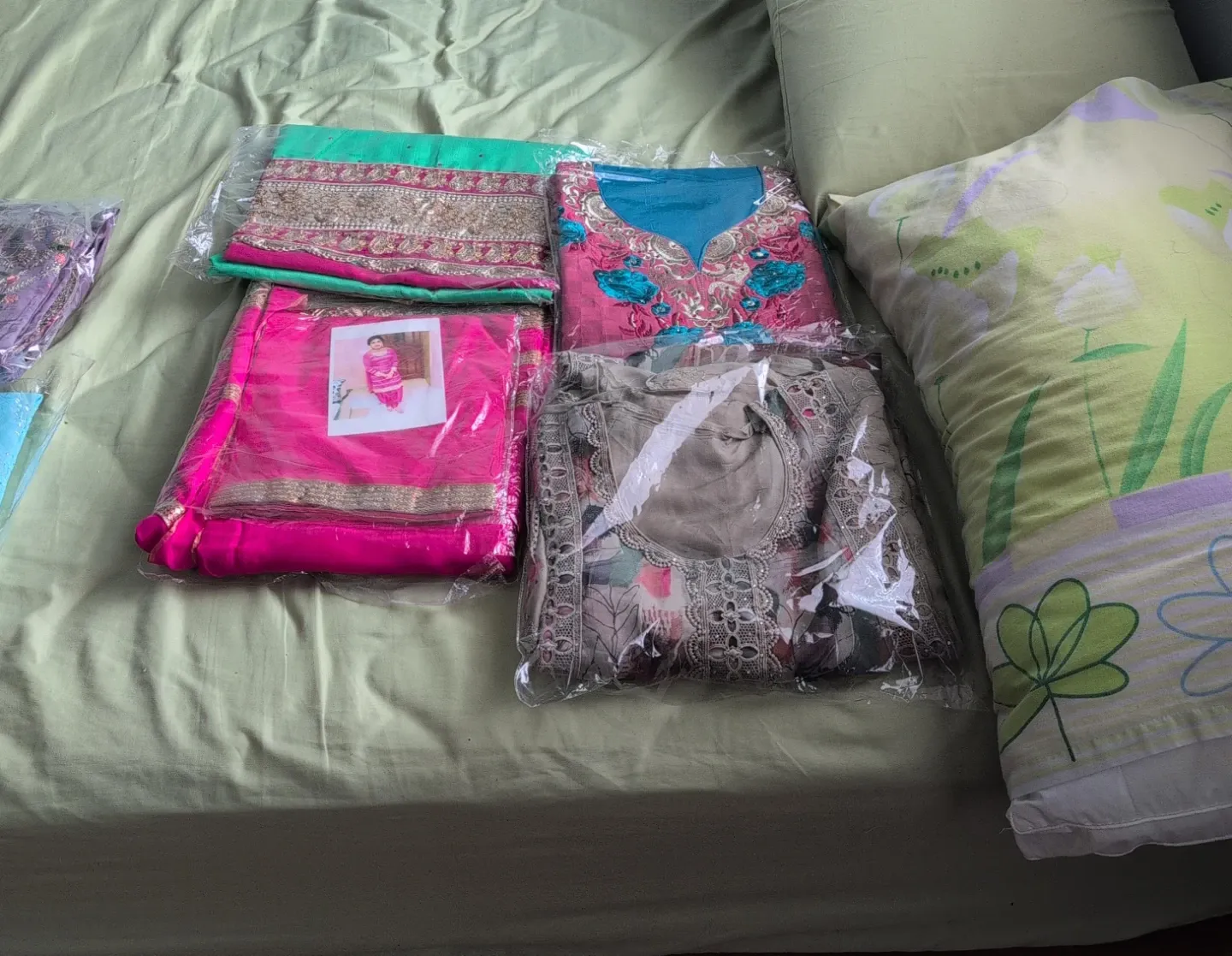 Three unstitched Pakistani salwar kameez suits. Two feature vibrant colours with intricate embroidery, and one has a subtle floral print. Perfect for festive occasions or everyday wear.