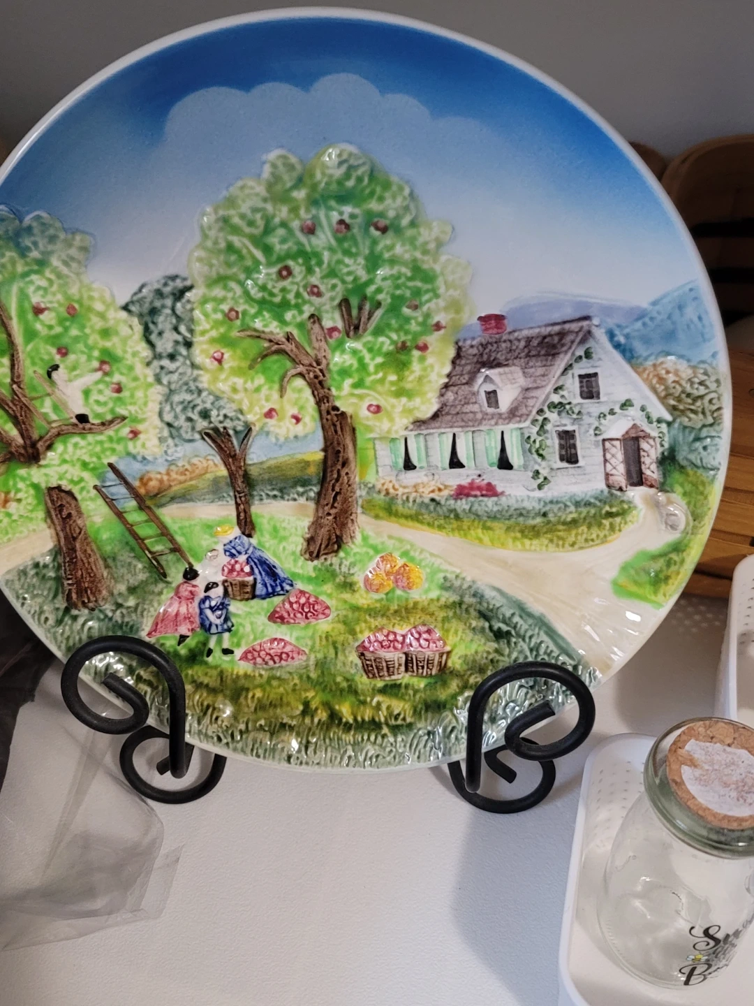 This decorative plate features a charming scene of an apple orchard harvest. It's made in Western Germany and displays a detailed, colorful illustration.