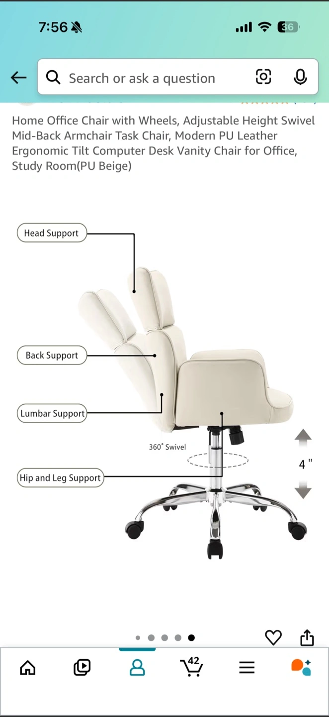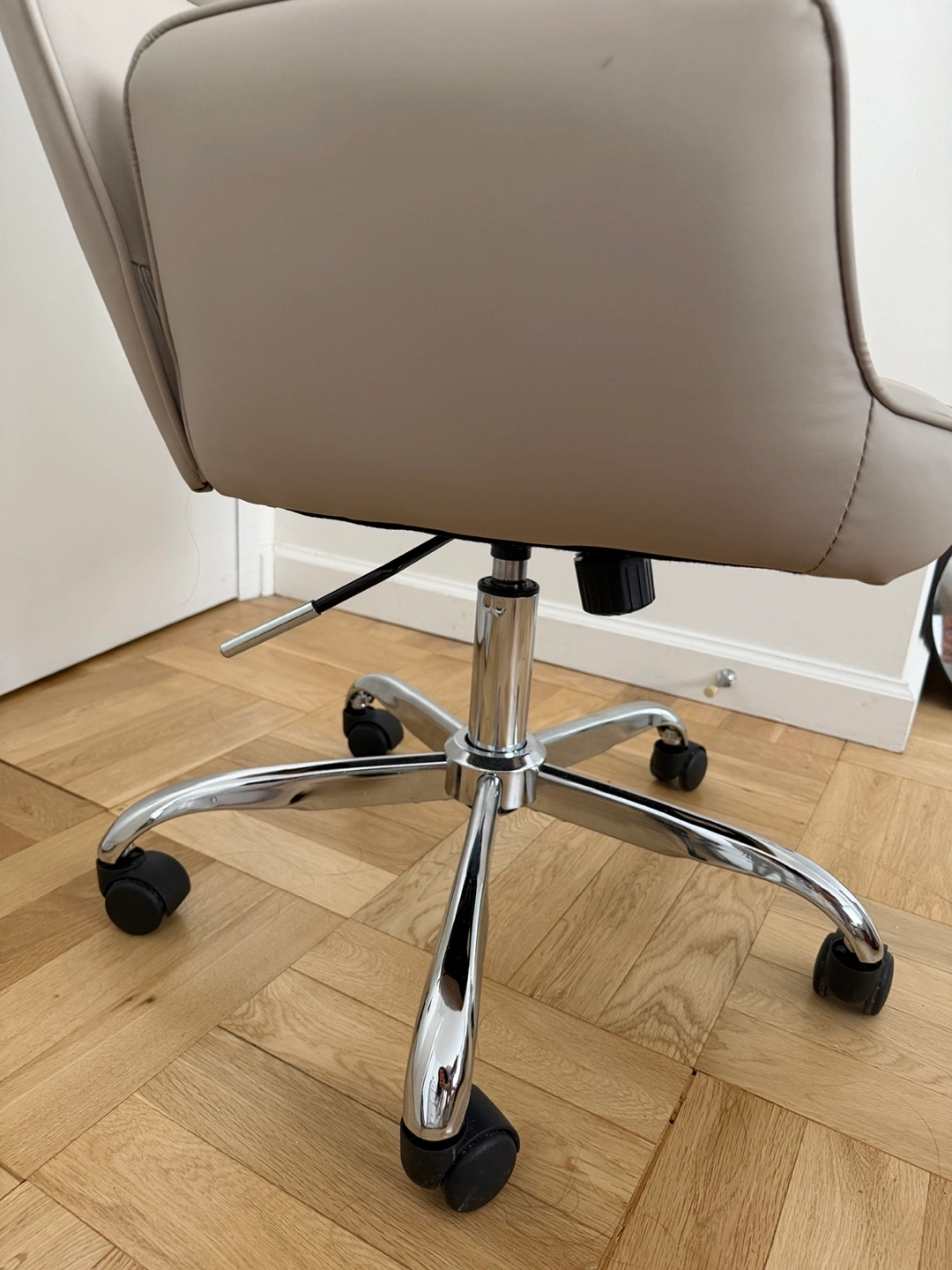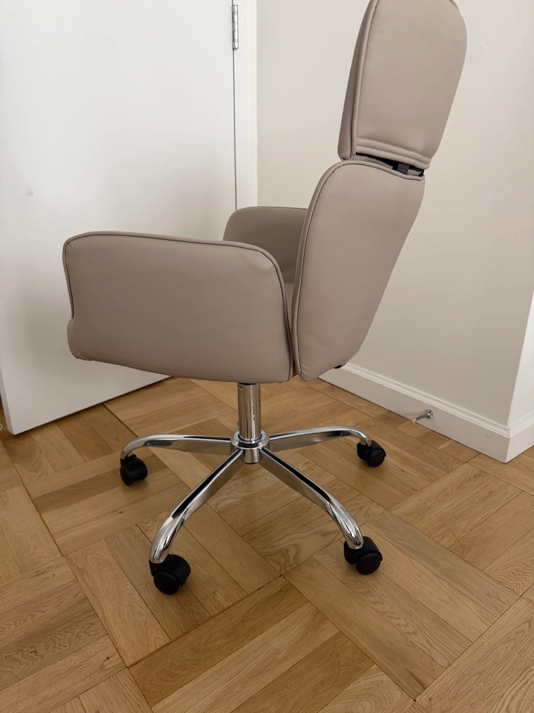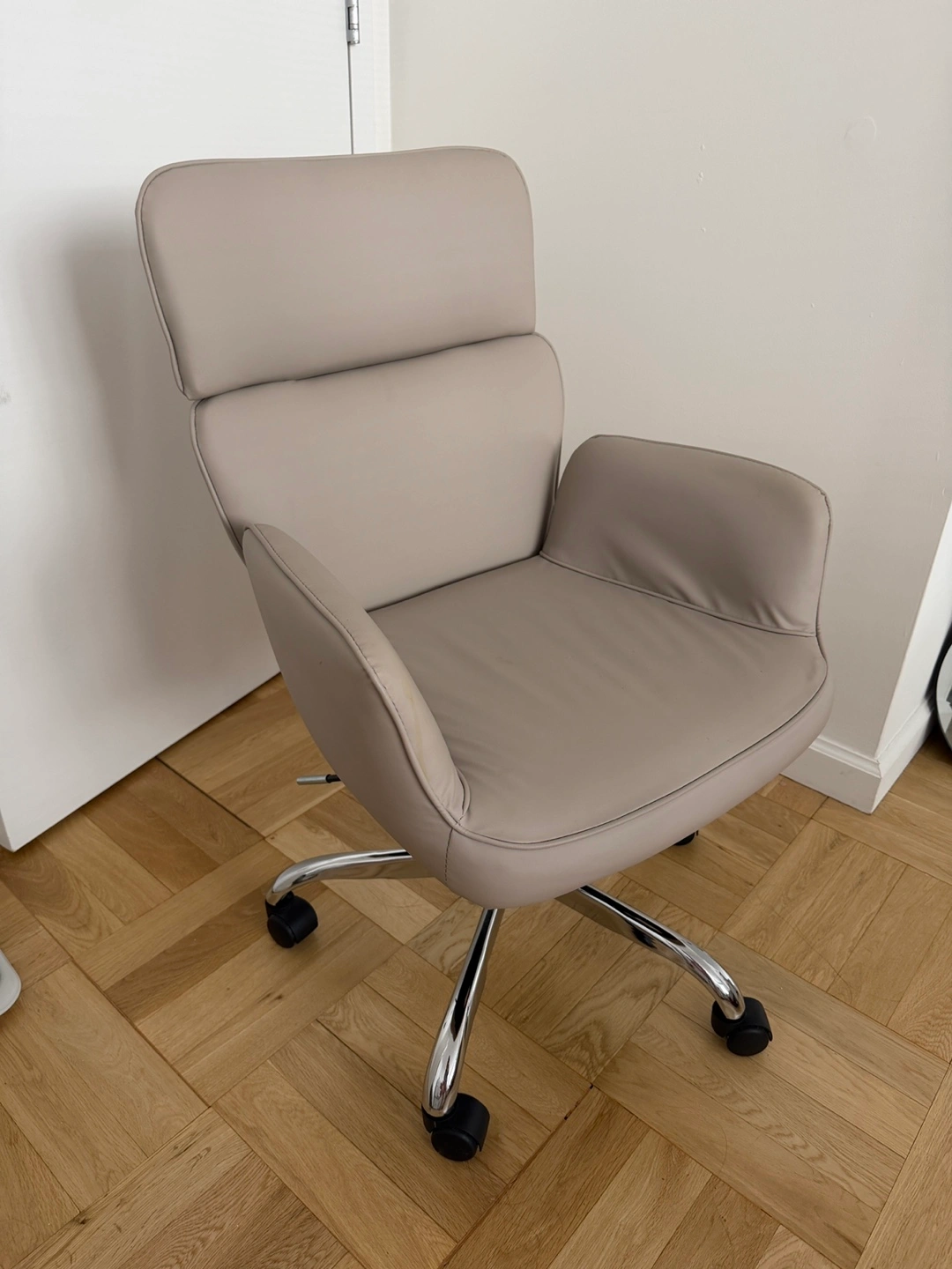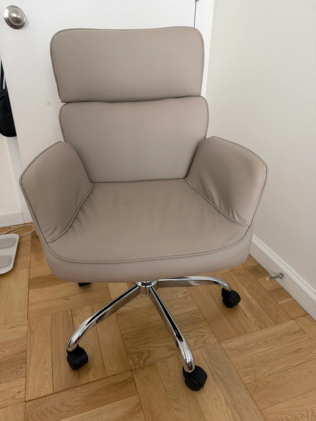 Just used 1 year Selling a comfortable home office chair. It features adjustable height and a swivel design for flexibility. The chair has a mid-back with head, back, lumbar, and hip & leg support. The material is PU leather and the color is a nice beige