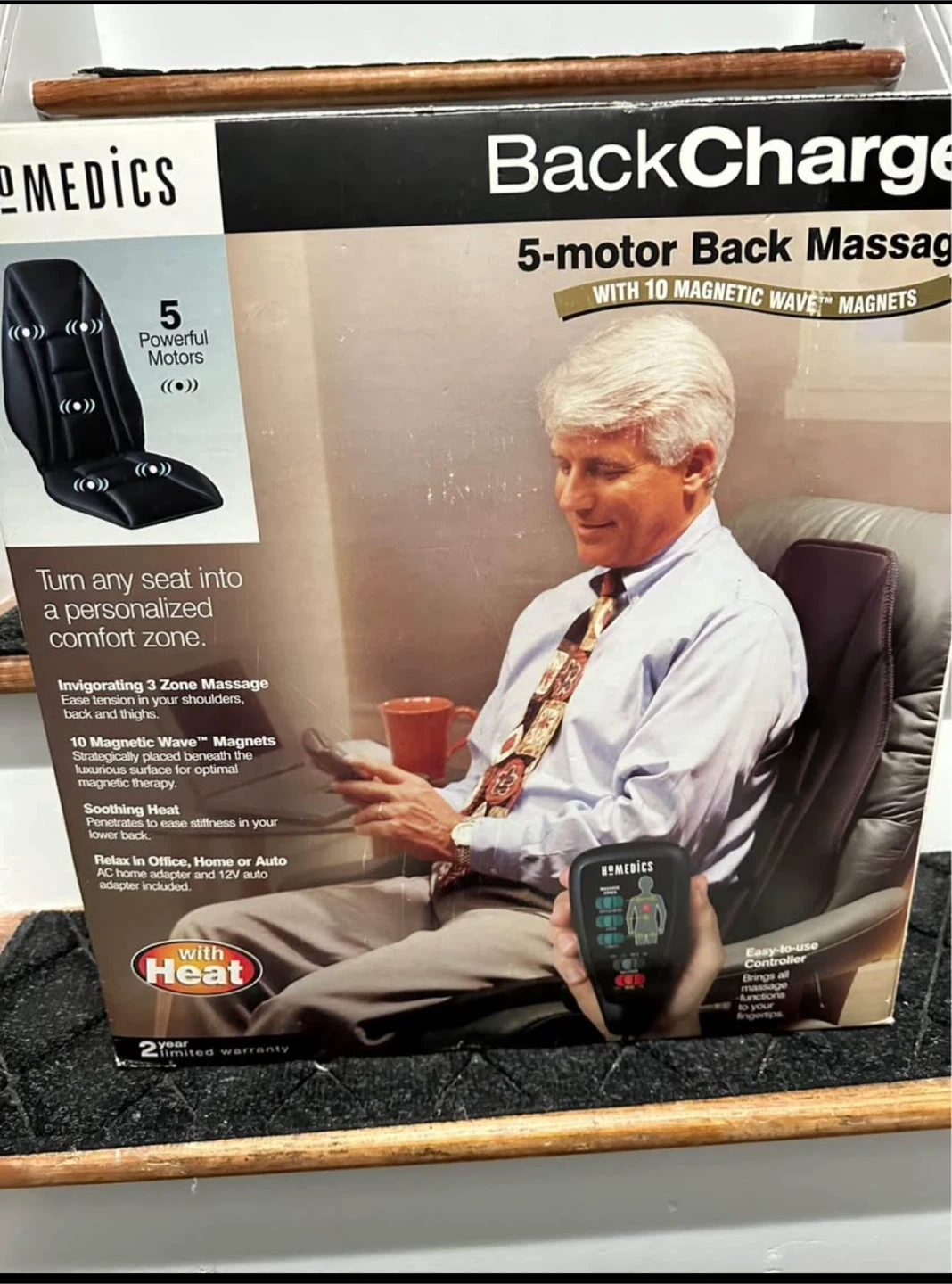 5Turn any seat into a personalized comfort zone with this HoMedics BackCharge massager! It features 5 powerful motors and 10 Magnetic Wave magnets strategically placed for optimal magnetic therapy. Enjoy invigorating 3-zone massage to ease tension in your shoulders, back, and thighs, plus soothing heat to penetrate and relieve stiffness in your lower back. Relax in your office, home, or auto with the included AC home adapter and 12V auto adapter. It also has an easy-to-use controller that brings all massage functions to your fingertips