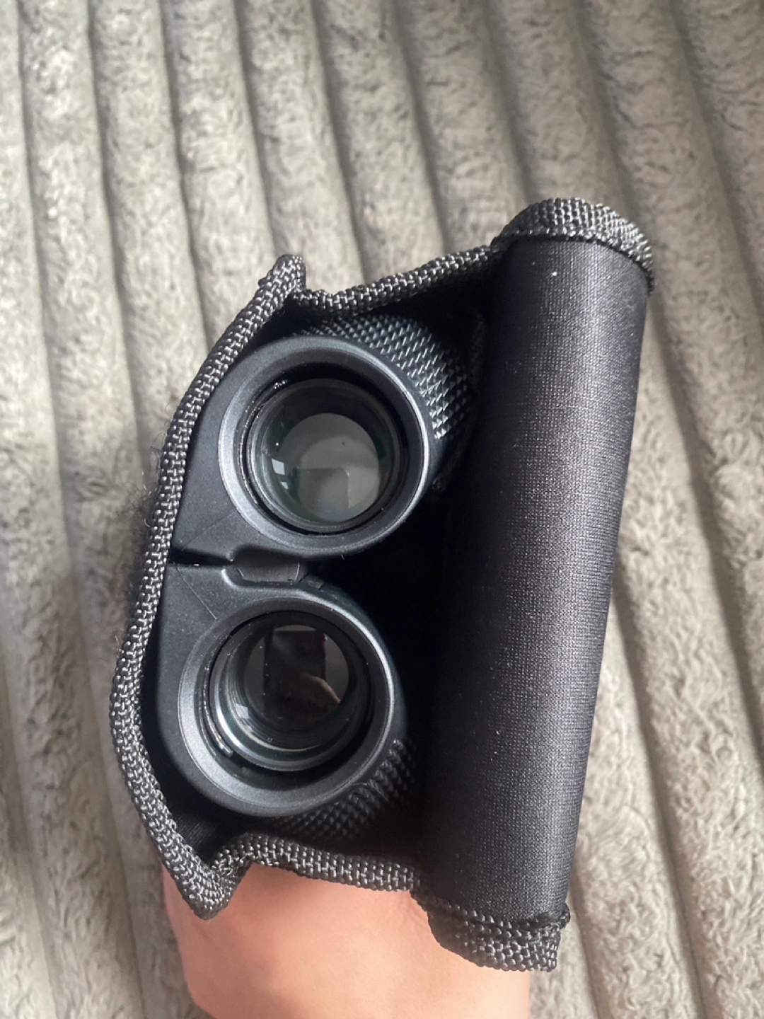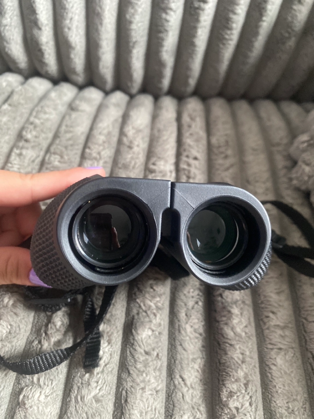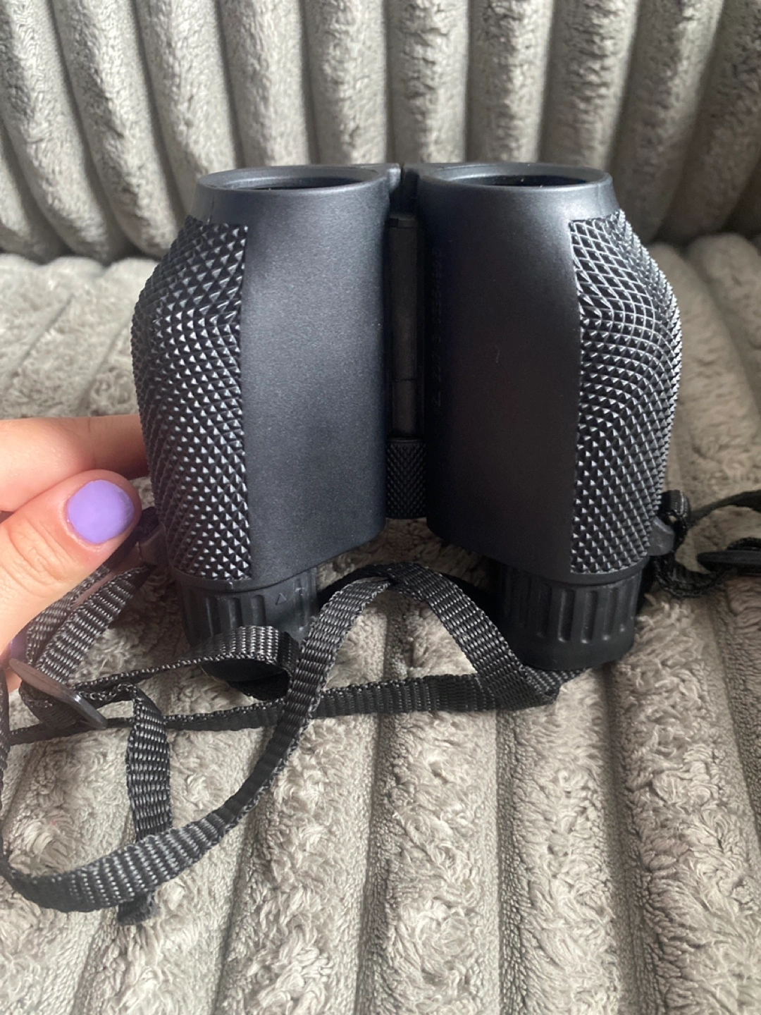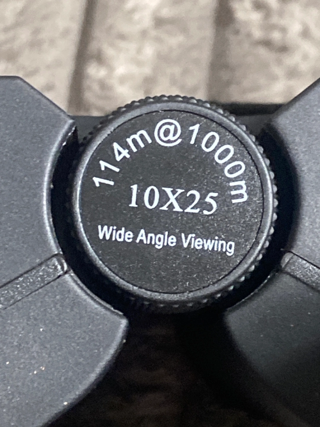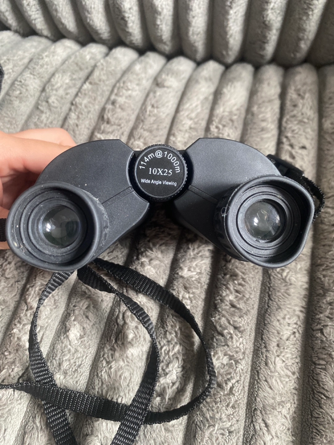 5Compact black binoculars. Comes with a carrying case and neck strap. They seem to be a 10x25 wide angle viewing. A relaxing afternoon in nature is made even better with these.