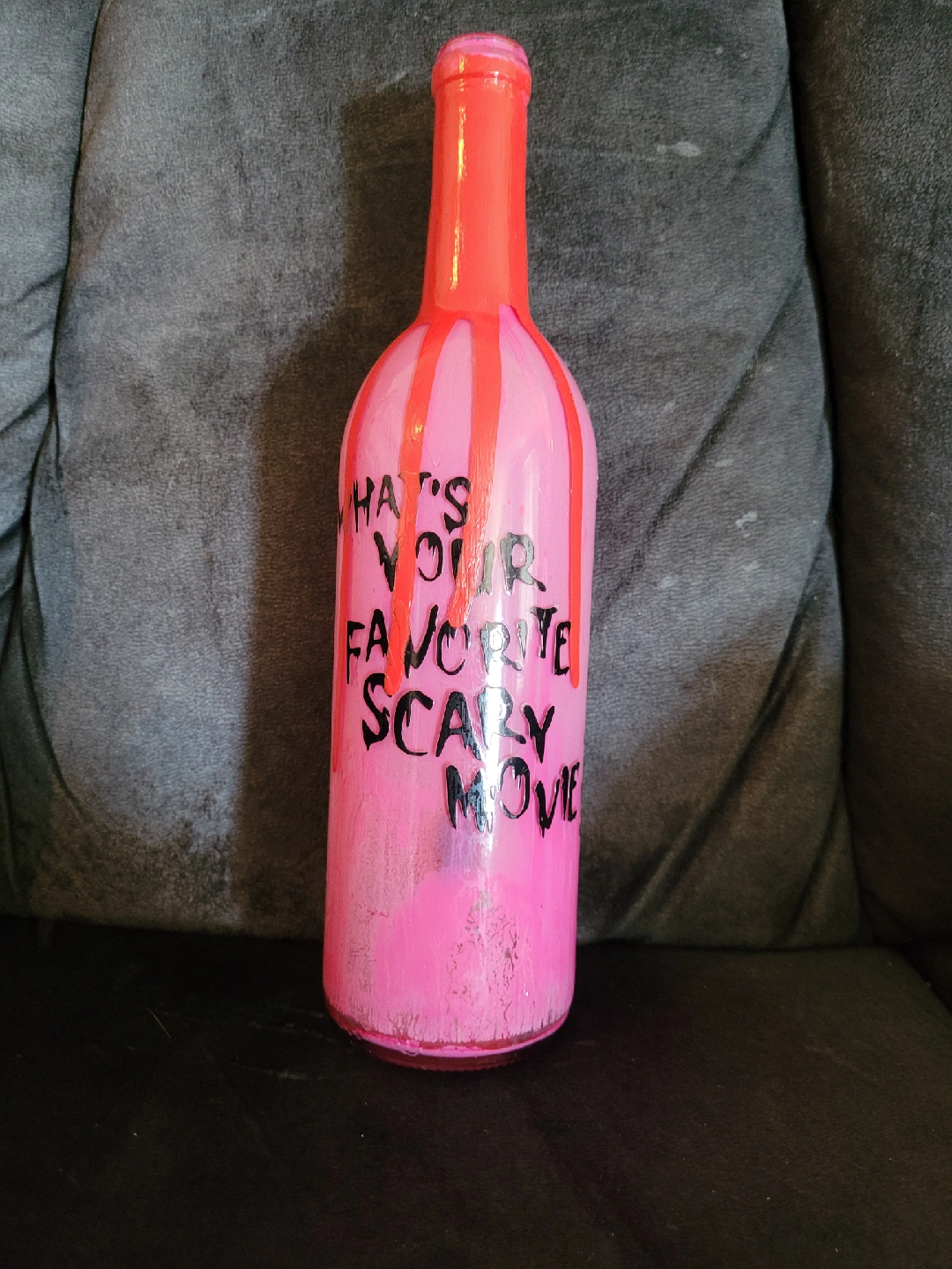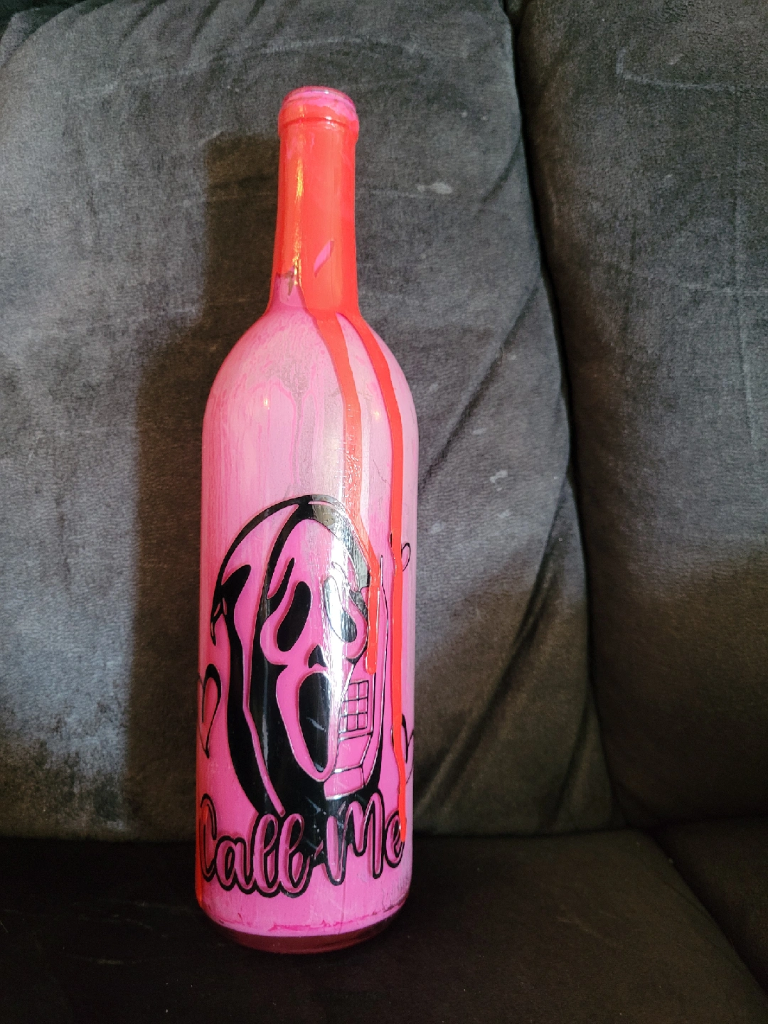 Hand painted wine bottle with a horror movie theme. Features a pink and red color scheme with a spooky design. Perfect for adding a unique touch to your decor!