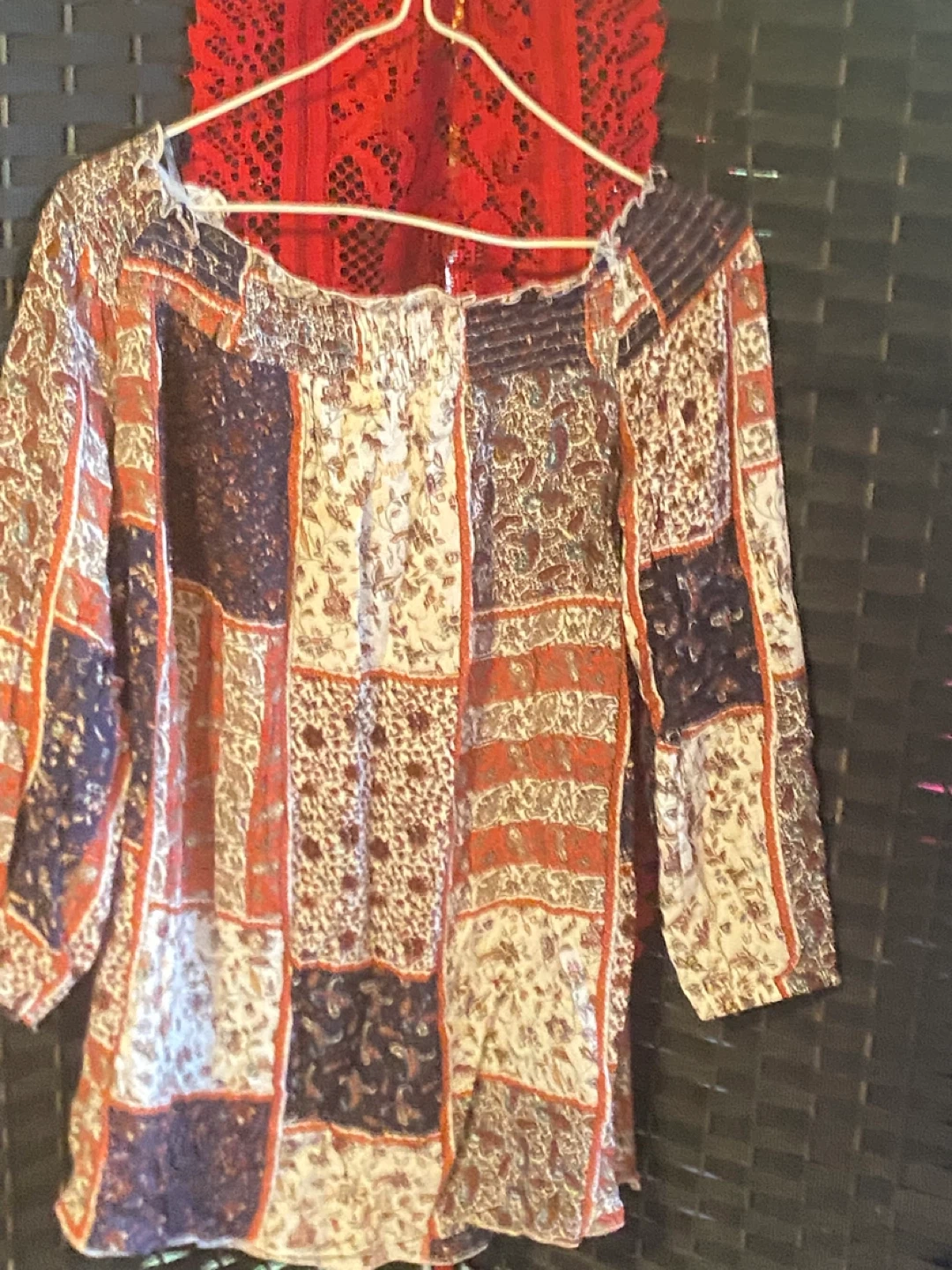 Here's a colorful patchwork blouse! It features a mix of floral and geometric patterns in shades of orange, white, and navy. Perfect for adding a pop of color to your wardrobe!