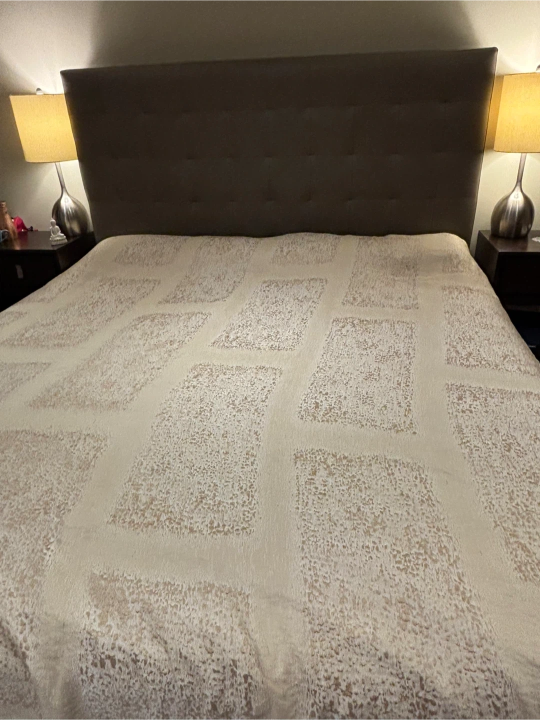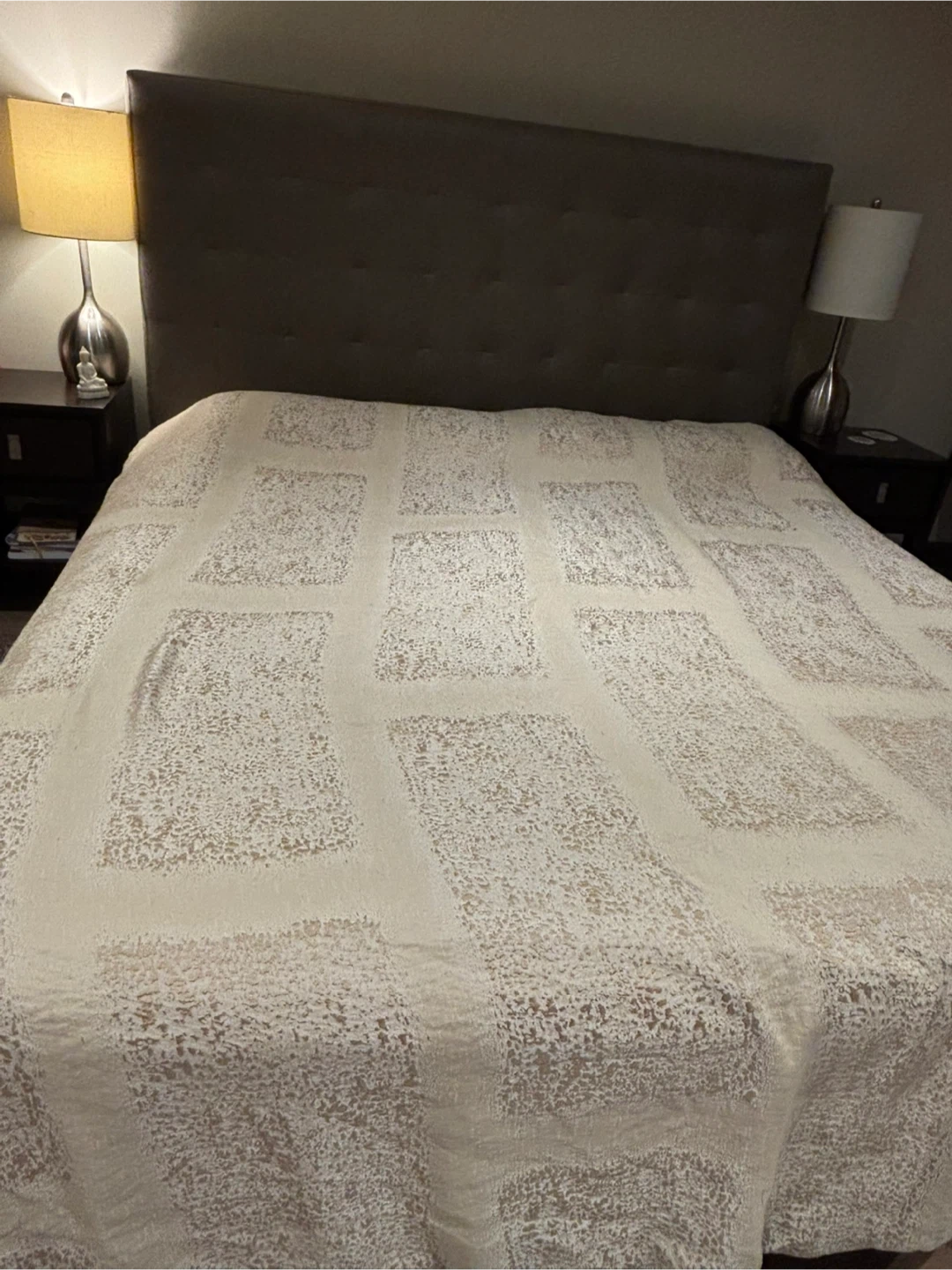 Selling a Hotel Collection king size Duvet cover . It is made of 62% polyester, 27% rayon, 11% linen on the front and 100% cotton on the back. It is in very good condition and very lightly used