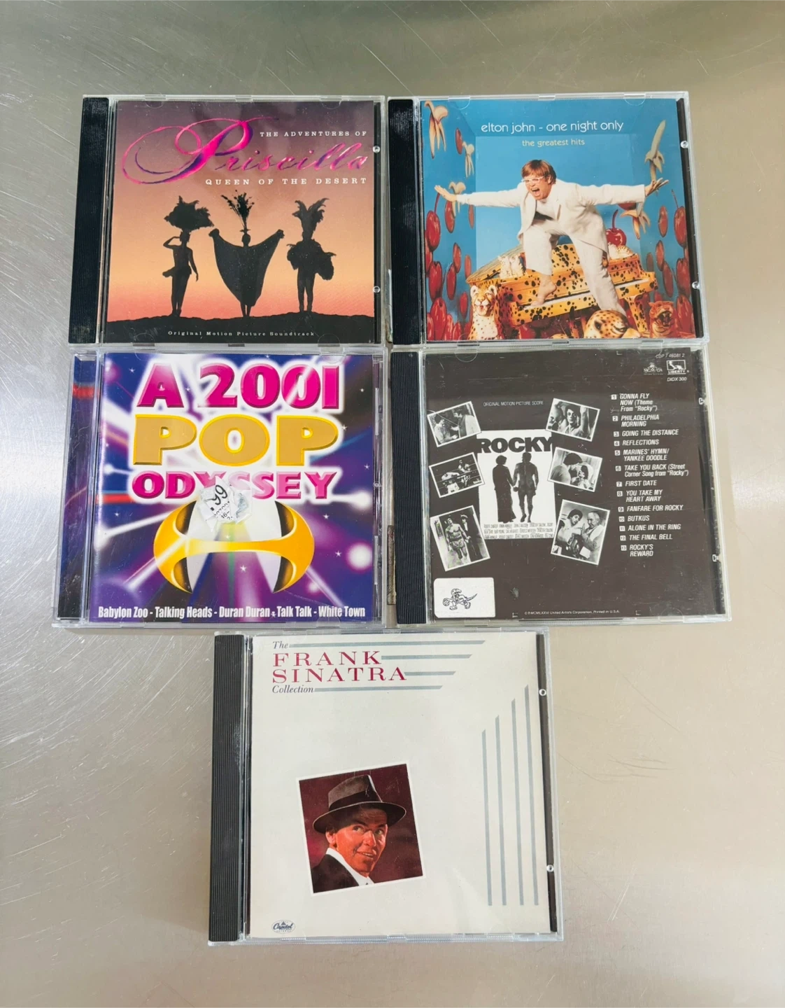 The albums are 'The Adventures of Priscilla, Queen of the Desert', 'Elton John - One Night Only: The Greatest Hits', 'A 2001 Pop Odyssey', the 'Rocky' original motion picture score, and 'The Frank Sinatra Collection'.
