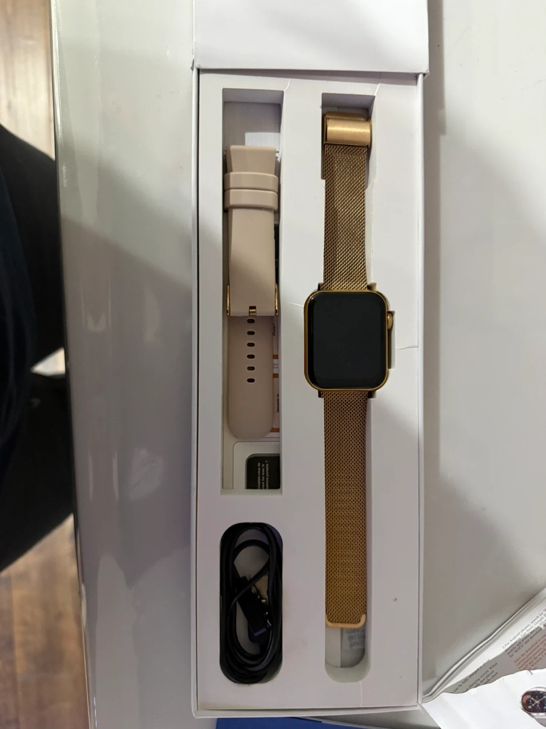 Selling a gold smartwatch from HXOHSTBG. It comes with an extra band and the original box! Included is the charger as well. It's in great condition and ready for a new owner