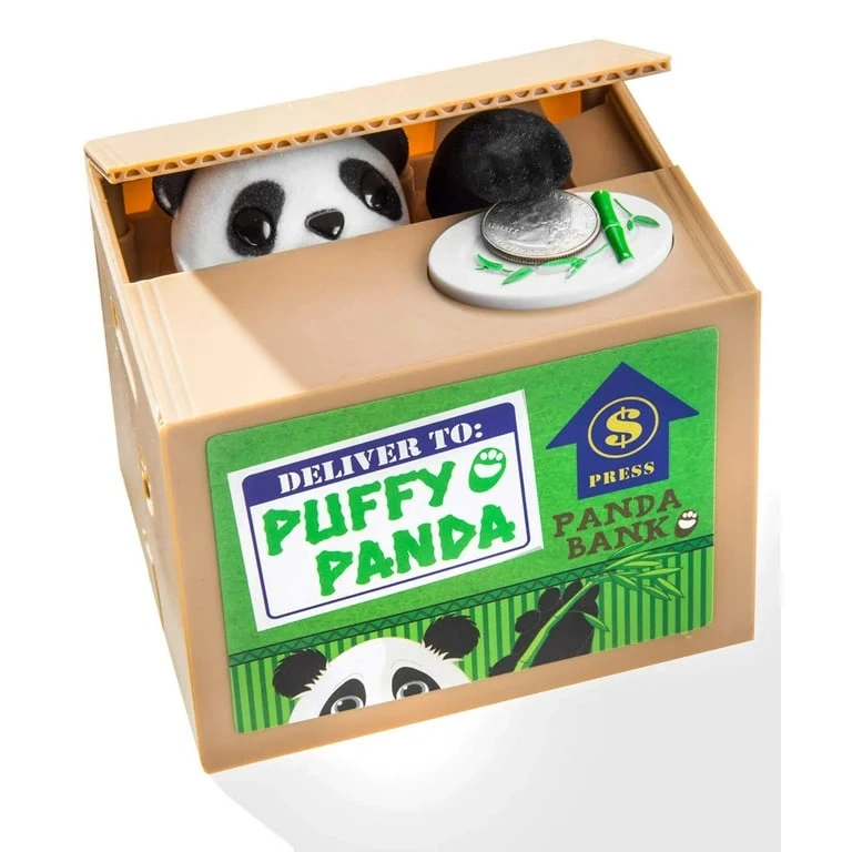 This is a Puffy Panda coin bank! It's a fun and interactive way to save money. Just place a coin on the designated spot, and the panda pops out to grab it and put it inside the box