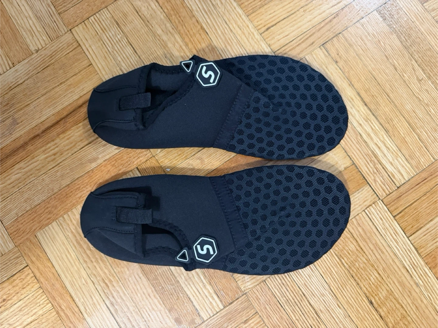 They're black with a size 40-41. The soles have a non-slip grip pattern. They're great for water sports or beach activities!