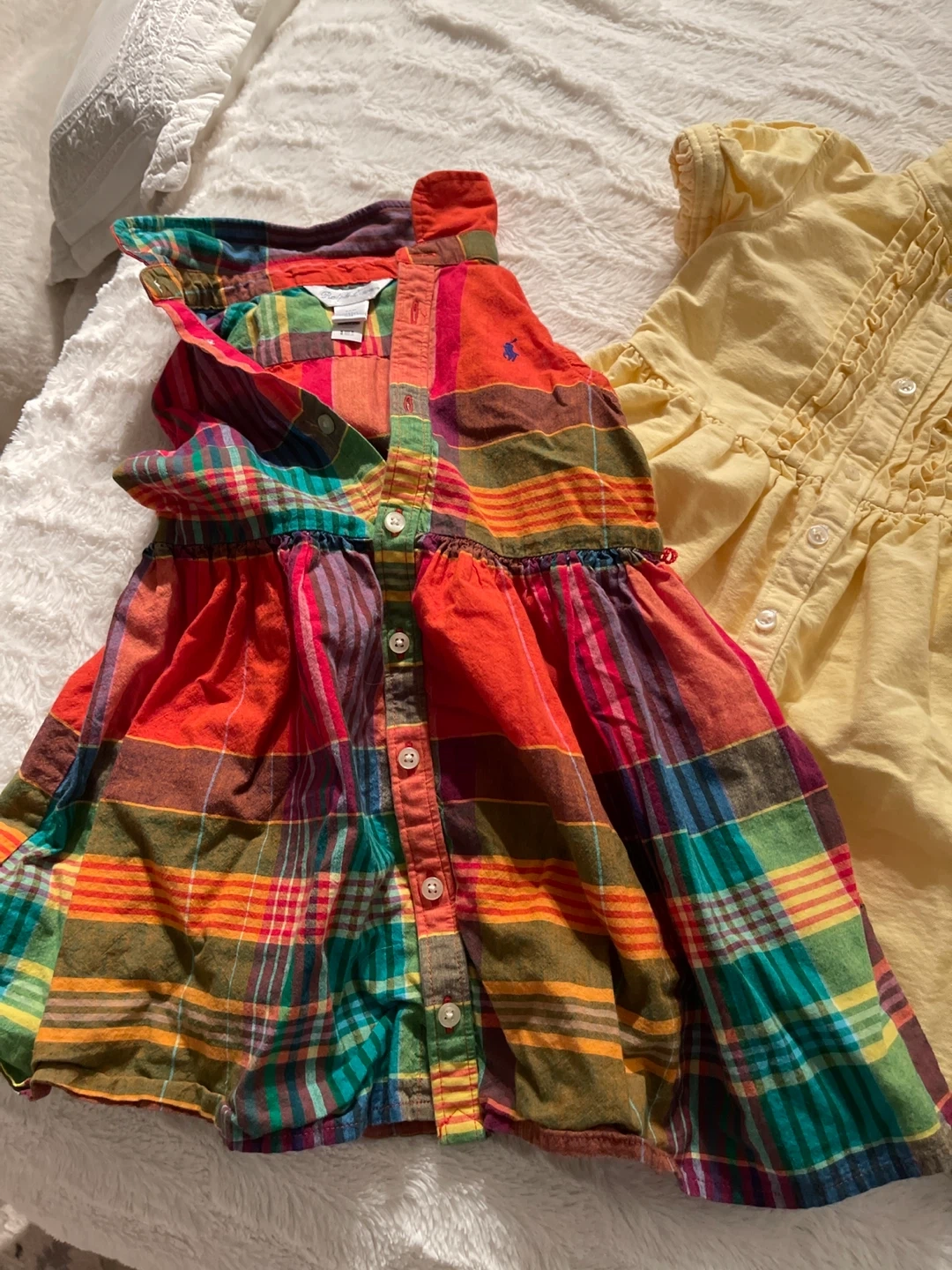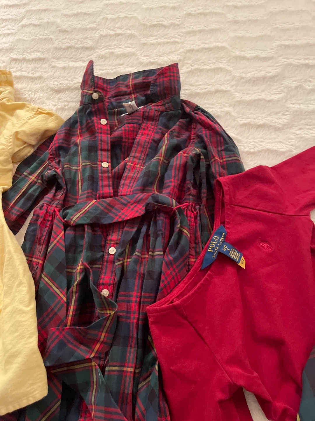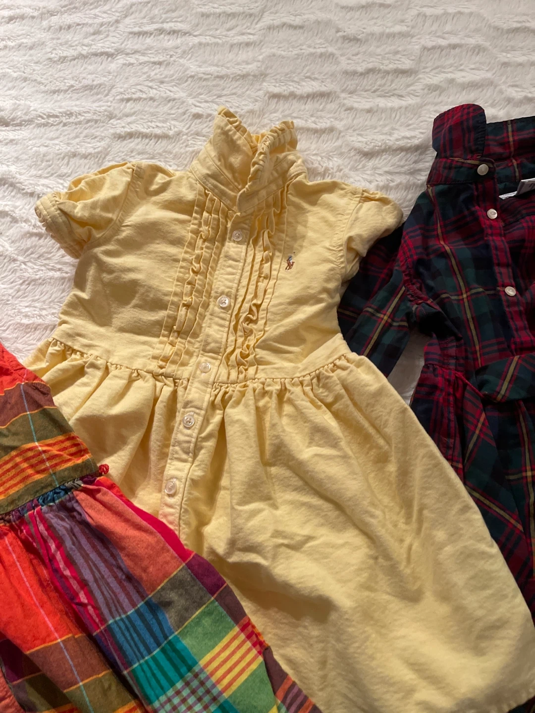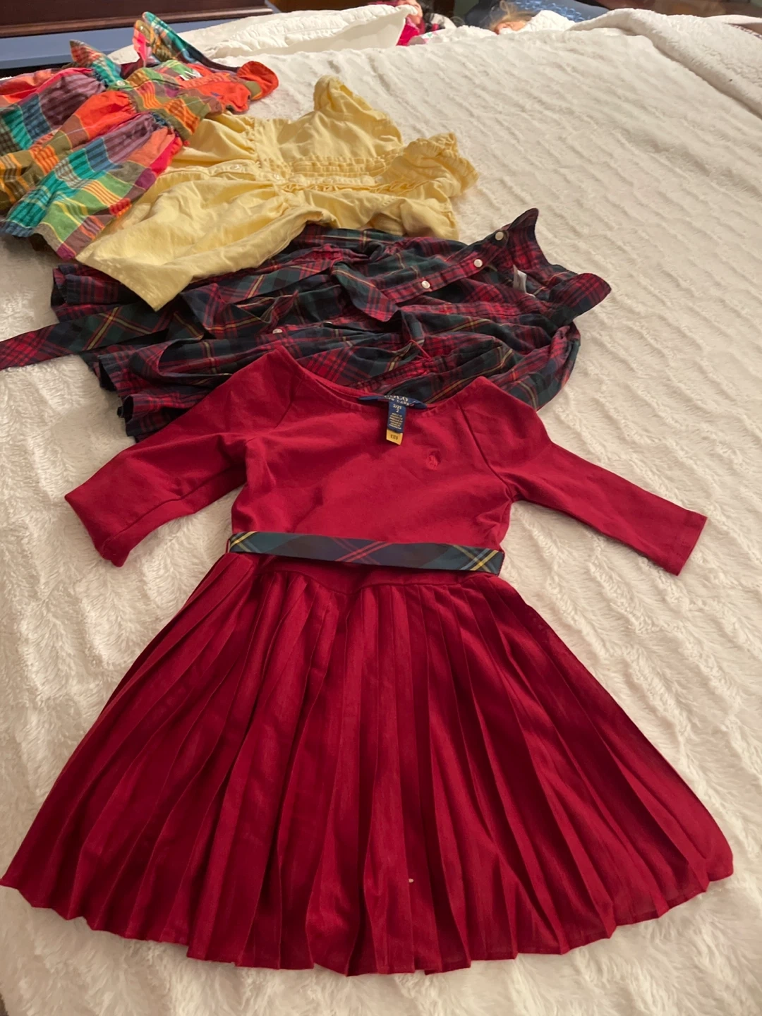 Selling a bundle of girl's dresses from Ralph Lauren! The bundle includes a red dress, a yellow dress, and two plaid dresses. All are in great condition!