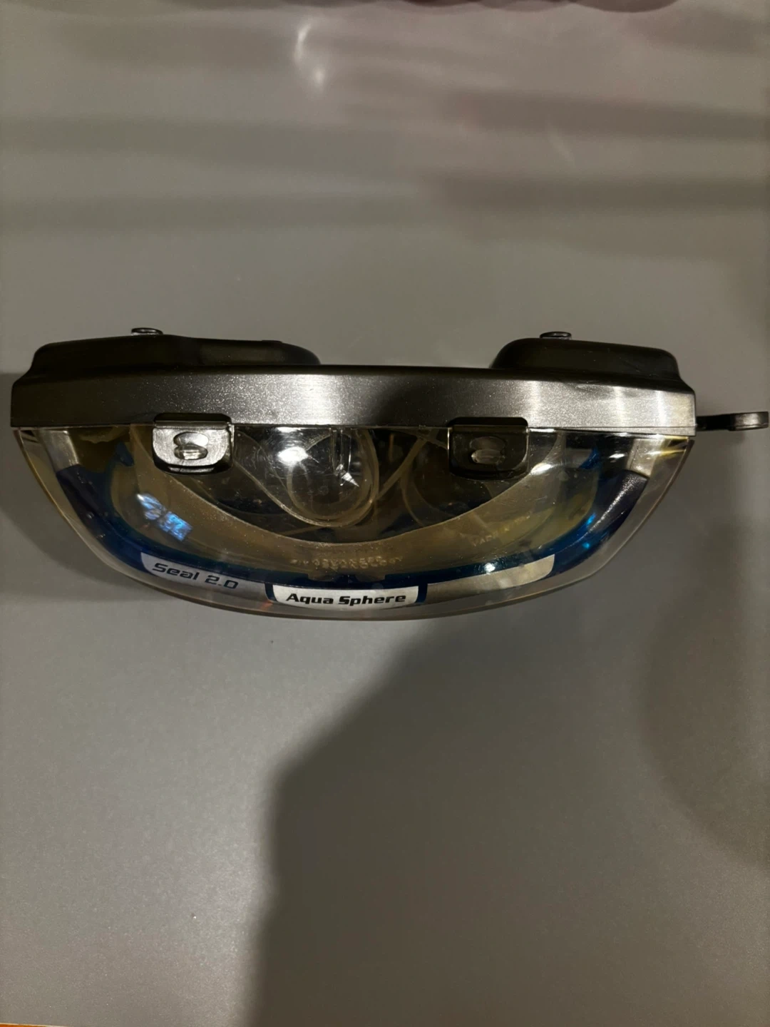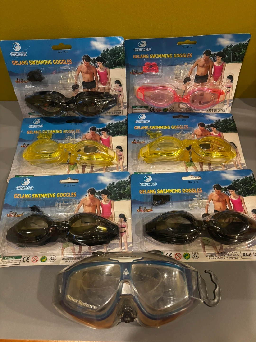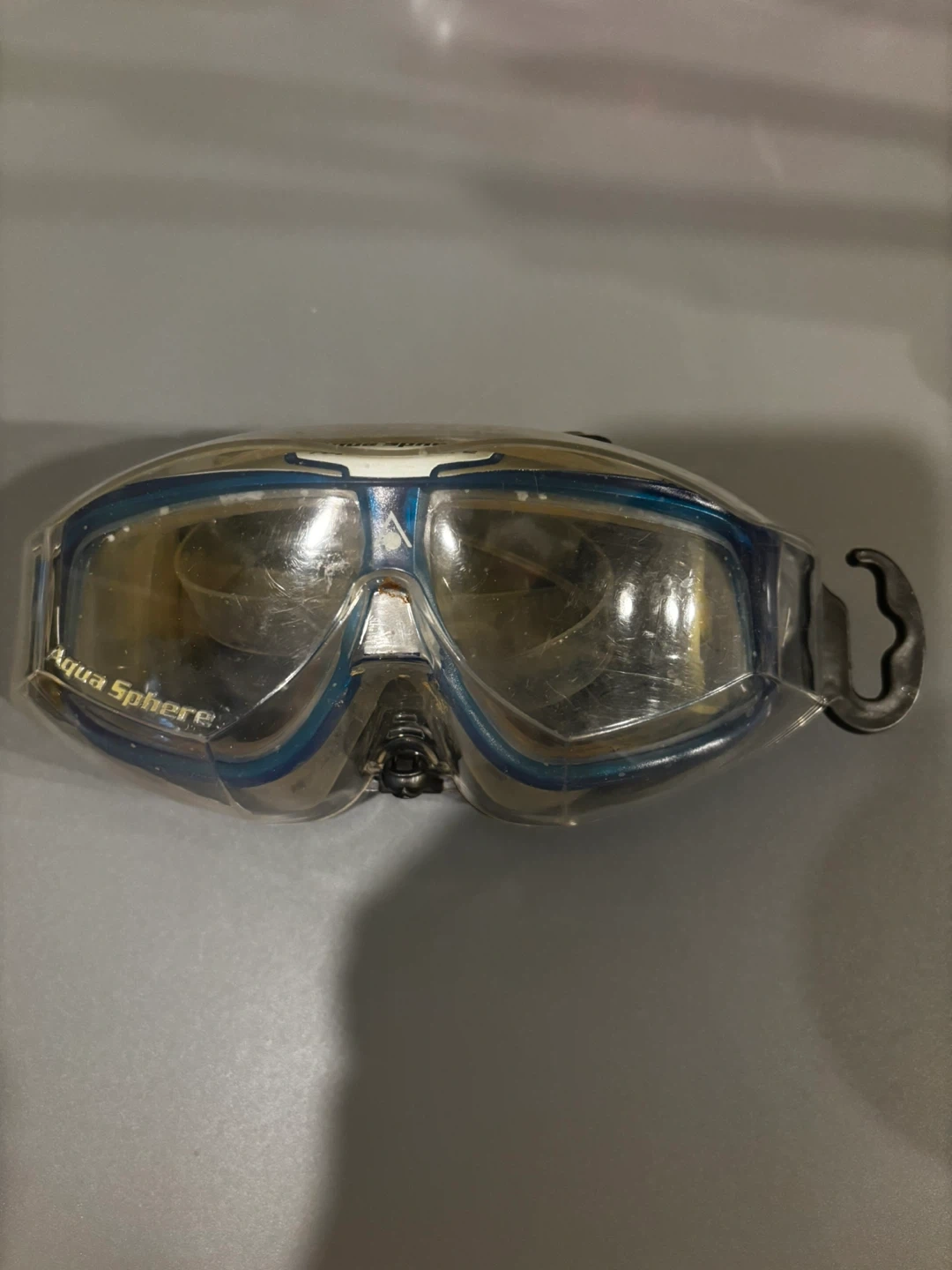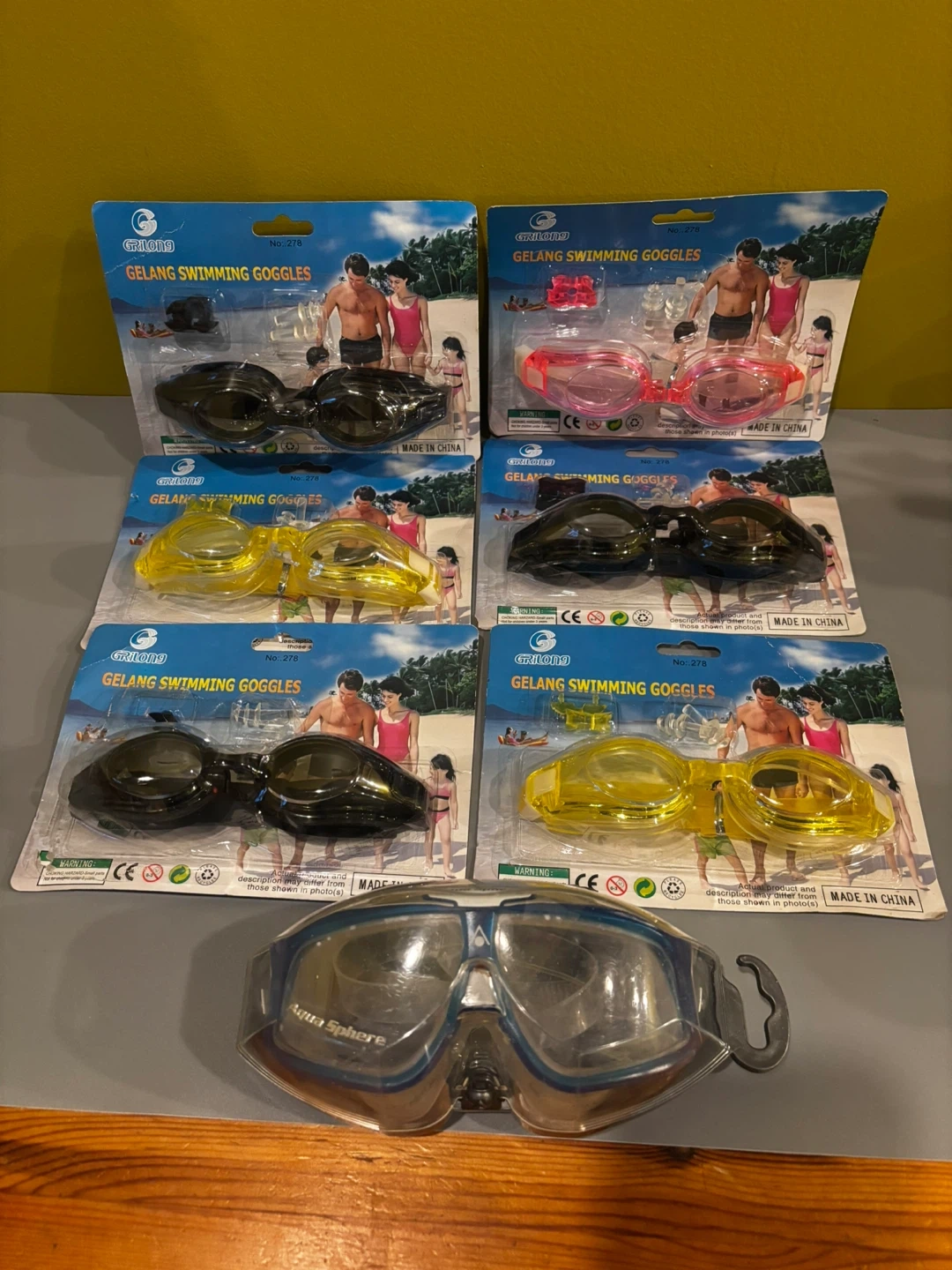 Aqua Sphere Seal 2.0 swim goggles. Clear lens with blue accents. Comfortable silicone skirt for a leak-free fit. $5 for all 7 items.