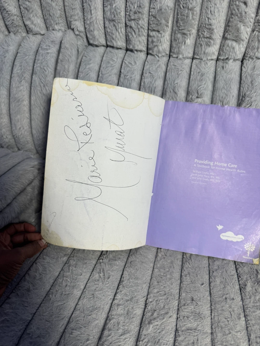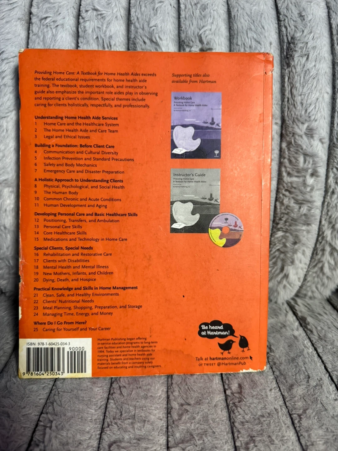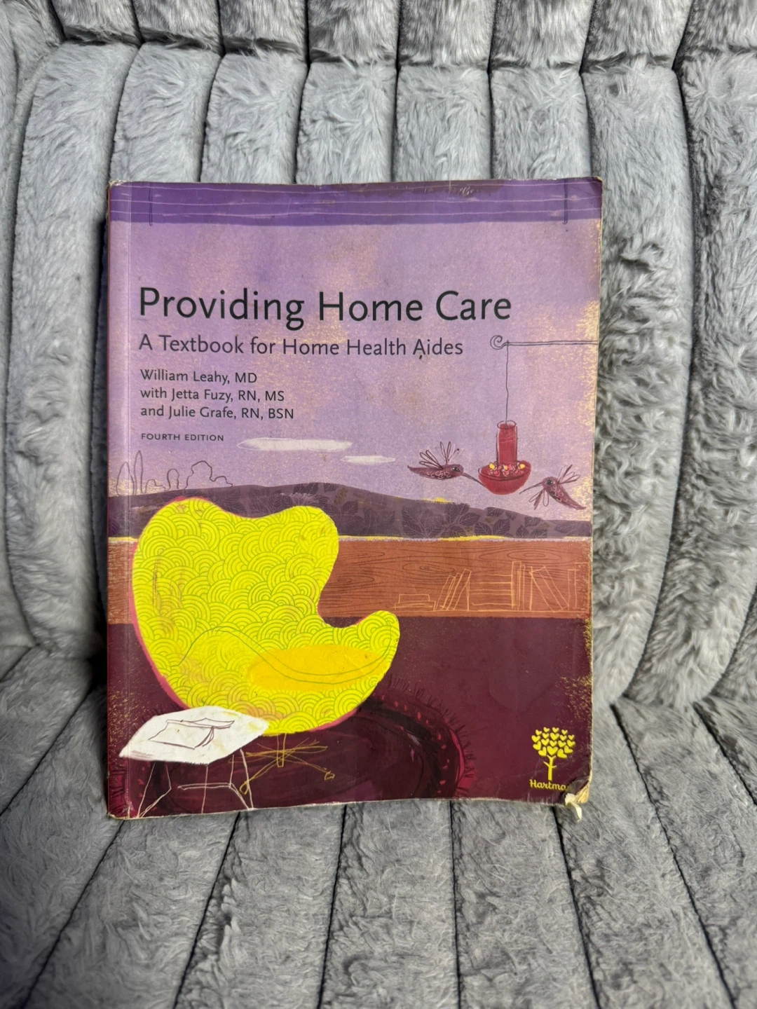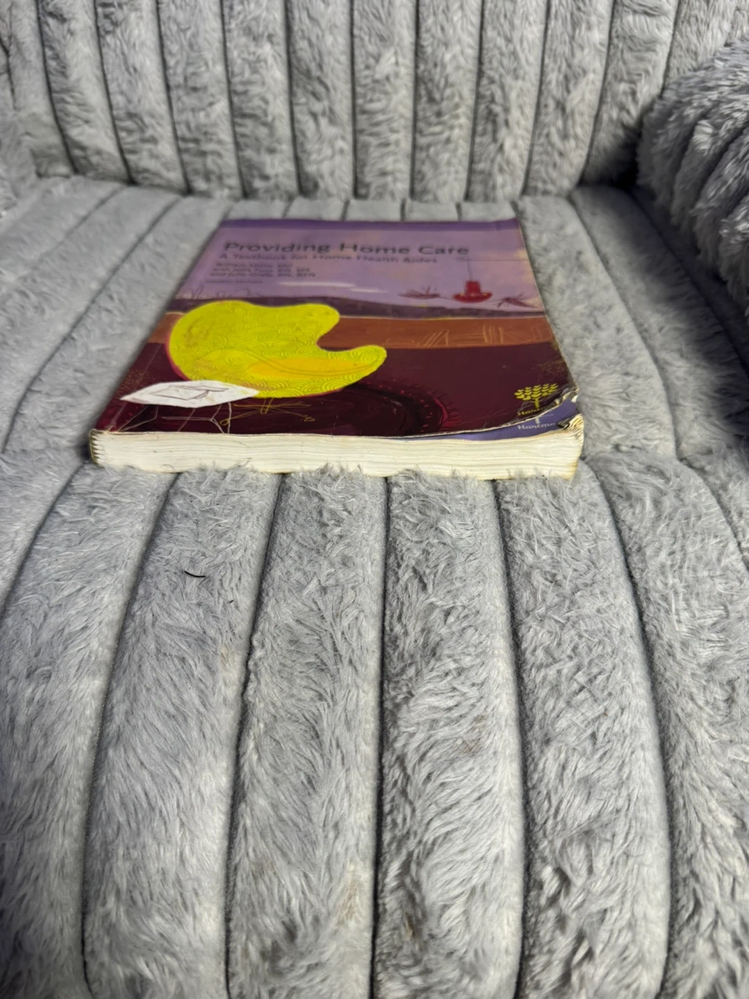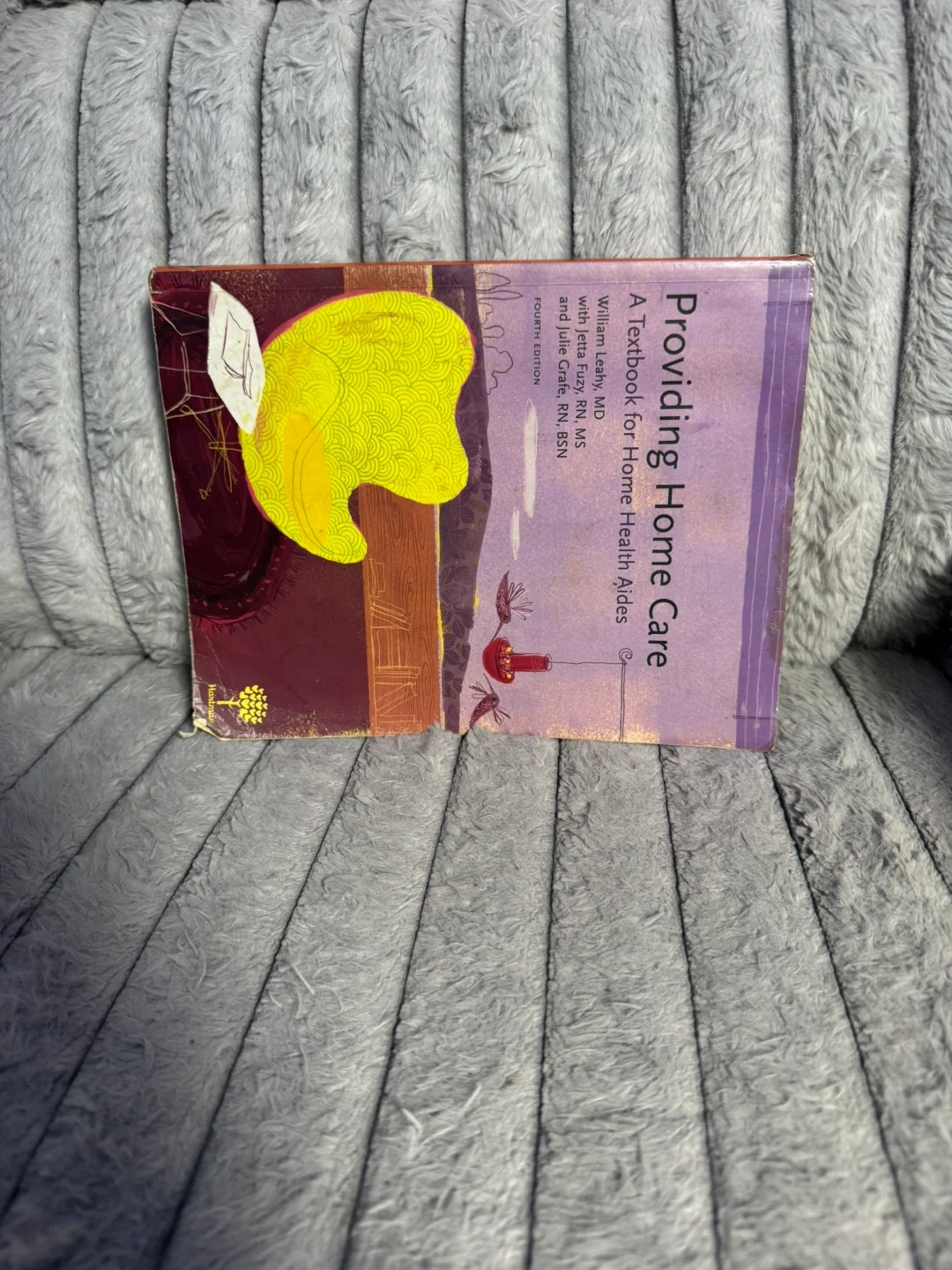This is the fourth edition of 'Providing Home Care: A Textbook for Home Health Aides.' It covers essential topics for home health aides, including understanding the home health care system, building a foundation before client care, and practical knowledge for skills in home management. Some pages show staining, as pictured.