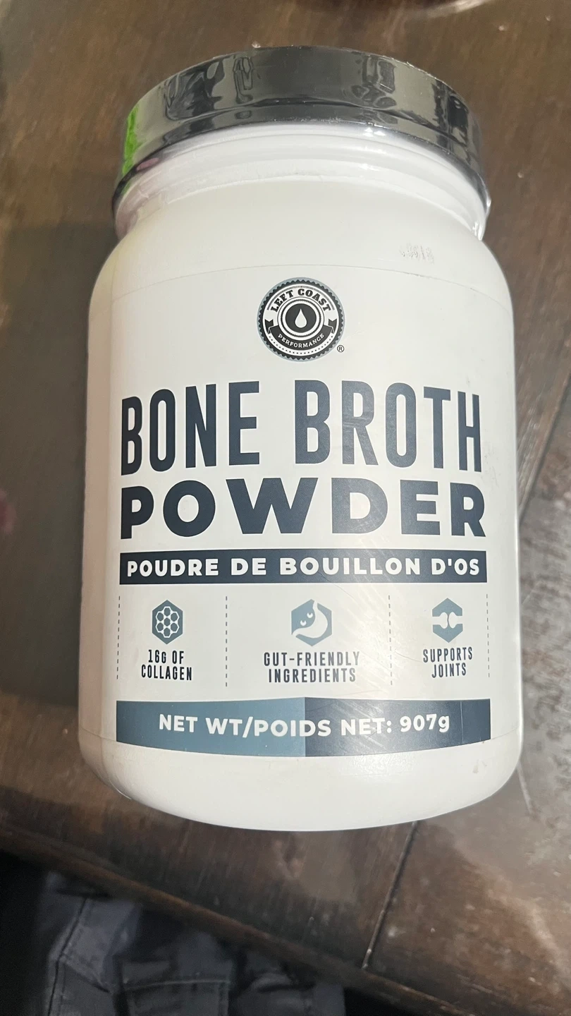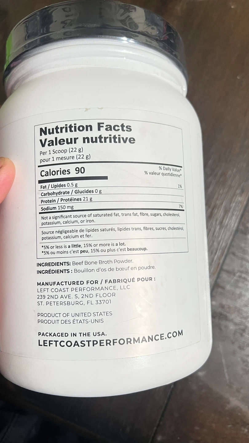 This is a tub of Left Coast Performance Bone Broth Powder. It contains 907g of powder. The ingredients are Beef Bone Broth Powder. Each scoop is 22g and contains 90 calories and 21g of protein.
